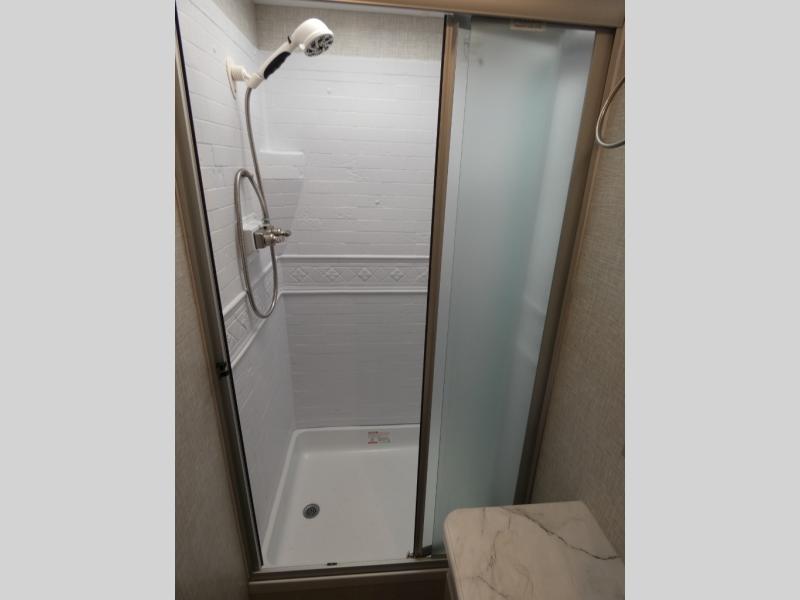 A bath and a half in this coach make it perfect for trips with friends and family. You will have tons of space provided by the two slide outs, plus a sleeping capacity of six to seven people each night. The expanding sofa bed has a great view of the 39" TV, and the Dream Dinette will be great for meals times and game night. Whip up a hearty meal on the three burner gas cooktop, or use the convenient over-the-range microwave oven. There is also a 12 cu. ft. residential refrigerator and a pantry for food storage. You'll be very pleased with the master bedroom that includes a king bed, a 32" TV, and a closet to keep your clothes wrinkle-free. There is even a second closet with stackable washer and dryer prep to make life on the road easier than ever.