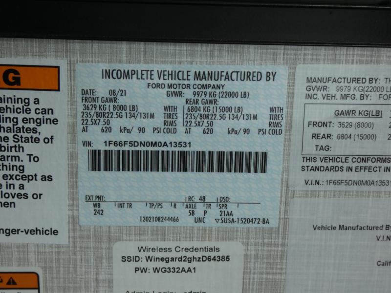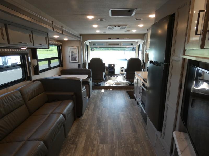With any Hurricane Class A gas motorhome by Thor Motor Coach you will appreciate solid construction materials, like the welded tubular steel floor and the Vacu-Bond laminated roof, walls, and floor with block foam insulation. Each model sits on a Ford F-53 chassis with a 7.3L Triton V8 engine for power you can feel, plus there is an 8,000 lb. trailer hitch with a 7-pin round connector to pull your car along. The Rapid Camp+ multiplex system with Bluetooth will allow you to easily set up camp from the convenient 7" touchscreen provided, and the Winegard ConnecT WiFi extender +4G will let you catch up on work if needed. The Hurricane includes pressed laminated countertops inside, as well as residential vinyl flooring, decorative glass and tile backsplash in the kitchen, and many more at-home comforts.