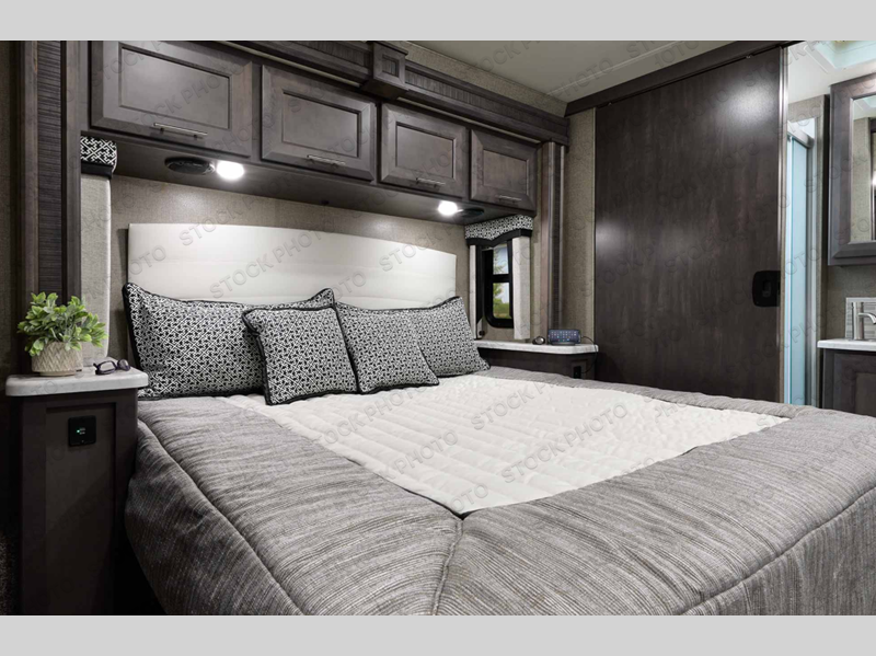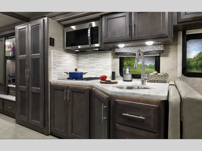 The first thing you'll notice about this Omni Super C diesel motorhome is the amount of interior living space it incorporates with its full-wall slide and second slide out in the bedroom! The other thing you'll notice is that this coach has loads of entertainment with its three TVs, and there is also great convenience with the full and half bathroom. Since the full bathroom is located back within the master suite, you'll be able to live in great luxury. You won't have to live alone, though, because the 59" x 80" bunk over the cab and the 70" Dream Dinette will provide extra sleeping space for anyone that you want to join you. Whoever gets the opportunity to sleep on the bunk above the cab will also enjoy using the powered sky view shade overhead.