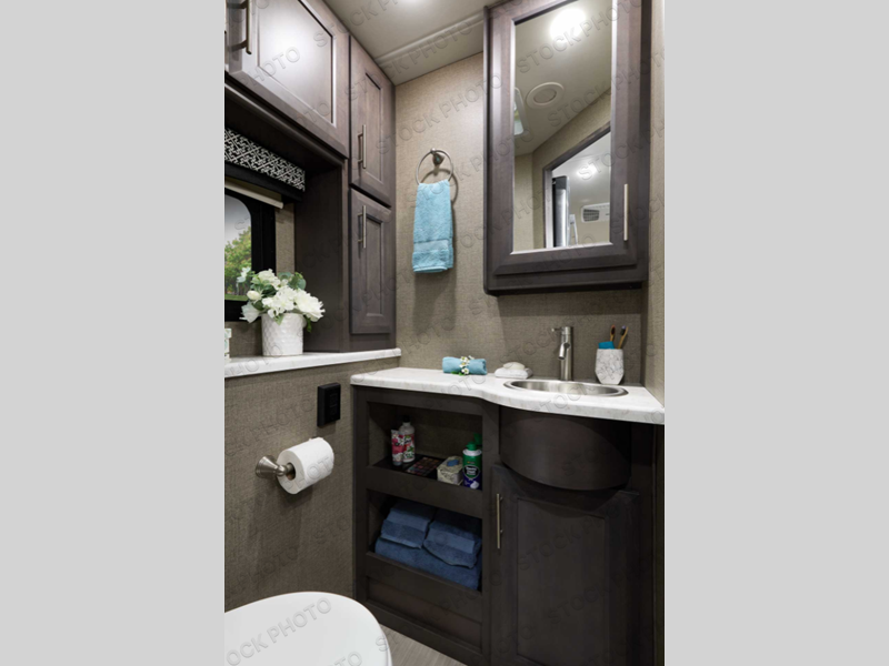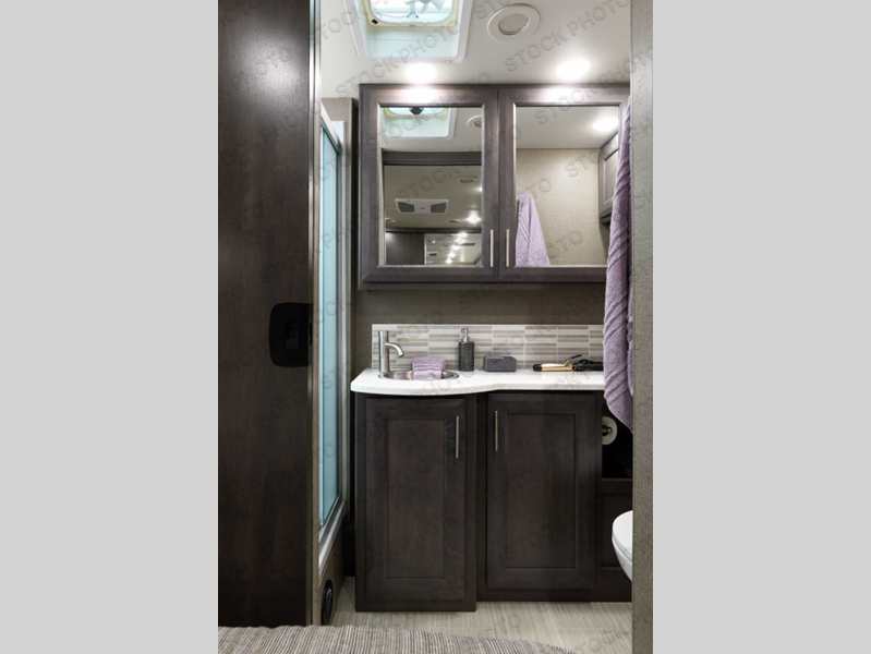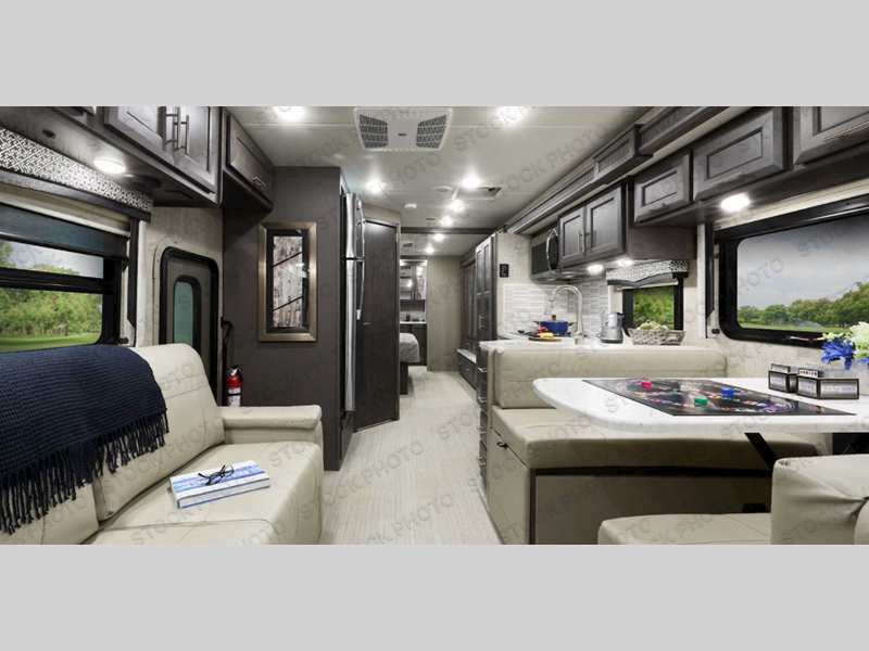 The Omni Super C diesel motorhome by Thor Motor Coach starts with a durable welded tubular steel floor, vacu-bond laminated roof, walls, and floors with block foam insulation, and a full-body paint package with gel-coat sidewalls. Each model includes either a F550 or F600 Power Stroke 4 x 4 Turbo Diesel engine that will allow you to maneuver tougher terrain when the adventure calls for it. The cockpit is every captain's dream with its power adjustable driver's seat, side view and back-up camera system, heated remote exterior mirrors, and more. You can control all of your coach's functions with the RapidCamp+ multiplex wiring control system, and the Winegard ConnecT Wi-Fi extender with 4G will allow you to say in touch with the outside world as you travel. Each model includes residential linoleum throughout, Leatherette furniture, solid surface countertops in the kitchen, and a glass shower door for that added touch of luxury. Come see all the other great features the Omni Super C diesel motorhome has to offer!