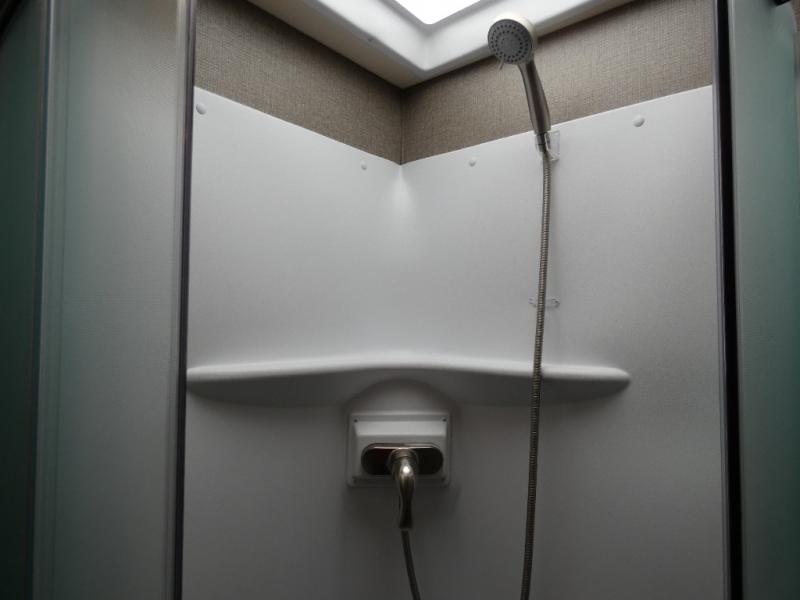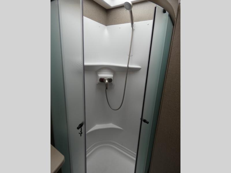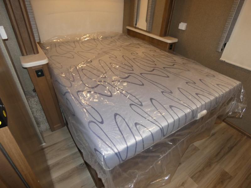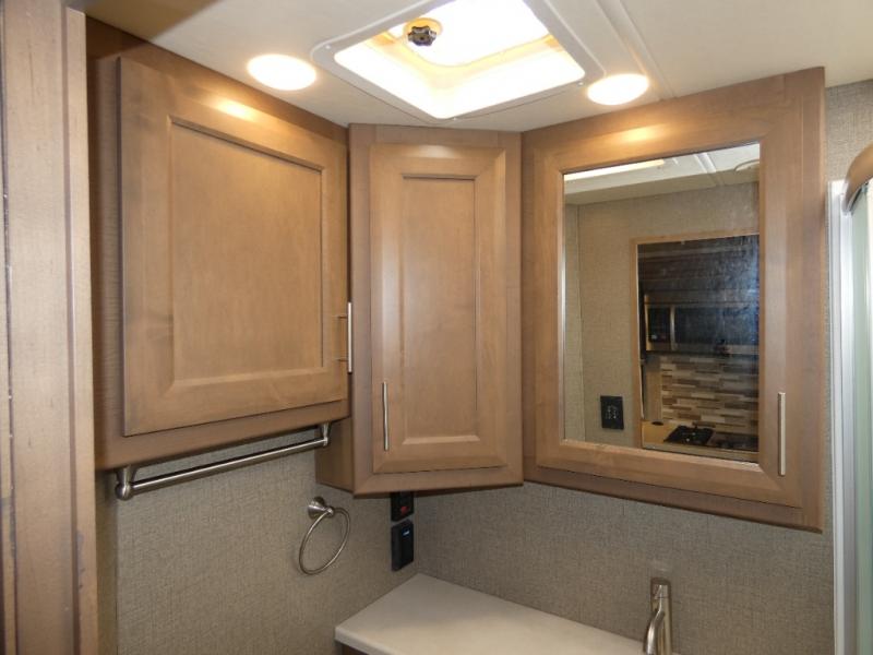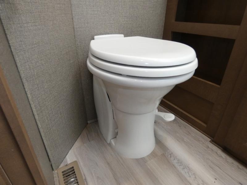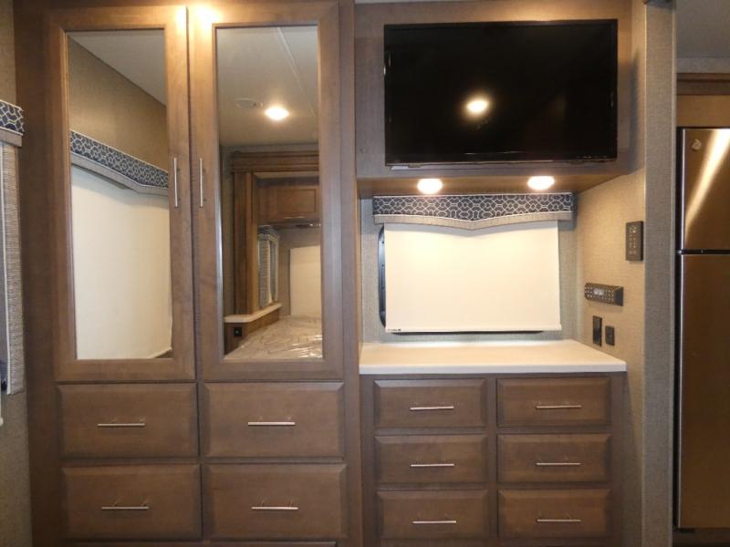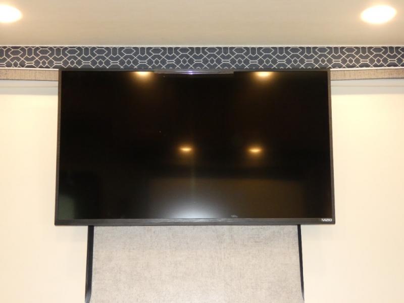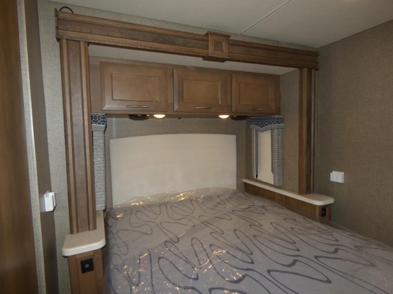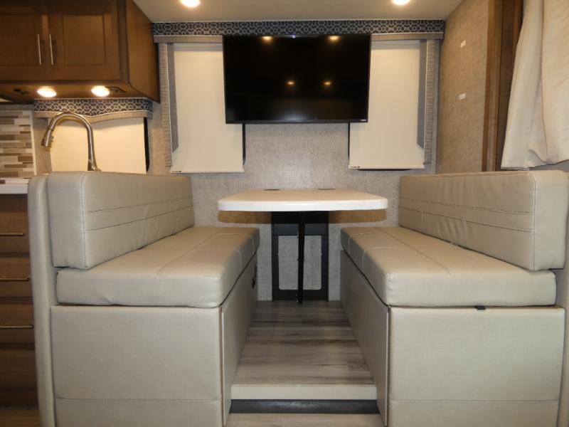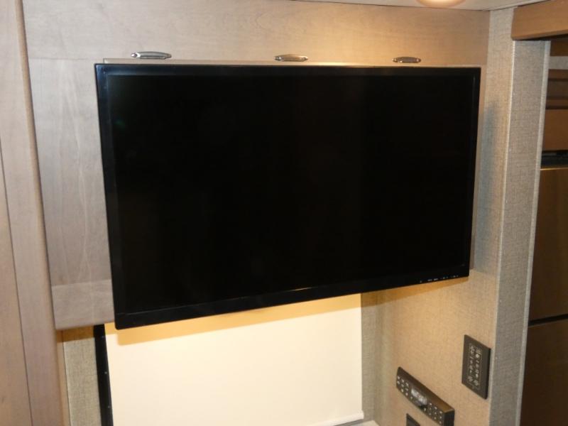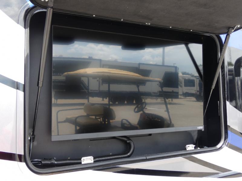 If you've been wanting to travel the country in style, now is the time with this motorhome that can sleep five people each night. The 39" living room TV is directly across from the theater seating for easy viewing, plus there is a 32" bedroom TV and an 32" exterior TV for all your entertainment needs. The Dream Dinette will be the perfect place to enjoy breakfast each morning as you plan out your day, or you may just want to sit at the picnic table under the 14' power awning. This model includes a mid-ship full bath with a shower skylight that will not only provide more natural light, but will give you more head room as you wash up. The rear private bedroom will feel just like home with its queen bed slide out, plus there is a wardrobe to keep your clothes tidy!