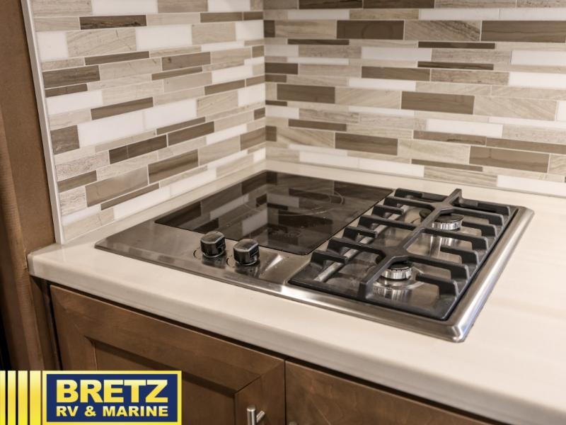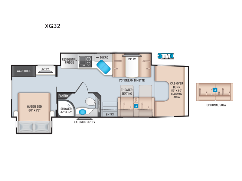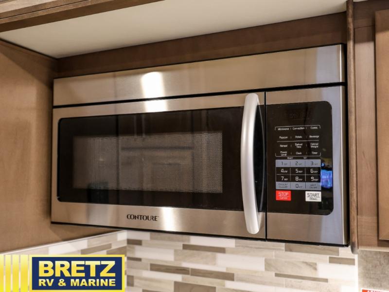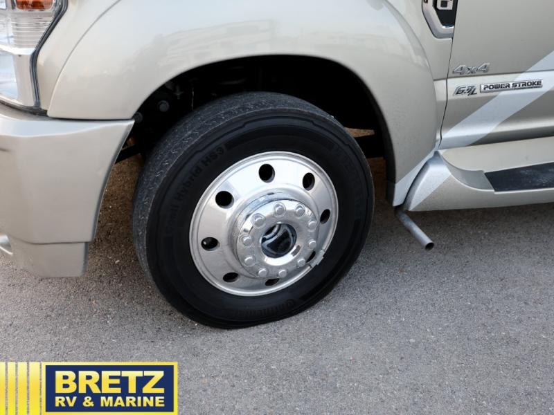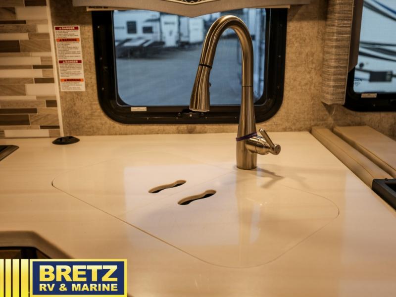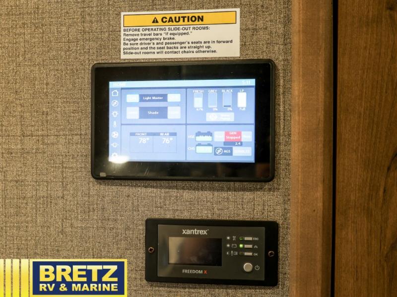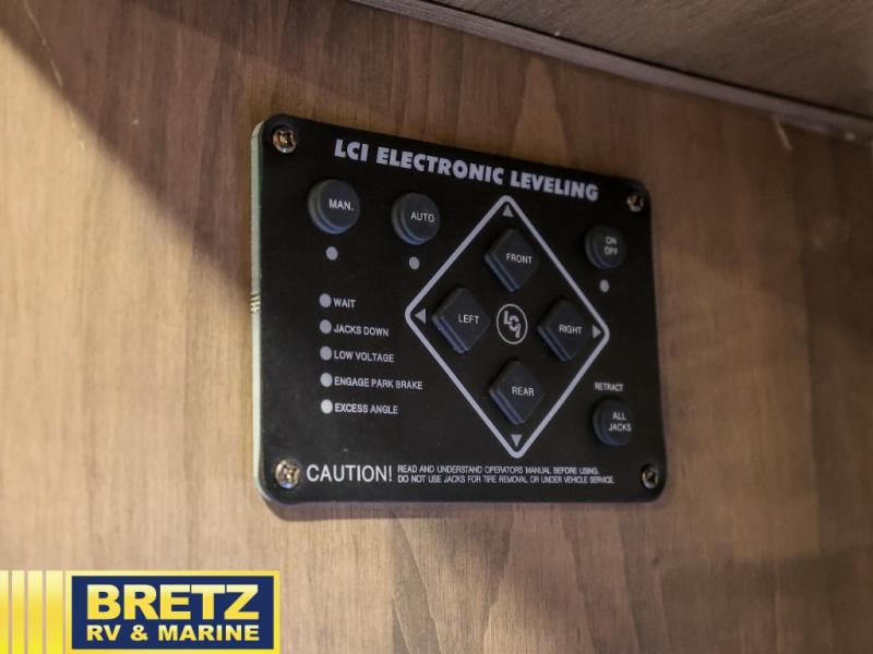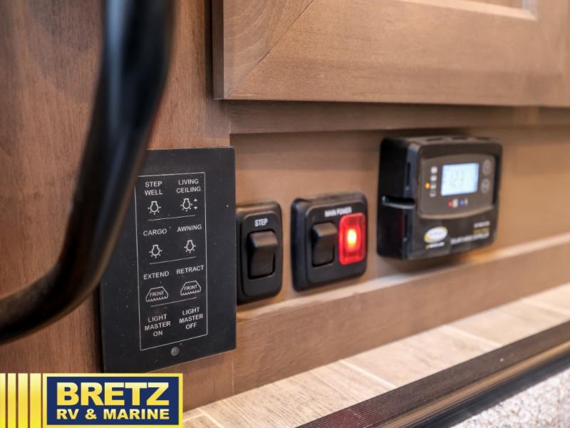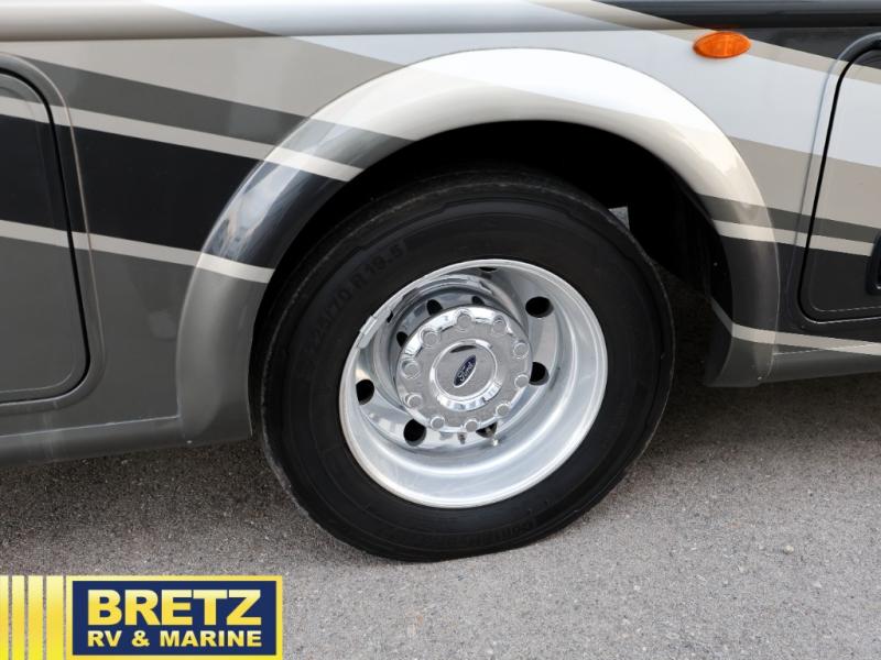 If you've been wanting to travel the country in style, now is the time with this motorhome that can sleep five people each night. The 39" living room TV is directly across from the theater seating for easy viewing, plus there is a 32" bedroom TV and an 32" exterior TV for all your entertainment needs. The Dream Dinette will be the perfect place to enjoy breakfast each morning as you plan out your day, or you may just want to sit at the picnic table under the 14' power awning. This model includes a mid-ship full bath with a shower skylight that will not only provide more natural light, but will give you more head room as you wash up. The rear private bedroom will feel just like home with its queen bed slide out, plus there is a wardrobe to keep your clothes tidy!