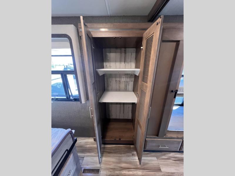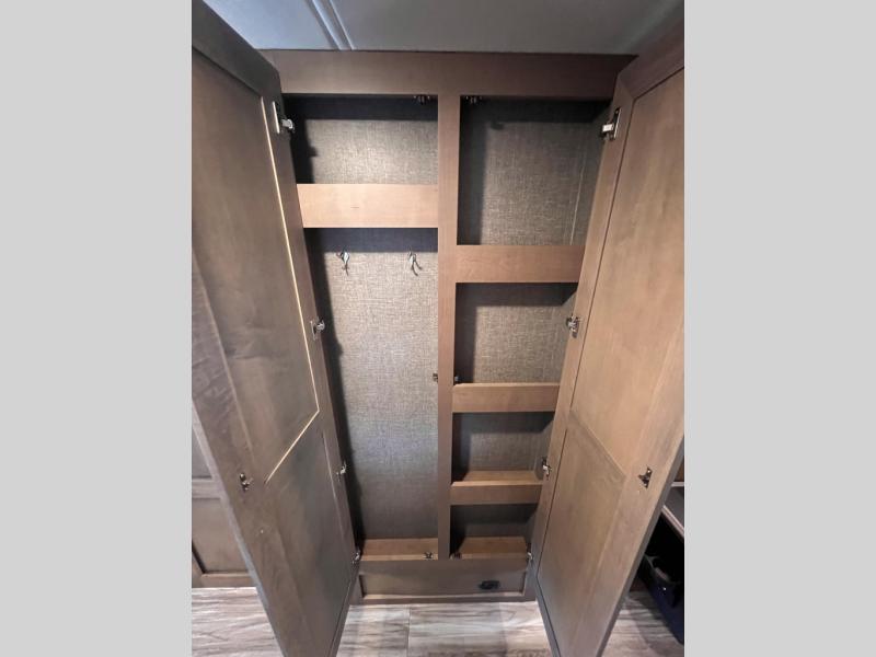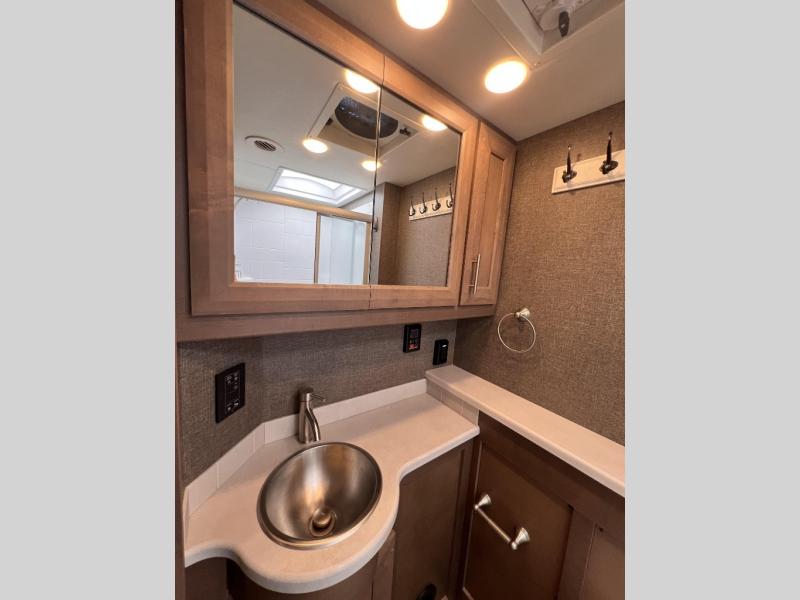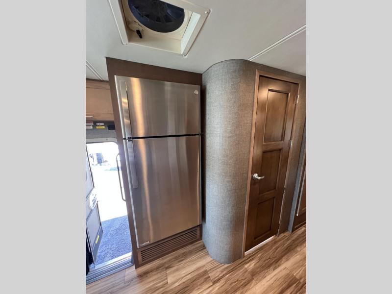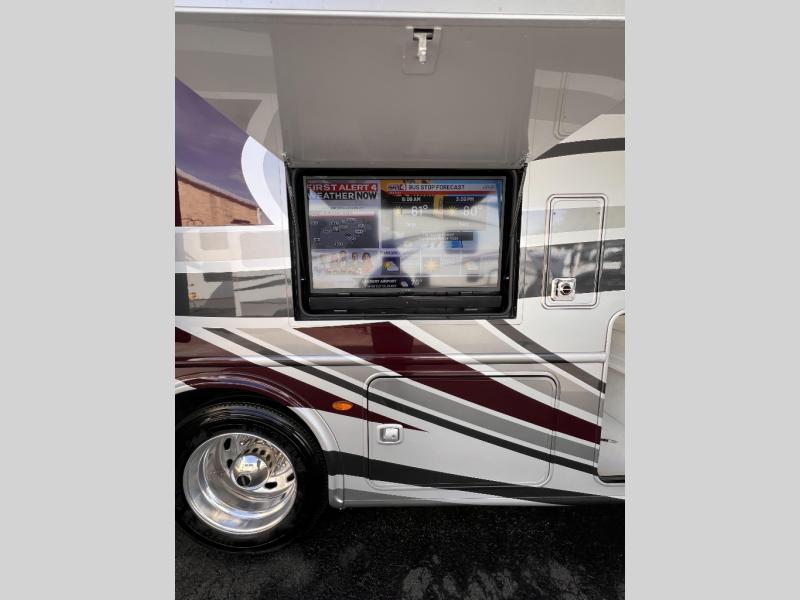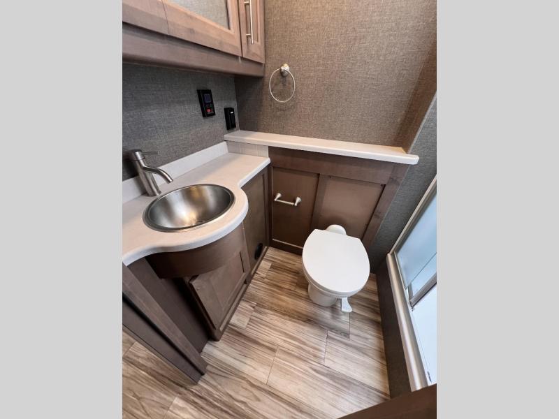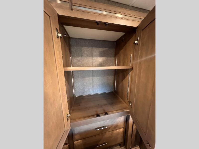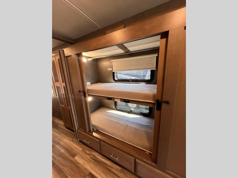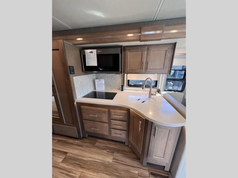 You will enjoy every minute spent in this luxurious coach that can sleep nine people each night. The overhead bunk will be perfect for the little ones, plus there are bunk beds right across from the full bath for convenience. The bunk beds include a tablet holder and USB ports, or you can convert the bunks to a wardrobe if you're not needing the extra sleeping space. This Palazzo kitchen includes everything you need to prepare home cooked meals, including an electric induction cooktop, an over-the-range convection microwave, plus a residential refrigerator for perishables. The rear private bedroom will be a place you'll love retreating to each night. Here, you'll find a Tilt-A-View inclining queen bed, a large closet, plus a 32" LED TV to watch movies in bed. There is even a stacked washer and dryer that will make going full-time easier than ever!