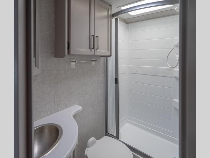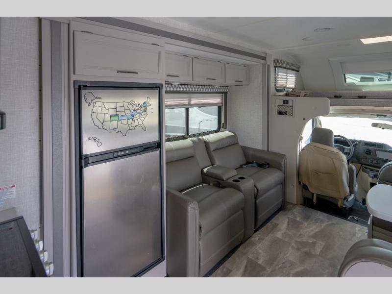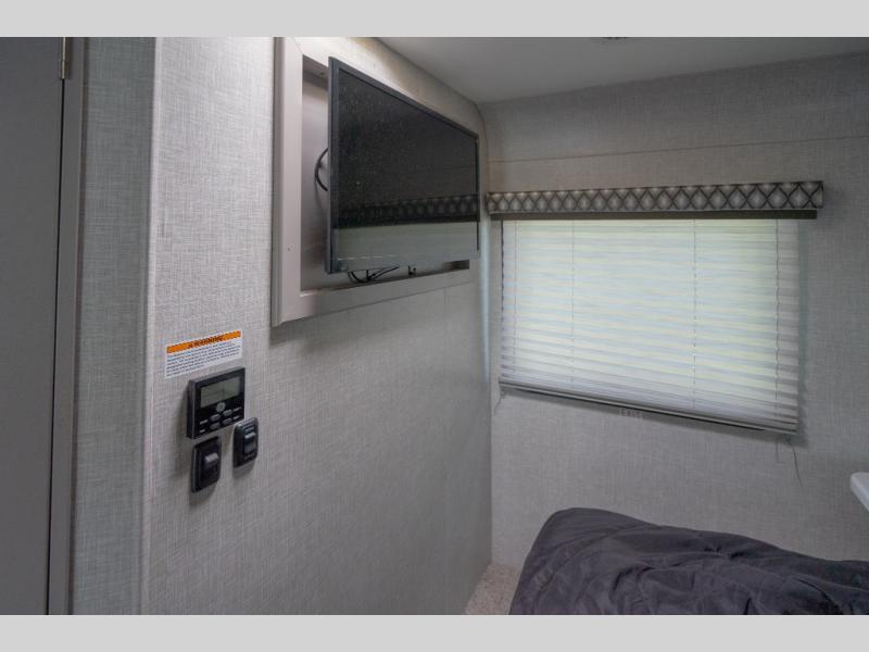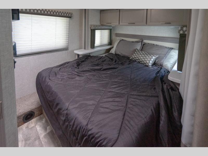 Travel to see family across the country with all the comforts of home where ever you decide to setup for the night! The jack-knife sofa and Dream dinette offer seating for traveling and dining as well as watching the 39" TV, and the furniture doubles as extra sleeping space along with the cab-over bunk. You will have your own queen bed in the rear corner semi-private bedroom when you use the privacy curtain, and a private suite when you close the door which gives you a bedroom and bathroom all to yourself. Everyone's electronics will stay charged and connected with the USB power charging center in the bedroom, the wireless phone charger with USB plug on the dinette table top, and the Winegard ConnecT 2.0 WiFi. You will love the kitchen accent countertop lights and the handy waste basket, and there are options to choose from such as a Chevy chassis option, and/or adding an exterior 32" TV.