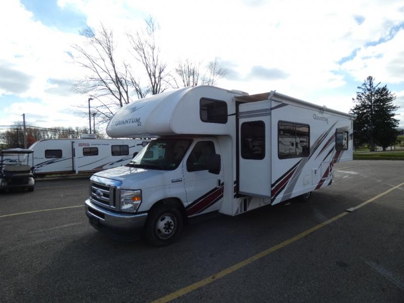 Each Quantum SE is constructed atop a Ford E-Series chassis and powered by a 7.3L V8 350 HP engine. A one piece fiberglass front cap and exterior, including a graphics package, provides a stylish appearance that is easy to maintain for years of family travel. You will also love the keyless entry and dash applique', plus the drop down stairwell entrance step with accent light which is a great feature after dark. Plenty of seatbelts for your rear travelers in all rear seating positions will keep your passengers safe as you head to each new adventure destination. Each unit provides a MEGA-Storage compartment with a portable table included in model SE28. Each roto-cast storage space is lighted so you can easily find what you need even after dark. The on-board Onan RV QC 4000 gas generator and solar prep make going off-grid for awhile easy. Why not make one of these Quantum SE models your new traveling home-on-wheels.