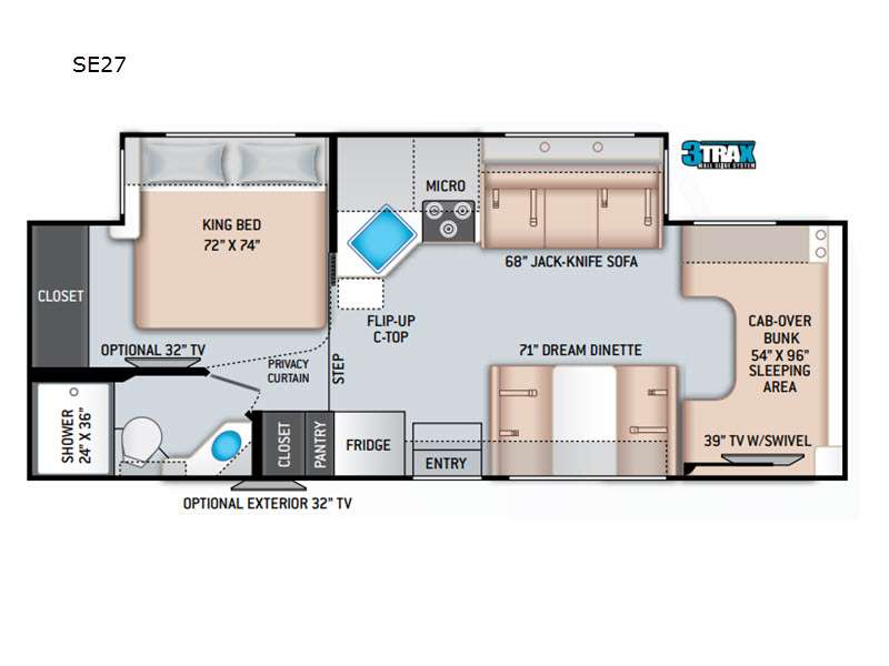 Imagine all the places you will go once you bring home your new traveling home on wheels! The 3TRAX full-wall slide will provide your family amazing space inside to enjoy once parked. It opens up the living space where you will easily enjoy cooking, dining, and a bit of entertainment when indoors. A 68" jack-knife sofa and 71" Dream Dinette offer ample seating and provide four sets of seatbelts for safety while traveling. Play board games or cards after dinner, or watch your favorite television programs with the 39" TV found up in the cab-over bunk area on a manual swivel for convenience to angle it for multiple location viewing. There is also ample space for cooking with the full slide opened up allowing you easy access to a three-burner range, microwave oven, and large kitchen sink. There is even a flip-up countertop for added space. A cozy semi-private sleeping space in back offers a king-size bed for comfort and room to stretch out, plus you will find a nice size closet for your things.
