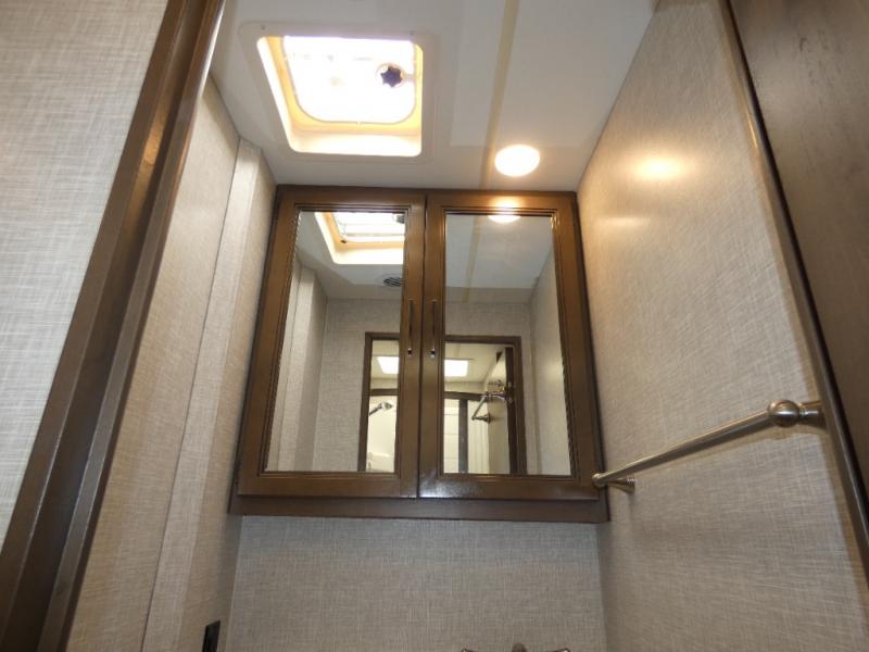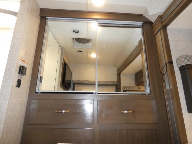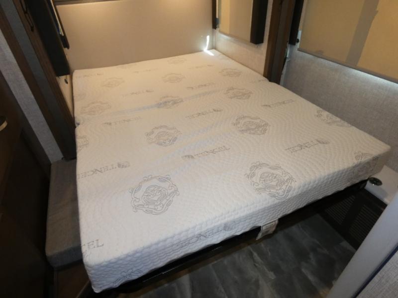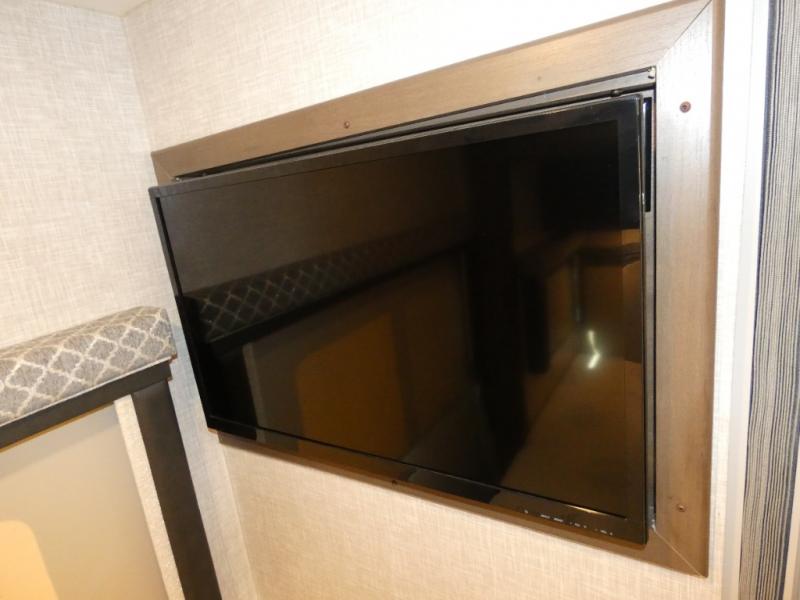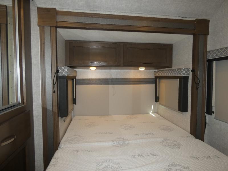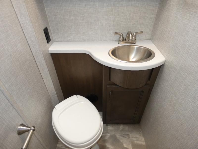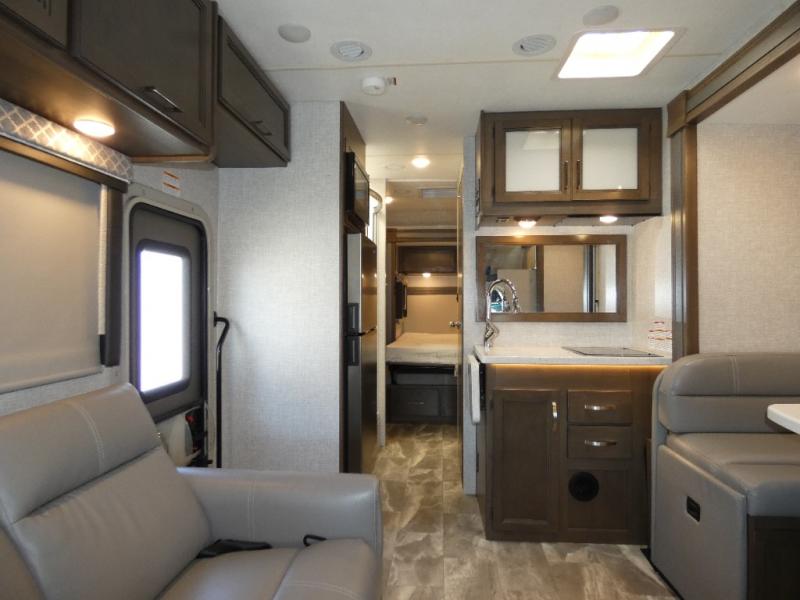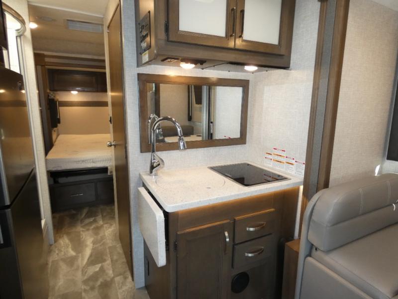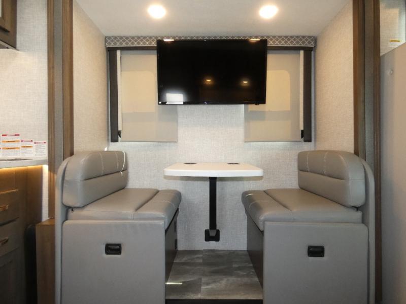It won't take long to feel right at home in this cozy motorhome. Once you arrive at your destination, you can swivel your captain's seats around to the living area, and enjoy a cold drink with the removable cockpit table. There is also theater seating with footrests and a 39" TV in perfect view so you can watch your favorite movies. The chef of your group can prepare lunch on the two burner gas cooktop, while someone else is preparing a fresh salad on the flip-up countertop. This model includes a booth dinette to dine at each day, or you can take your plate outdoors to sit under the 14' power awning. The private toilet and sink with the shower across the hall allow two people to fresh up at once, and this model includes a rear bedroom you are sure to love. Here, you can rest soundly on the full-size bed, watch a late-night movie on 32" bedroom TV, and store your clothes in the large closet!