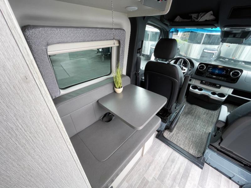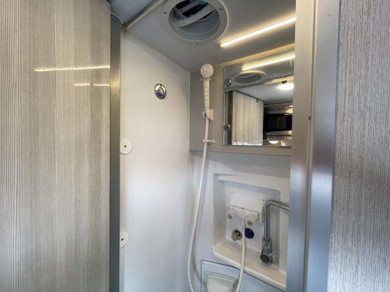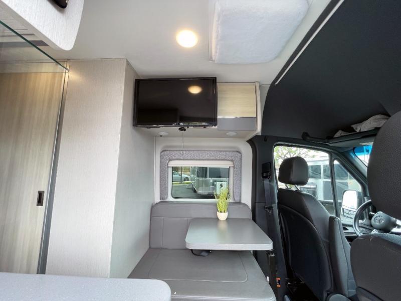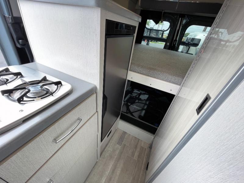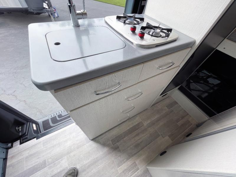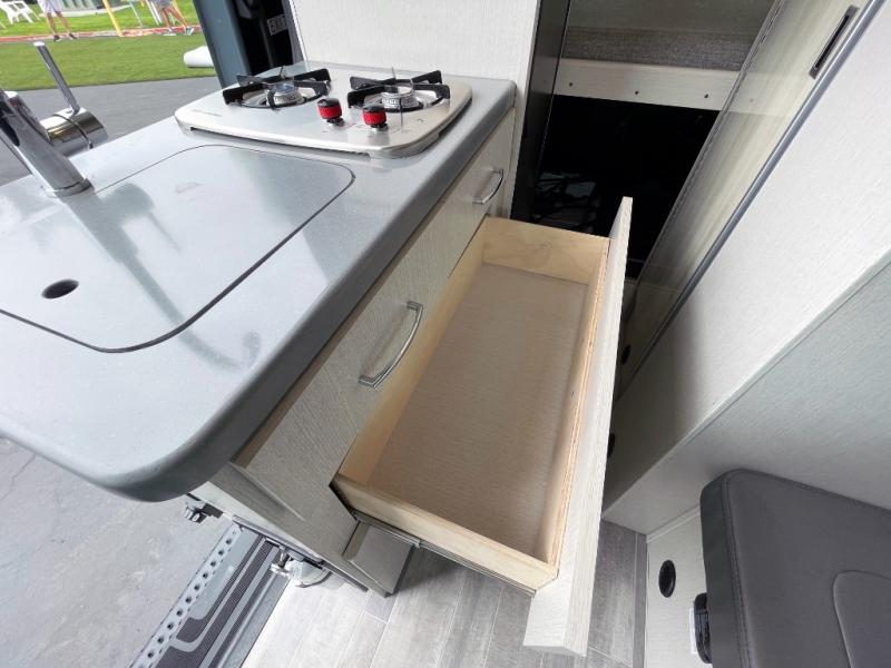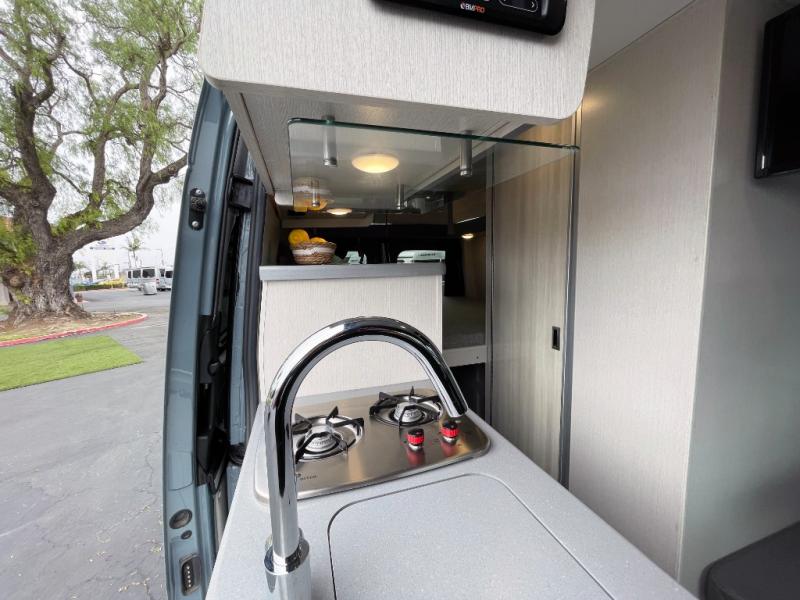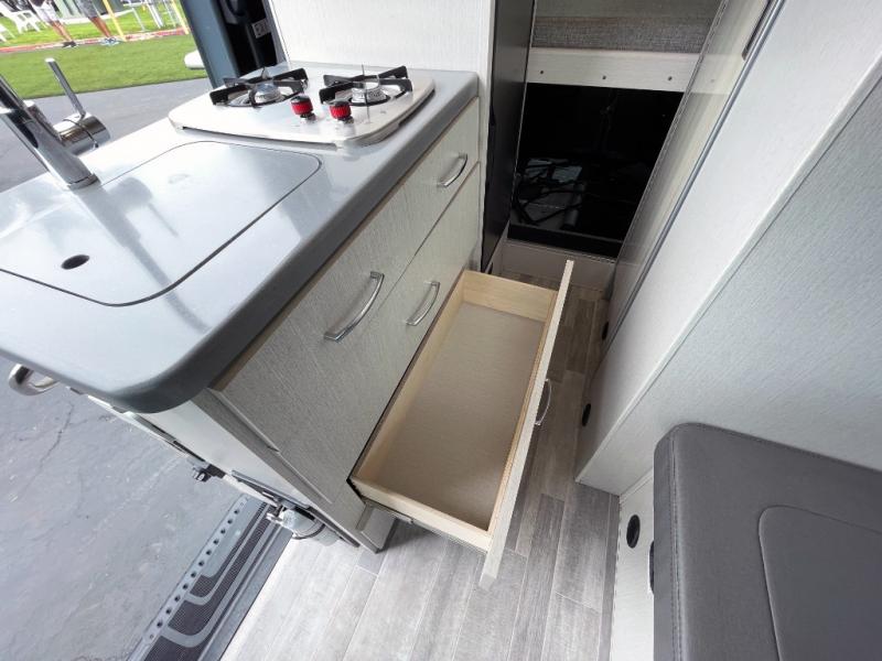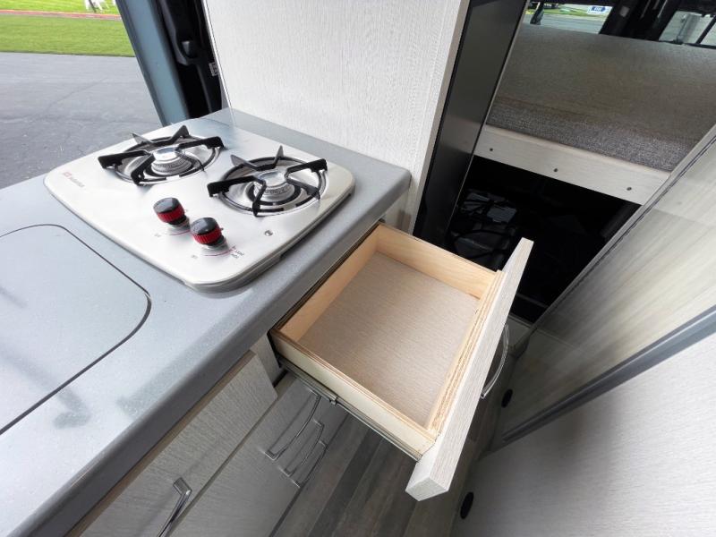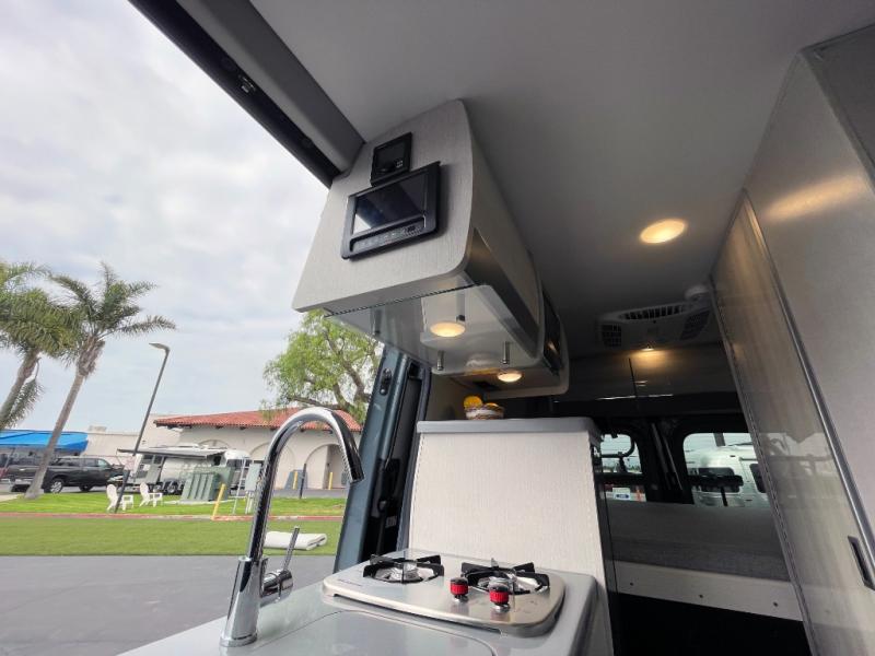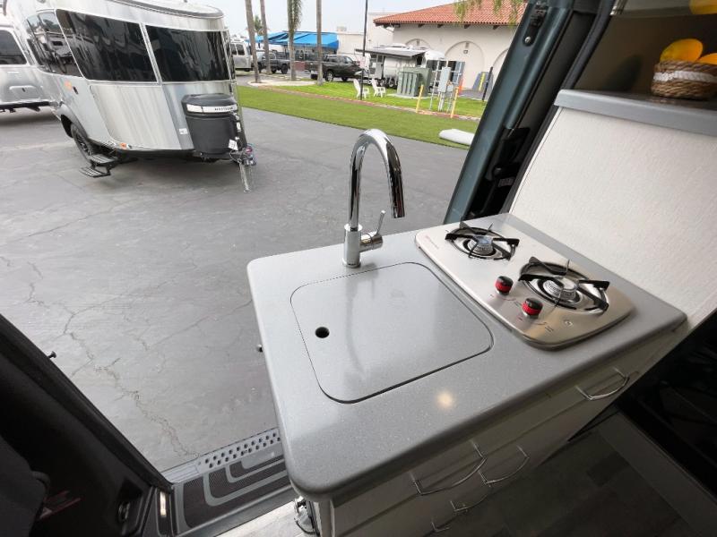 When you love to explore without sacrificing luxuries such as having your own 51" x 74" bed at night, this camper van will be perfect for two! The captain's chairs swivel offer more seating space to utilize the removable table in front of the side seat, and to watch the 24" TV once at your destination. The kitchen amenities include a single door, electric refrigerator, a dual burner gas cooktop and a microwave oven, plus a solid surface countertop and stainless steel single bowl sink allowing you to make meals while away. You can eat inside or outside using the fold-out exterior table. And if you are not staying the night, the seatbelts on the side seat offers space for passengers. There are many more standard features and a few options to choose from, start exploring today!