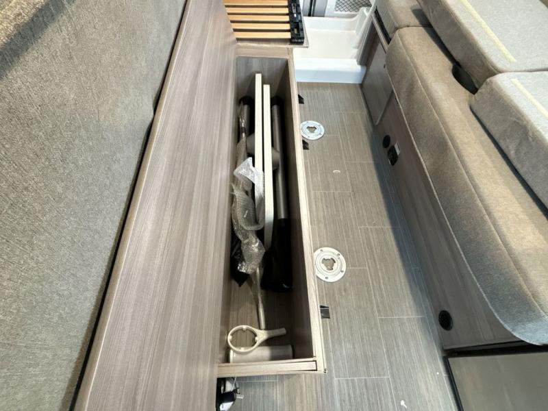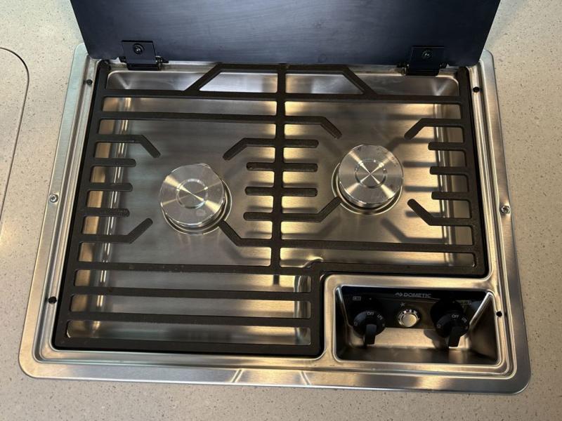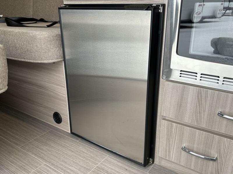 Travel the country with your favorite person in this motorhome! You can freshen up after a long day of traveling in the rear enclosed wet bath with a power vent fan to eliminate unwanted steam and a wardrobe with drawers to store your clothes and towels. Enjoy a good night's rest on the 74" x 80" expanding sleeper sofa once converted with removable tables in between them to eat your meals. The kitchen not only has a gas two burner cooktop, single door stainless refrigerator, and convection microwave, but also a pull-out cutting board and flip-up countertop. There are even large opening side windows to let in some fresh air and natural lighting!