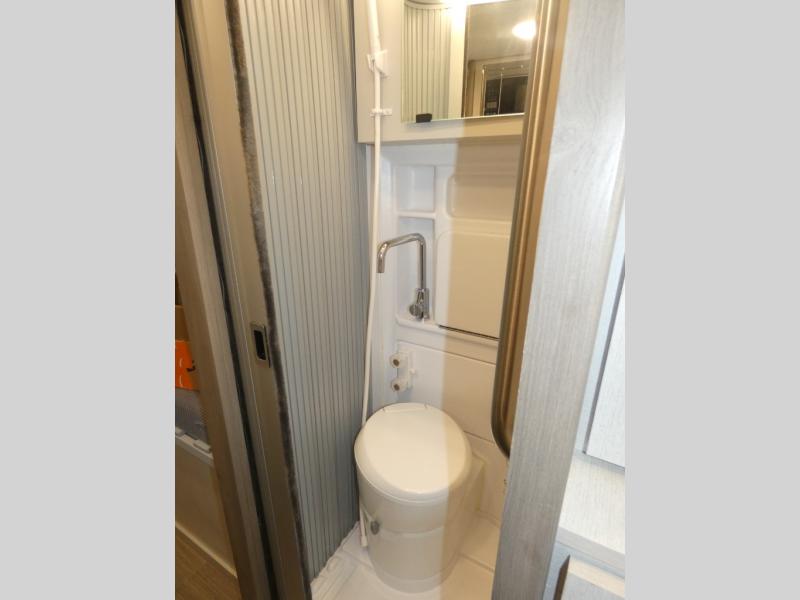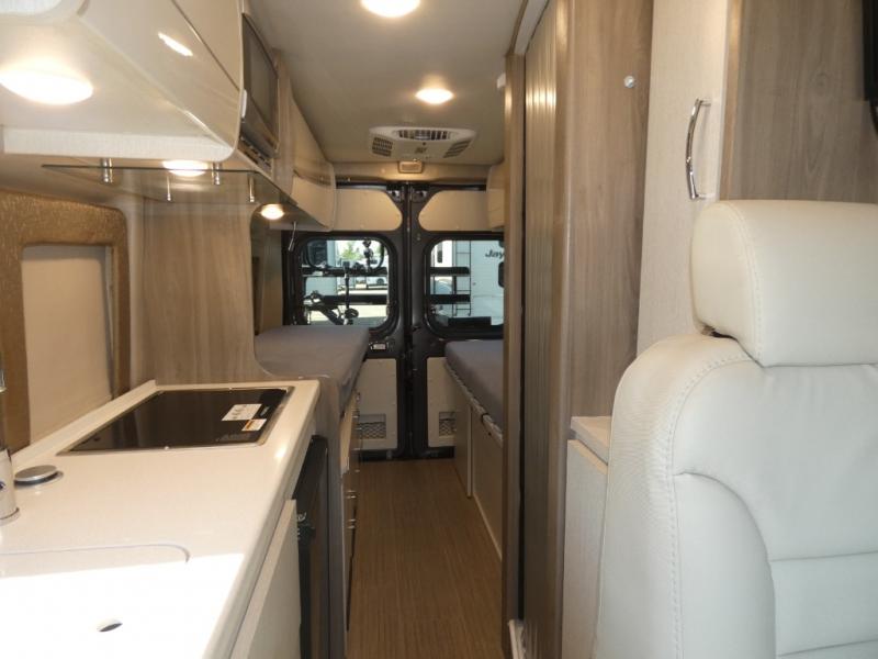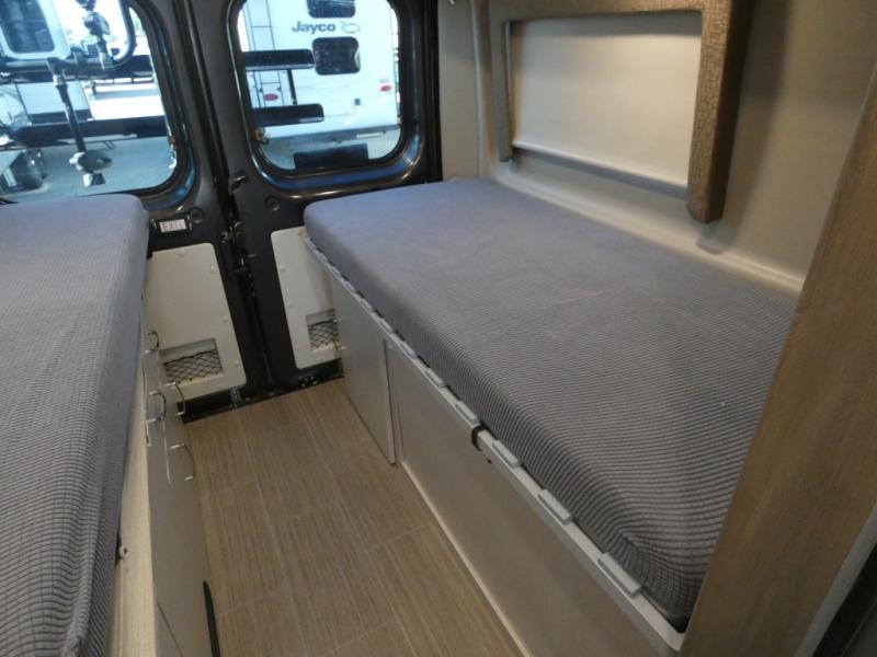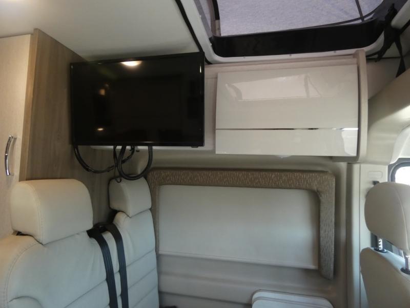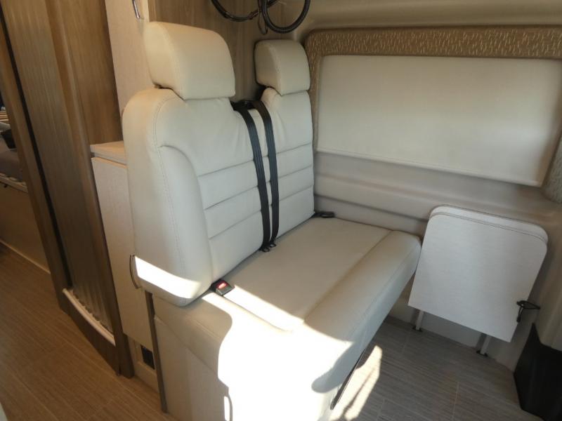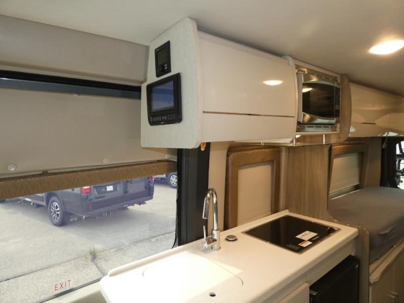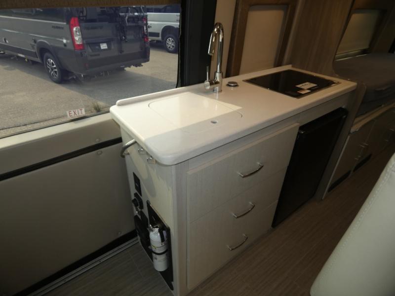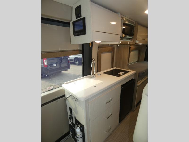 If you are interested in going off-grid, you'll need a trusty companion like this Tellaro Class B gas motorhome! There are two three-point seat belts at the collapsible dinette table, and when you combine those with the two swivel cab seats, you have the ability to transport four people across town. Right next to the dinette is a 24" TV with outdoor viewing capability, so you can put on a show when you're bored. You can prepare camping meals with ease thanks to the two-burner gas cooktop, and the solid-surface countertops will withstand years of use.