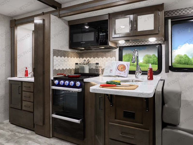 Have a luxurious week of vacation in this Windsport Class A gas motorhome! The bedroom is full of residential comfort with its RV king bed, 32" LED TV, and walk-in closet. The closet has also been prepped for a stackable washer/dryer. Another good place to sleep at night is the 54" x 74" drop-down overhead bunk, and additionally you have a 70" Dream Dinette and 68" sofa bed that can turn into beds when you aren't using them for other purposes. As soon as you enter this coach you will notice a broom closet to your left, and next to that closet is the residential refrigerator. The bathroom is fully equipped with a 32" x 32" radius shower, skylight, toilet, and vanity, and you will find a second vanity outside the bathroom which serves as a "getting ready" area.