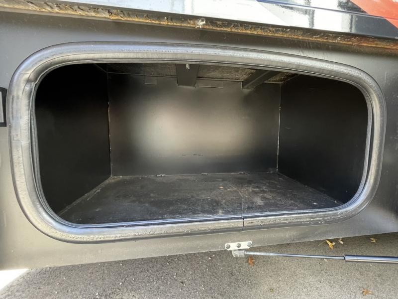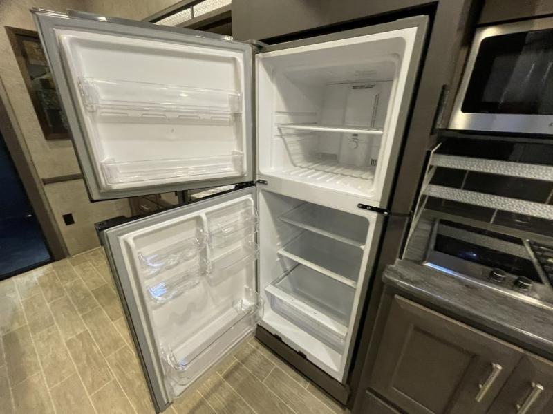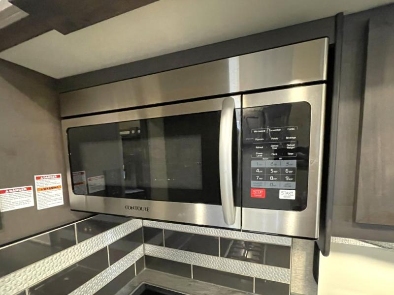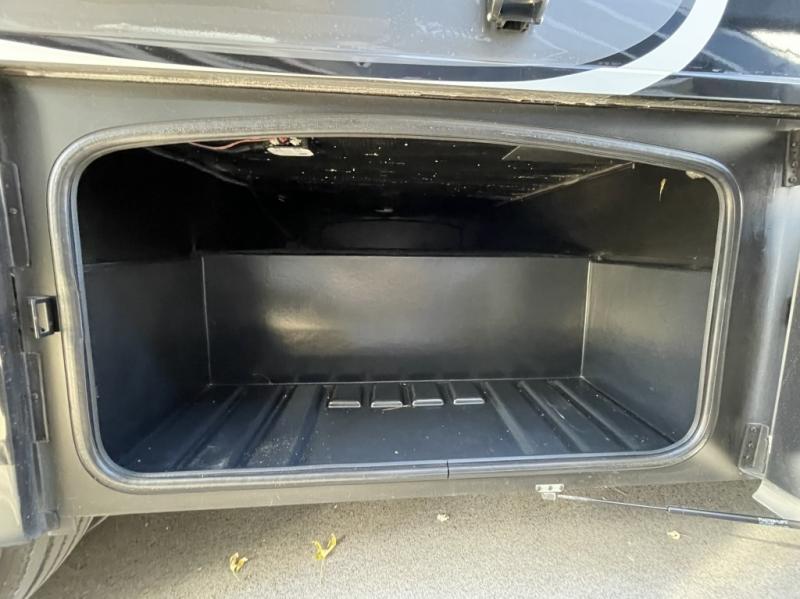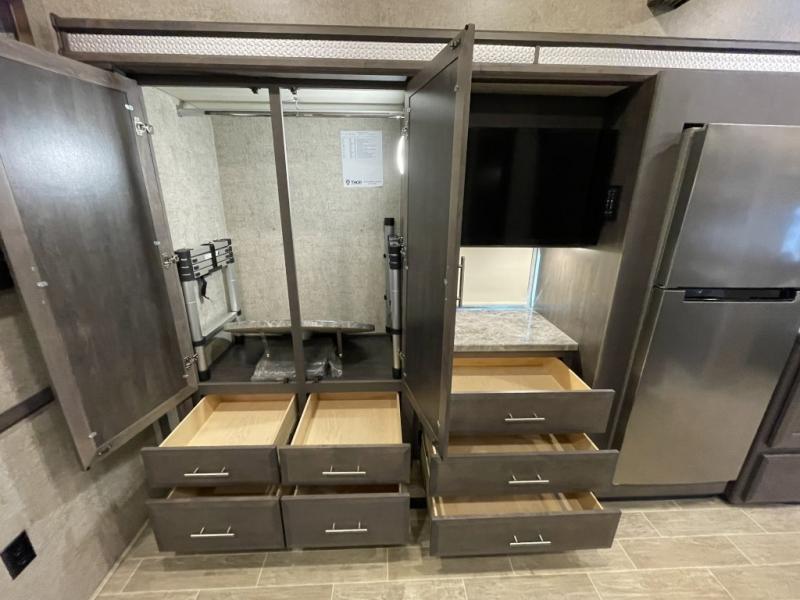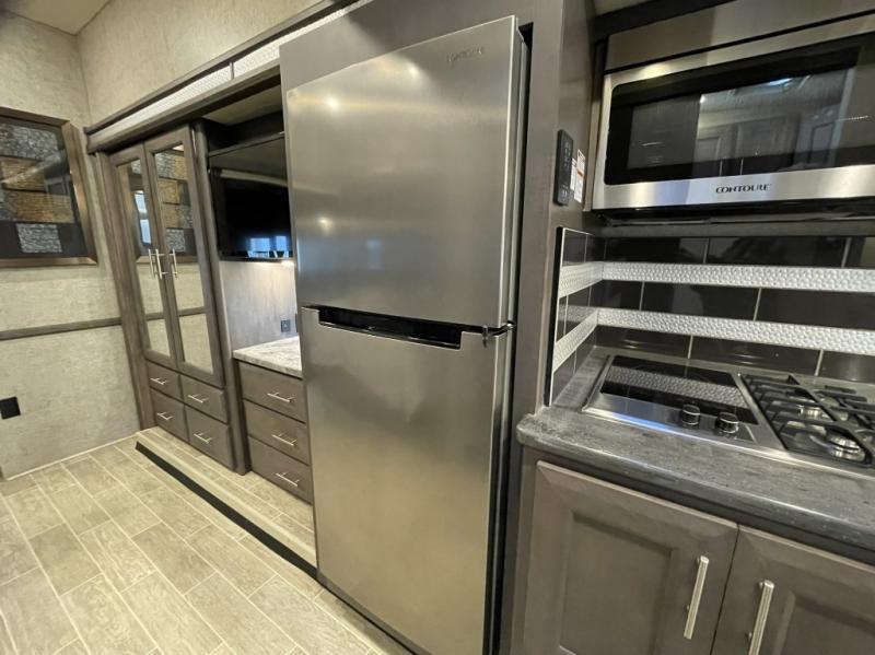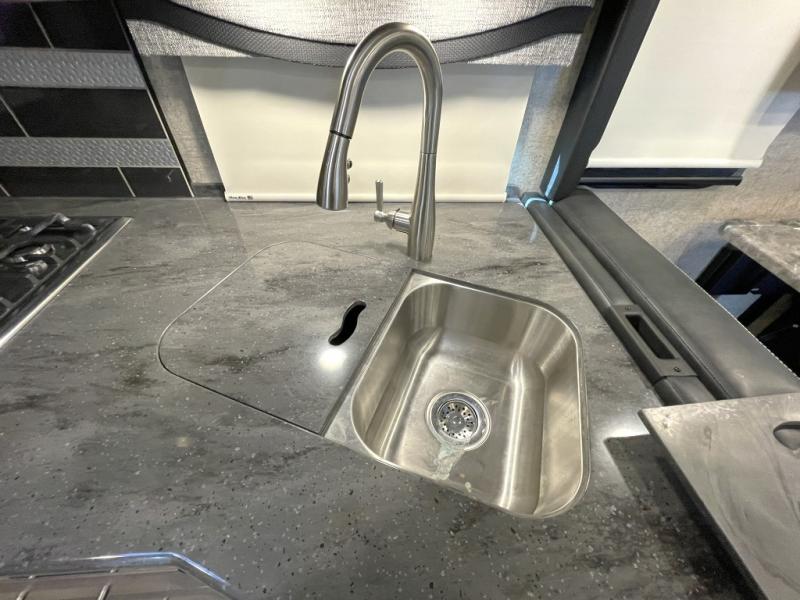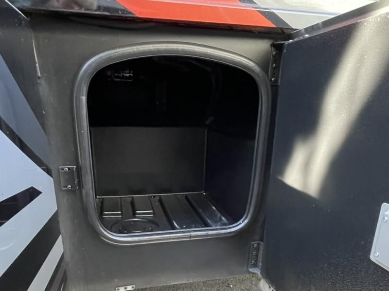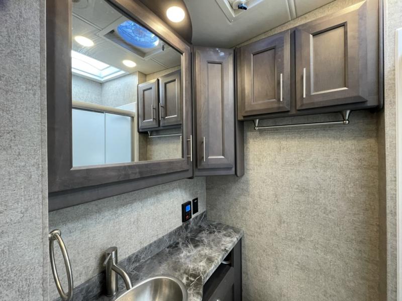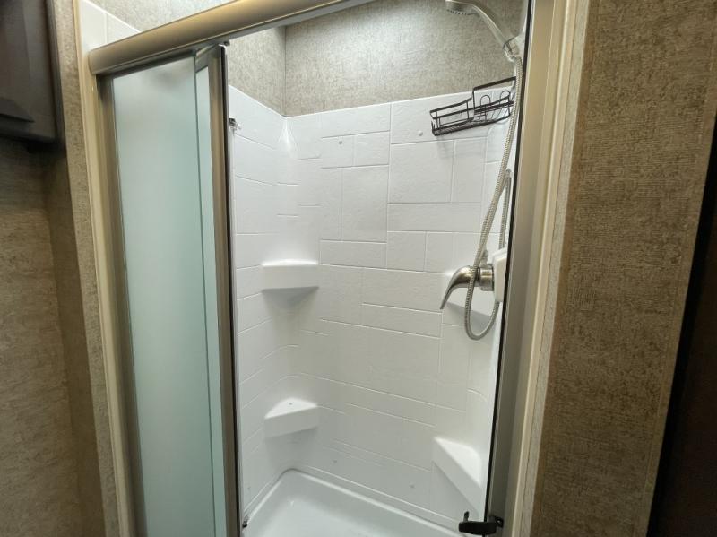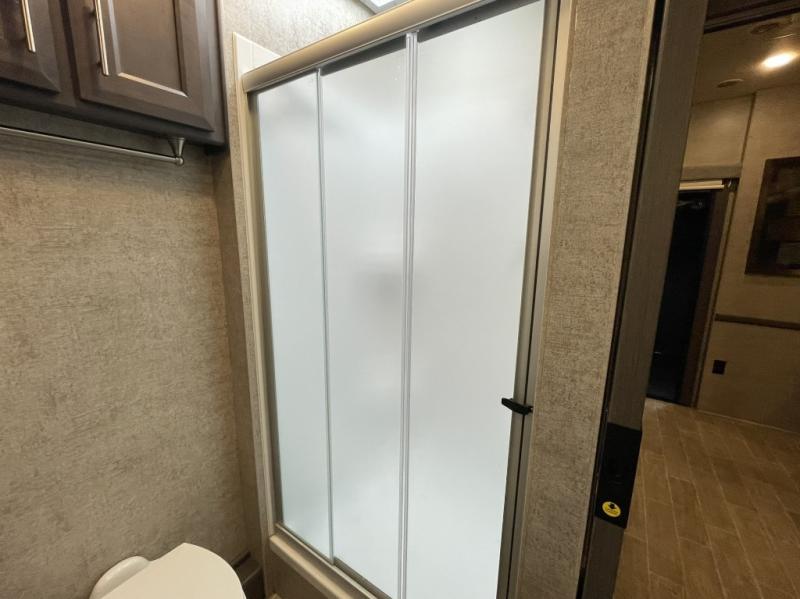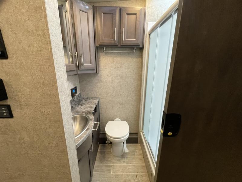 Built with VacuBond laminated construction, a premium one piece roof, and full body paint, this toy hauler is ready for years of adventure. Inside, enjoy solid surface countertops, leatherette furniture, satin finish cabinetry, and a glass shower door for a touch of luxury.