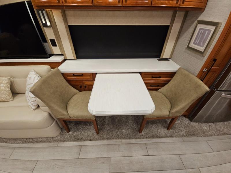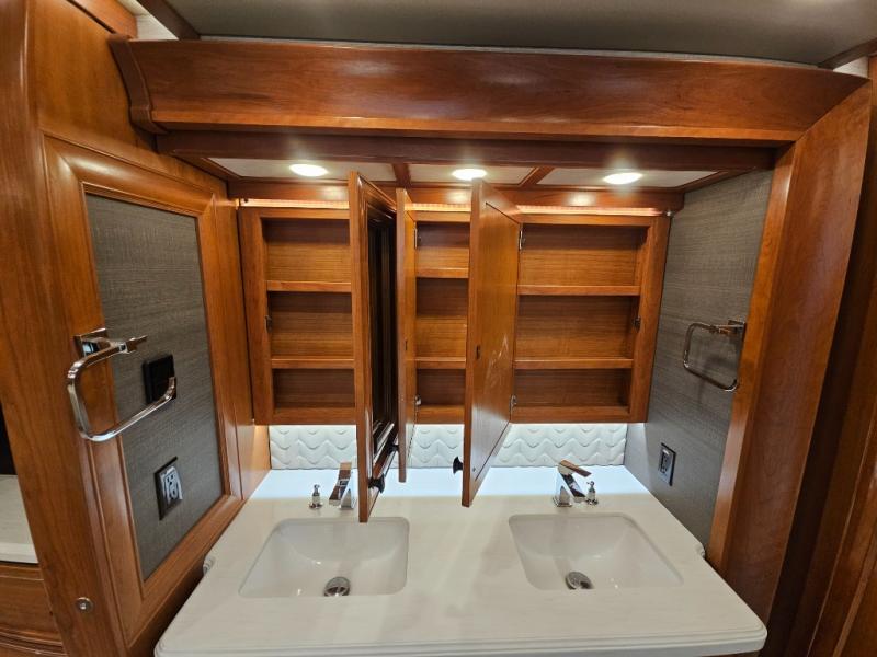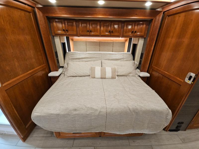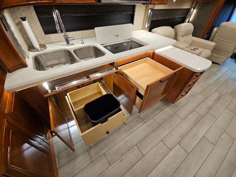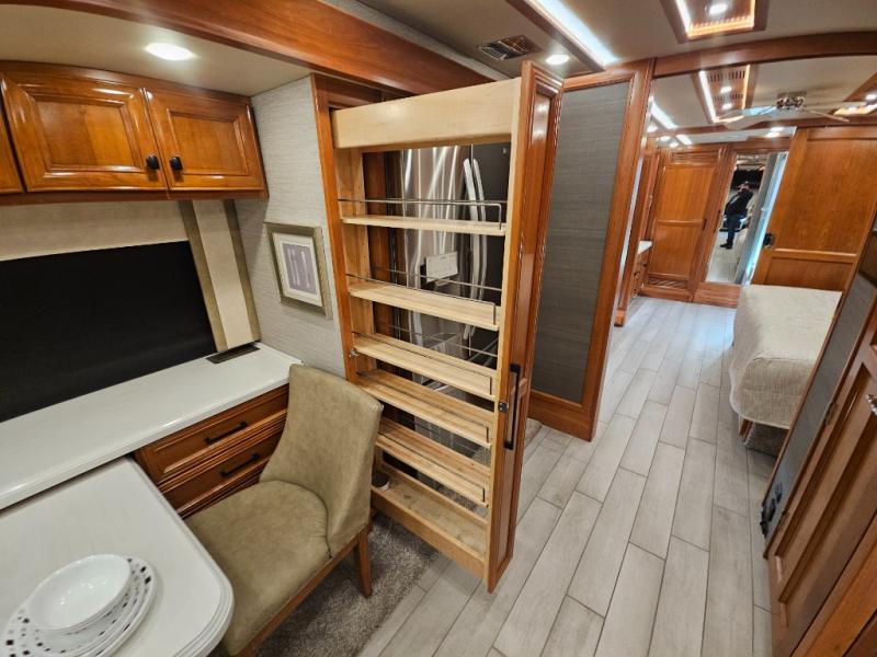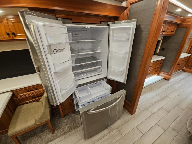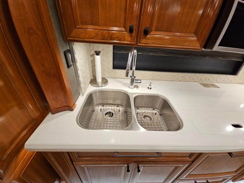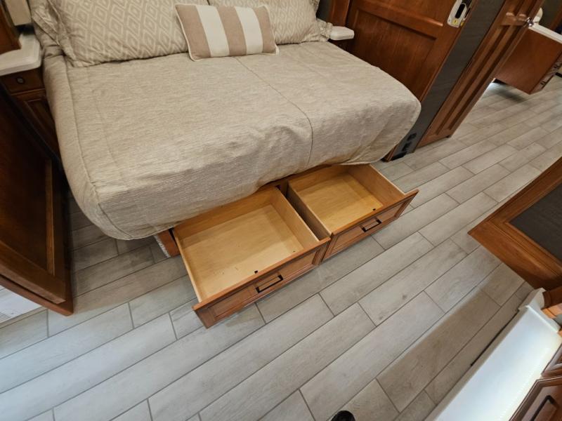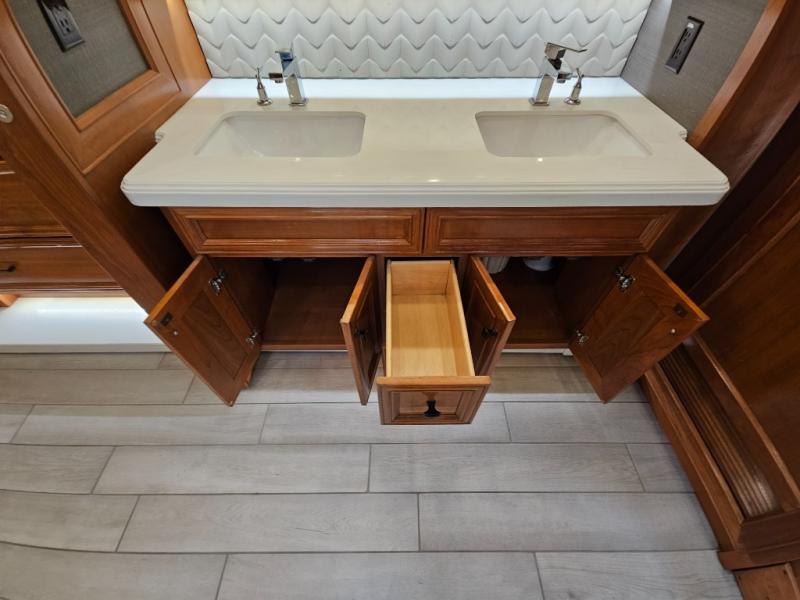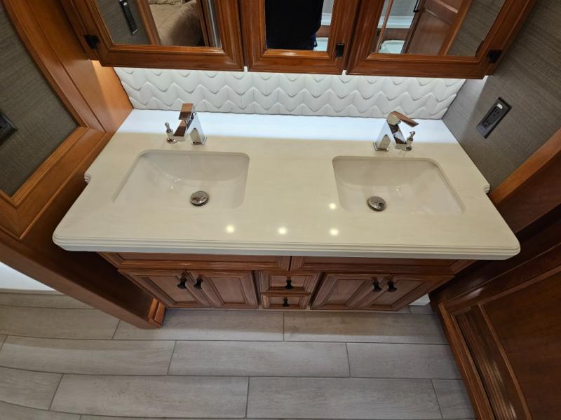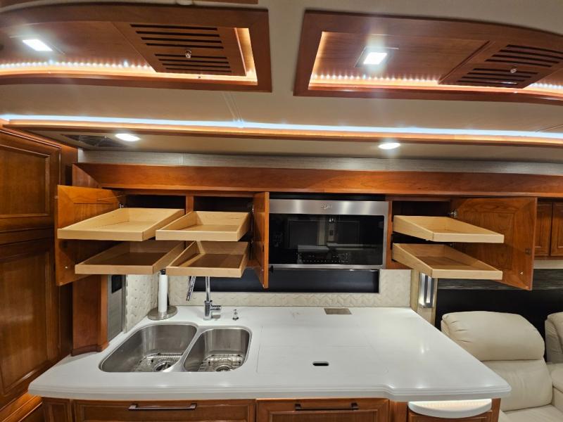 Now you can travel with more friends and family in this coach that includes a bath and a half, and additional sleeping space thanks to the two sofa beds. The master bedroom includes a king bed, a flat-panel TV, plus dual nightstands for your belongings. Dual bath sinks in the full rear bath allow to people to freshen up at once, and you can add the optional washer and dryer to make wash day a breeze. And check out the kitchen with its residential refrigerator, pantry, stainless steel convection microwave, and optional drawer-type dishwasher!