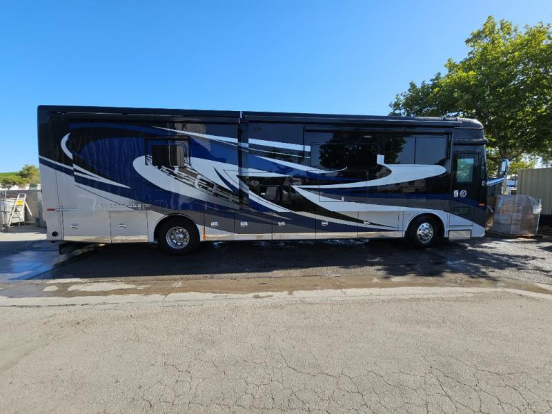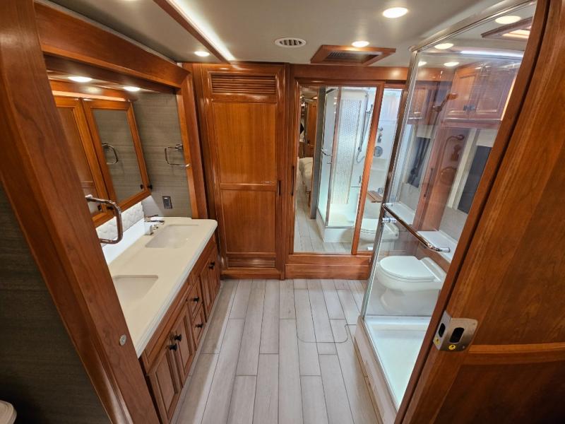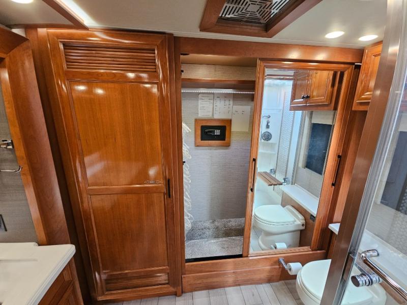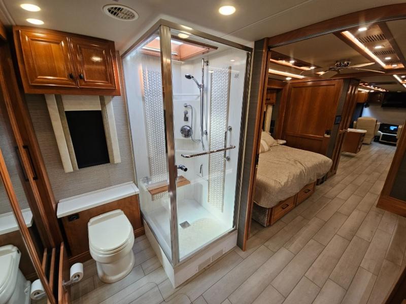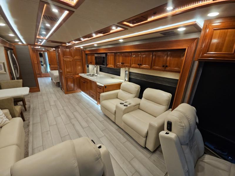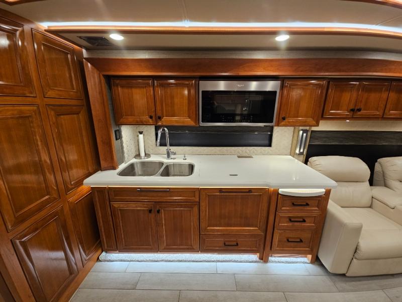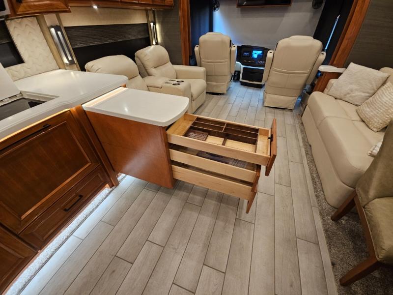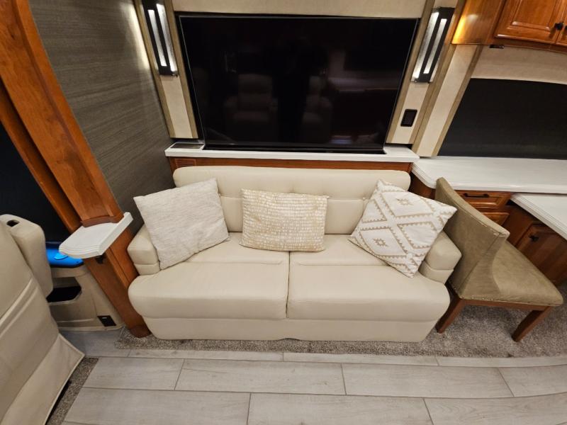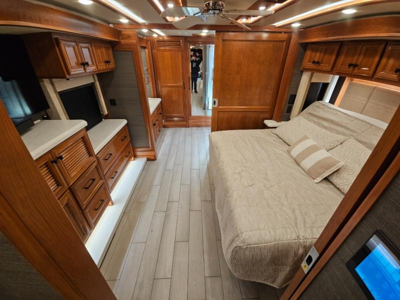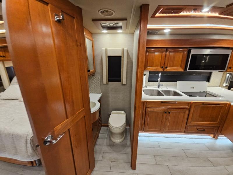 Now you can travel with more friends and family in this coach that includes a bath and a half, and additional sleeping space thanks to the two sofa beds. The master bedroom includes a king bed, a flat-panel TV, plus dual nightstands for your belongings. Dual bath sinks in the full rear bath allow to people to freshen up at once, and you can add the optional washer and dryer to make wash day a breeze. And check out the kitchen with its residential refrigerator, pantry, stainless steel convection microwave, and optional drawer-type dishwasher!