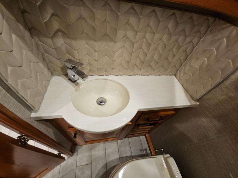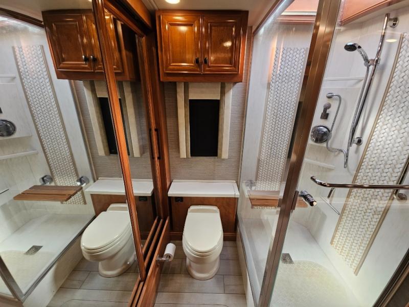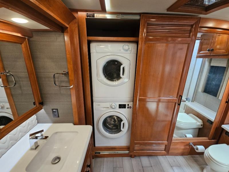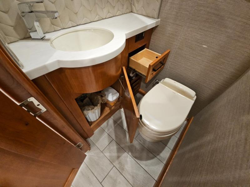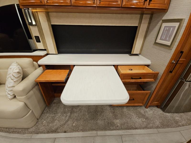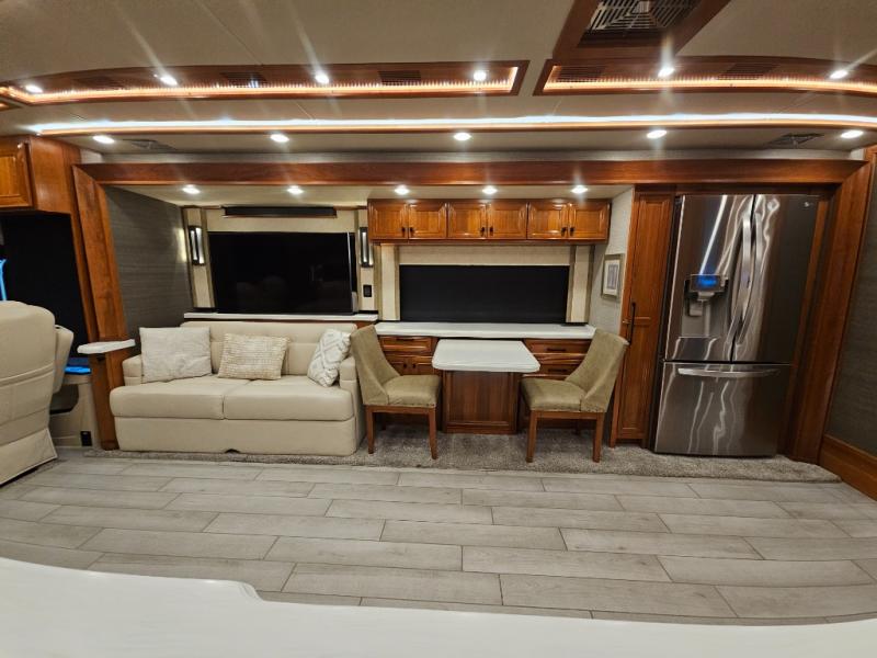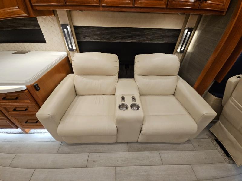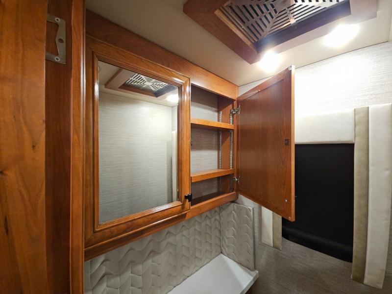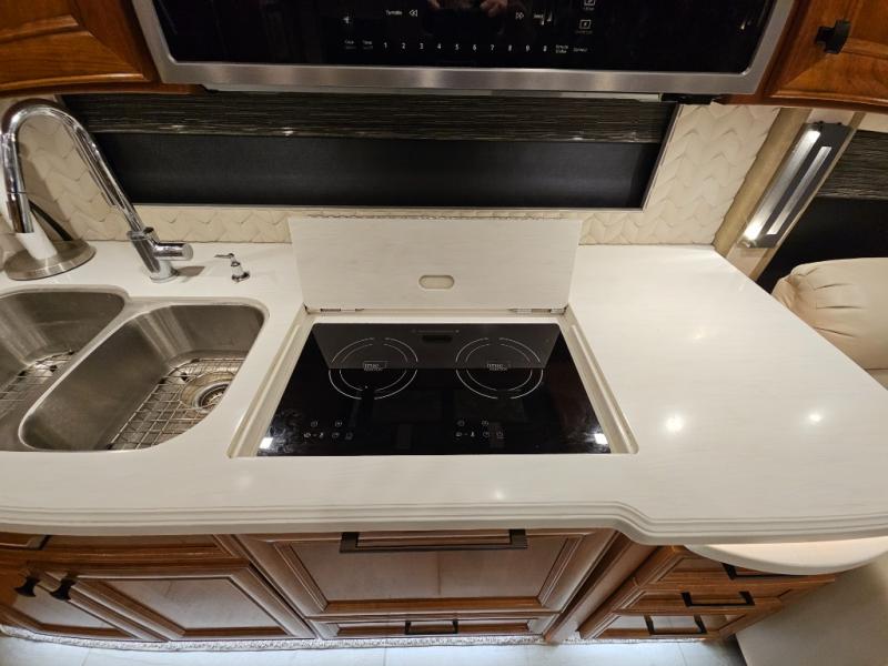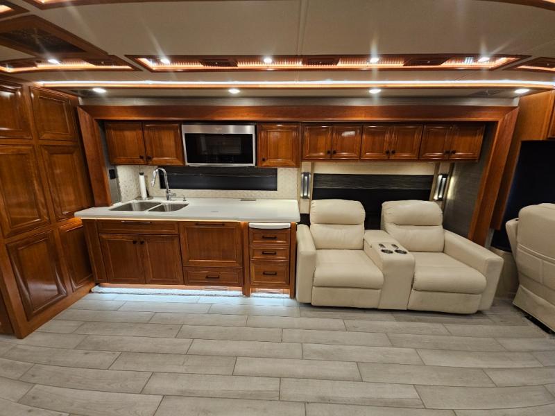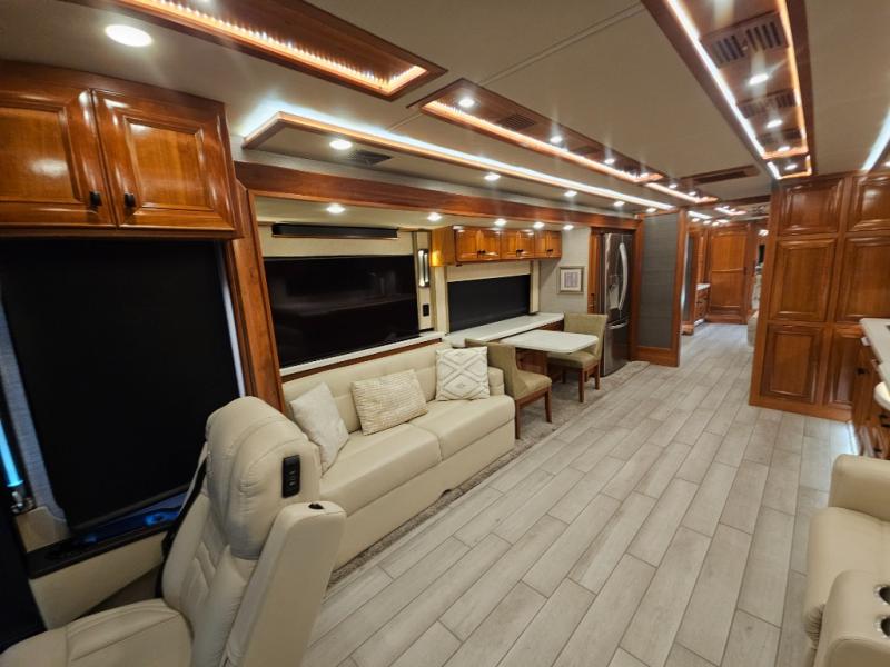 Now you can travel with more friends and family in this coach that includes a bath and a half, and additional sleeping space thanks to the two sofa beds. The master bedroom includes a king bed, a flat-panel TV, plus dual nightstands for your belongings. Dual bath sinks in the full rear bath allow to people to freshen up at once, and you can add the optional washer and dryer to make wash day a breeze. And check out the kitchen with its residential refrigerator, pantry, stainless steel convection microwave, and optional drawer-type dishwasher!