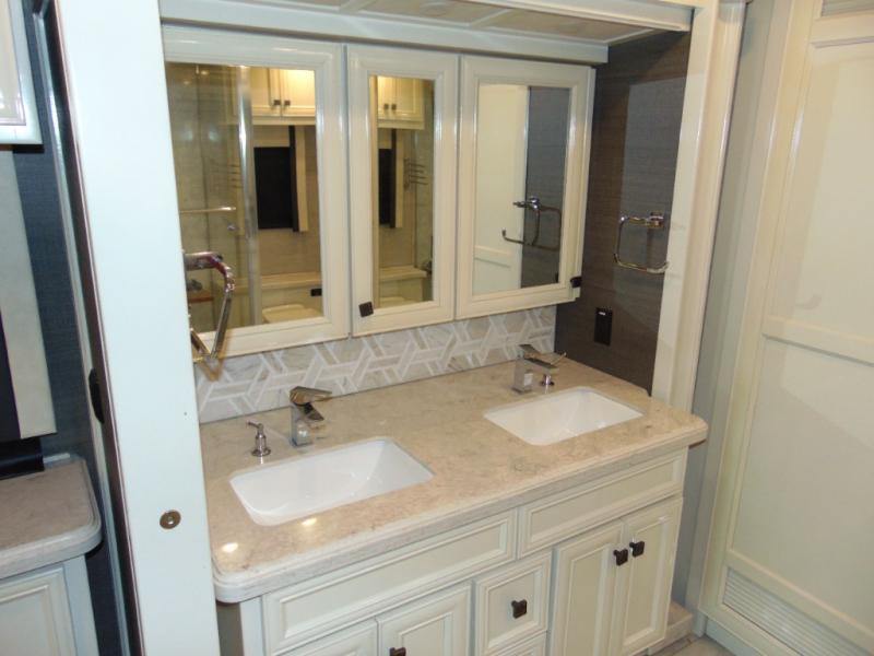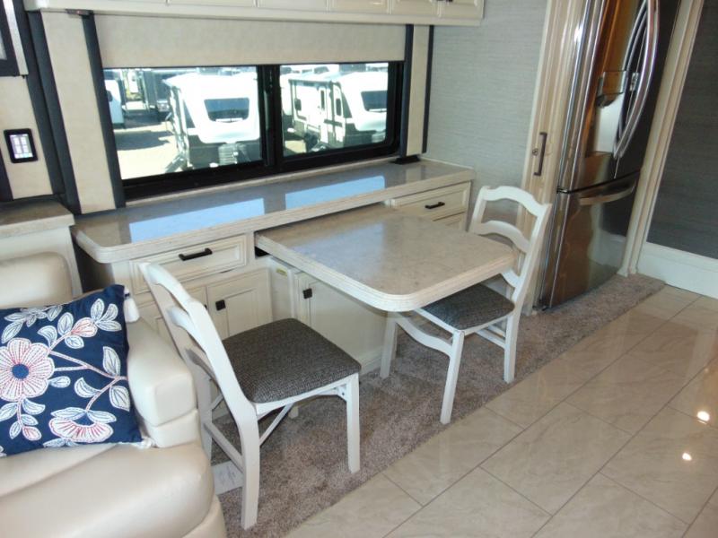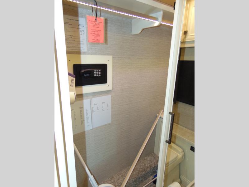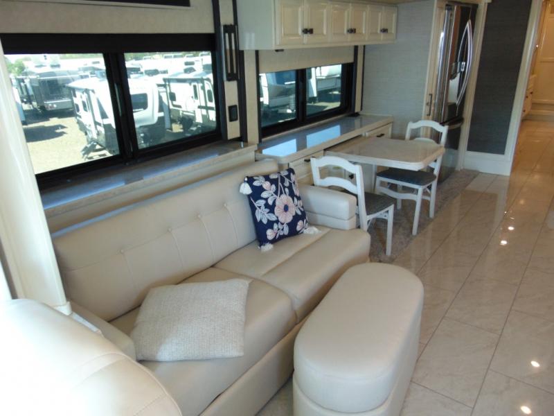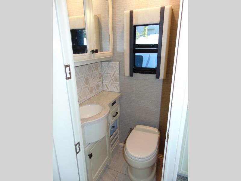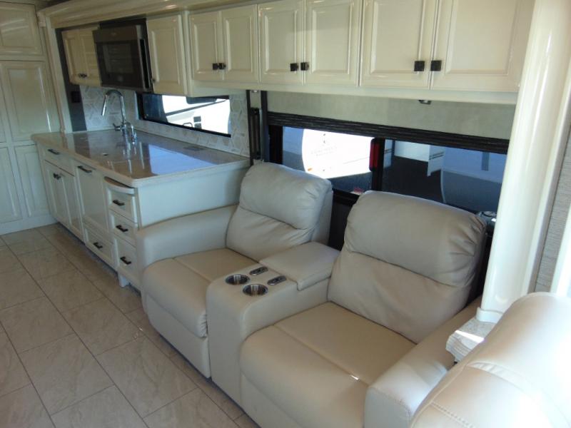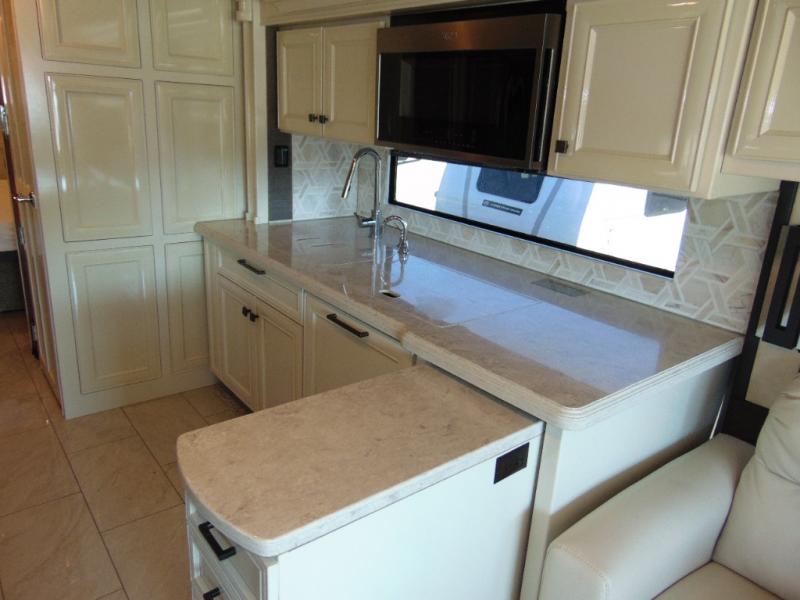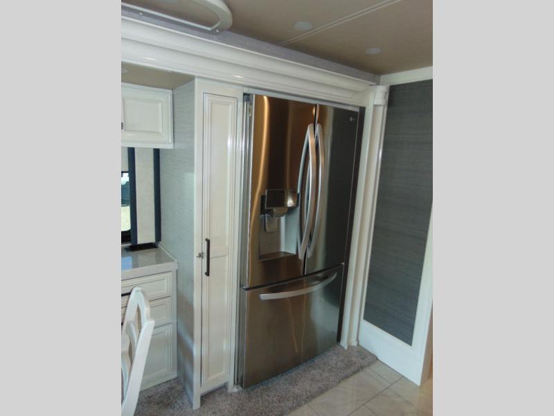 Now you can travel with more friends and family in this coach that includes a bath and a half, and additional sleeping space thanks to the sofa bed across from the Theater Seating. The master bedroom includes a king bed, a flat-panel TV, plus dual nightstands for your belongings. Dual bath sinks in the full rear bath allow to people to freshen up at once, and you can add the optional washer and dryer to make wash day a breeze. And check out the kitchen with its residential refrigerator, pantry, stainless steel convection microwave, and drawer-type dishwasher!