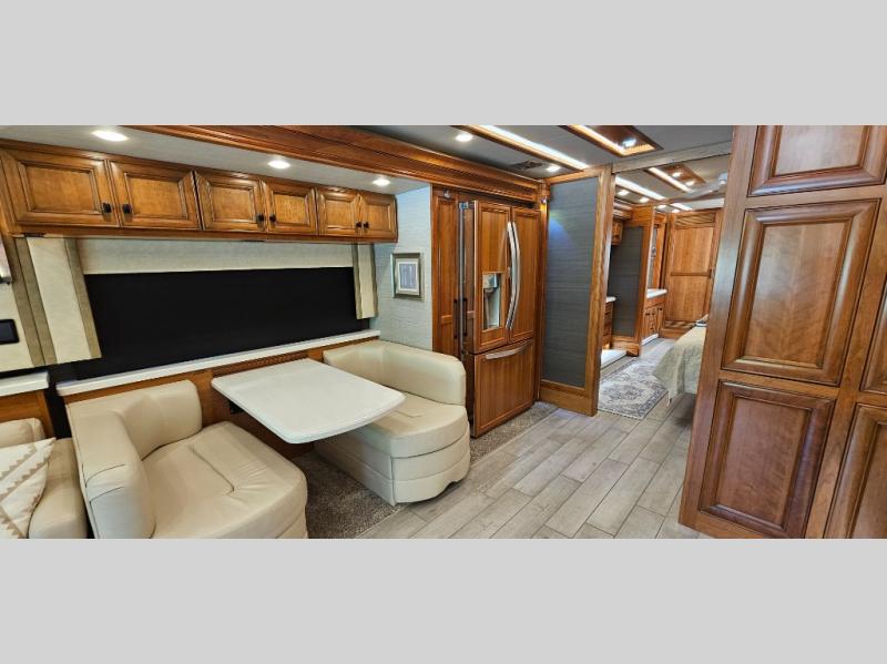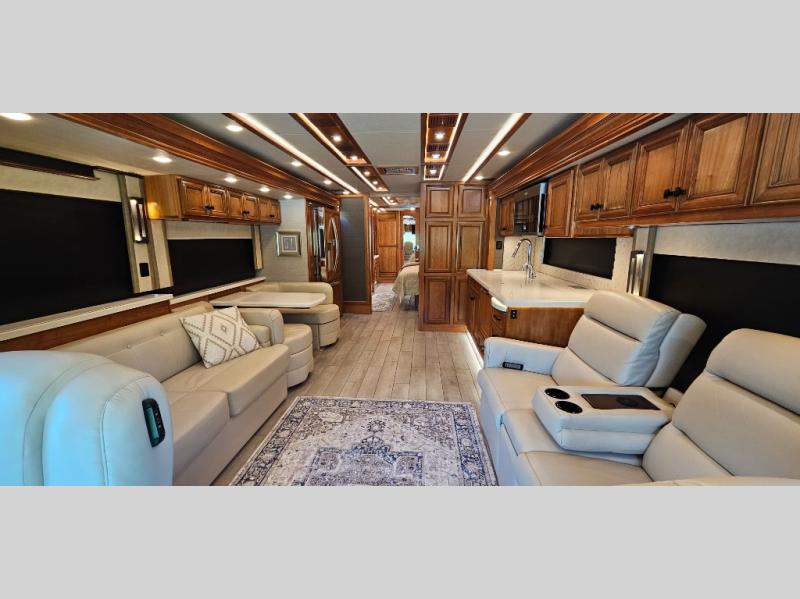 Ample seating, slide-out living areas, and high-end finishes create an inviting home-style environment.