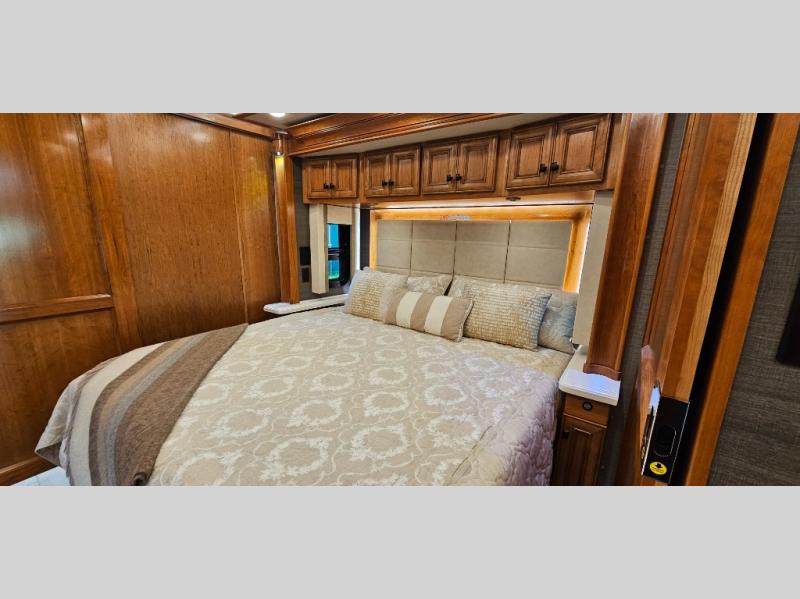 A restful bedroom with storage and comfort features that enhance overnight travel or full-time living.