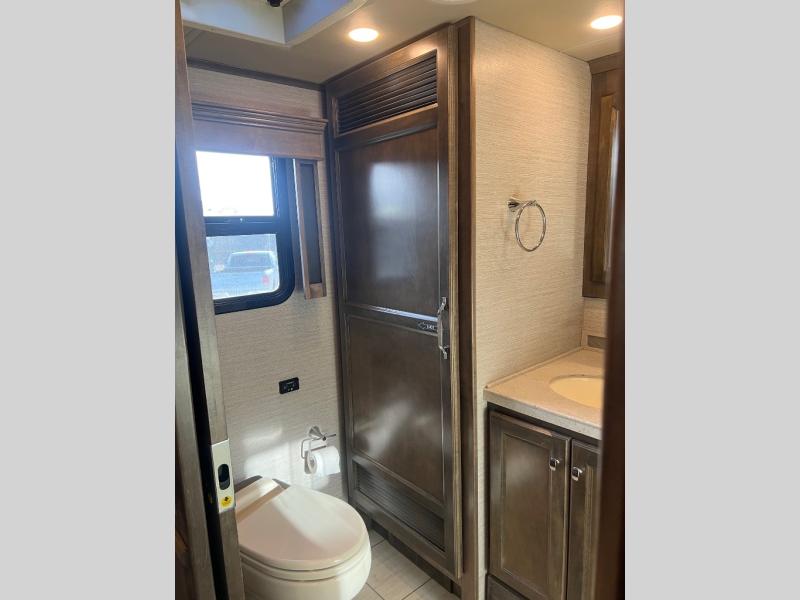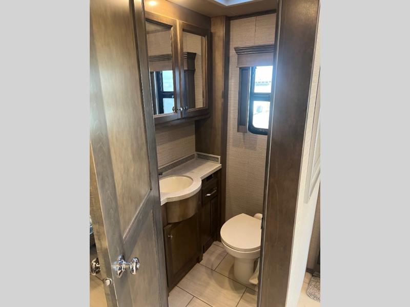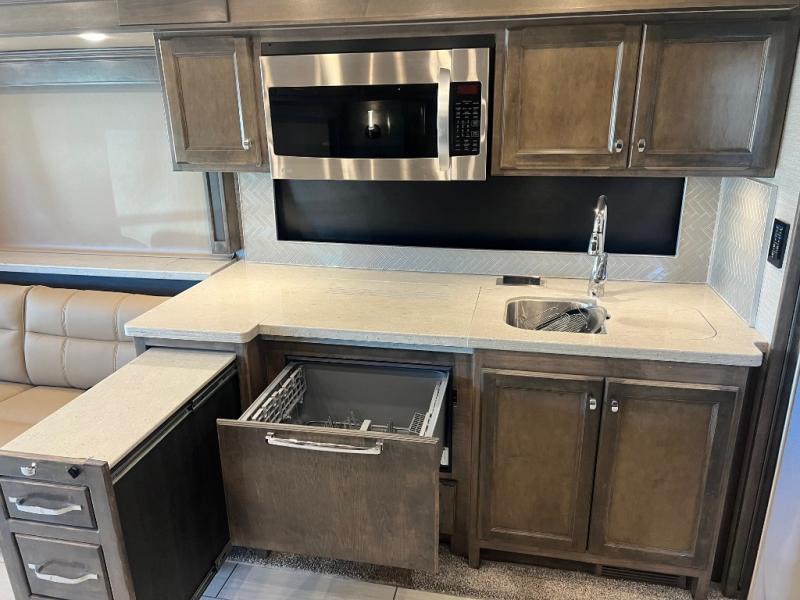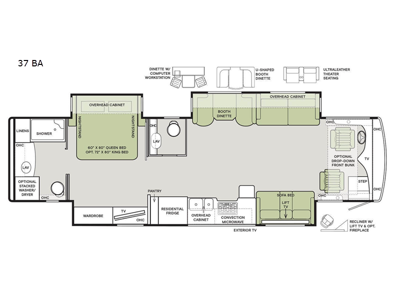 If luxury is what you want, luxury is what you'll get with this Allegro RED 360 Class A diesel motorhome! Glamorous furnishings and high-class style are included all throughout this coach. One of the best features is going to be the master suite. This space has a private bedroom connected to its own private bathroom. The queen bed slide sits across from the full-wall slide, so there is plenty of space to change your clothes and just relax. There is a flat-panel TV next to the wardrobe and across from the bed for easy viewing at night, and the bathroom has a place for the washer/dryer . Out in the main living area, the rest of your traveling companions can use the half bathroom to clean up, and there is plenty of Ultraleather seating for everyone to lounge on with the booth dinette and two sofas. If you would like to have more sleeping space, you can add the optional drop-down bunk above the cab.