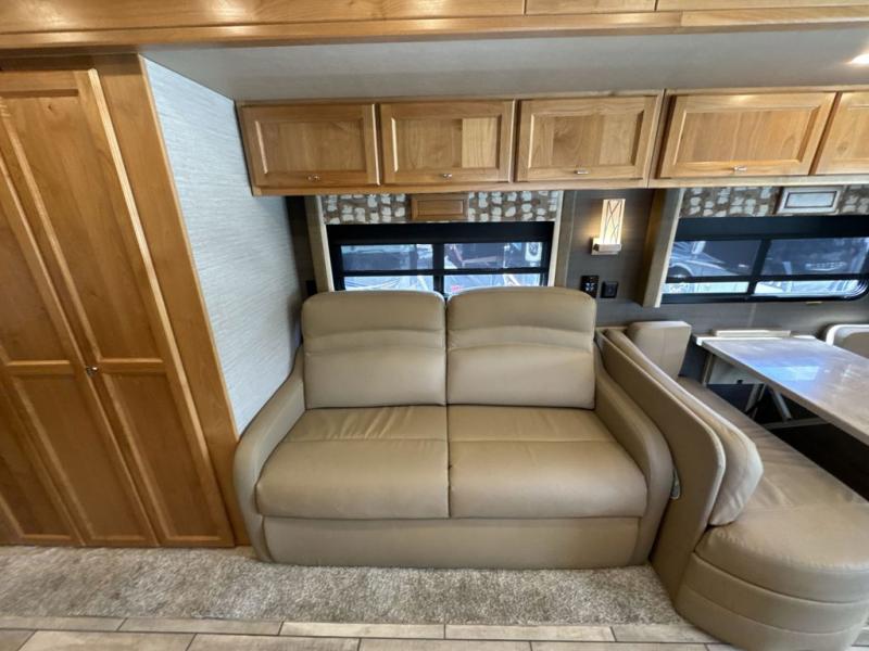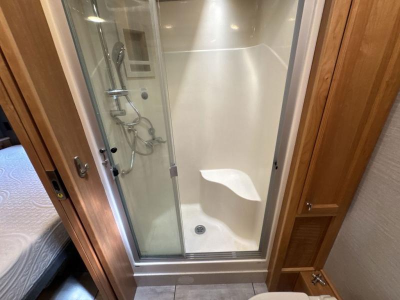 There are plenty of sleeping choices in this motorhome! From the king bed slide in the private bedroom and the set of 28" x 70" bunk beds to the optional drop-down front bunk and sofa bed, plus you can even convert the booth dinette when you aren't using it to enjoy a meal or play a card game. The master suite has a wardrobe with bank of drawers below to keep your clothes looking nice, a swivel TV cabinet, and access to the full rear bathroom which has a shower with a seat, an overhead cabinet with linen storage, and an area prepped to add an optional washer and dryer. The kitchen has everything you need to prepare your best meals including a pantry to store your snacks. A few options you can choose to add include an optional fireplace, an ultraleather air coil sofa bed, and dinette with computer work station!