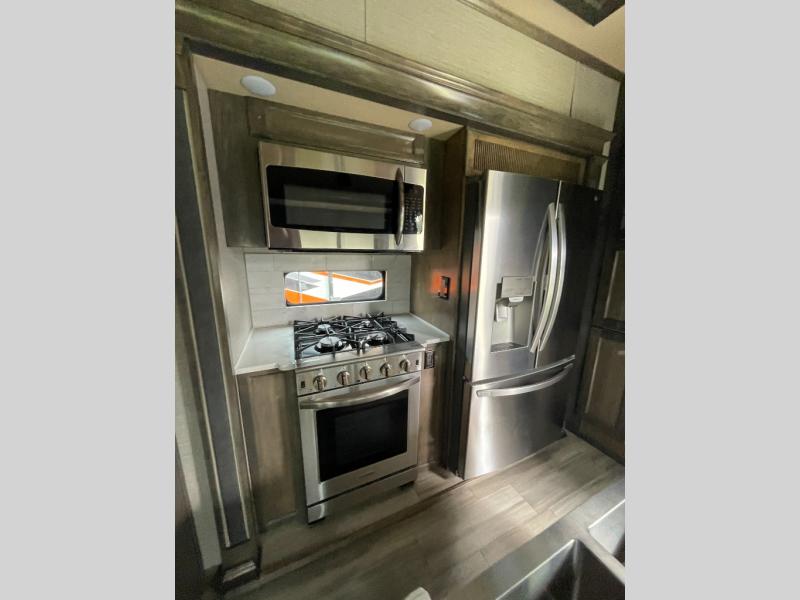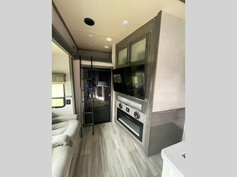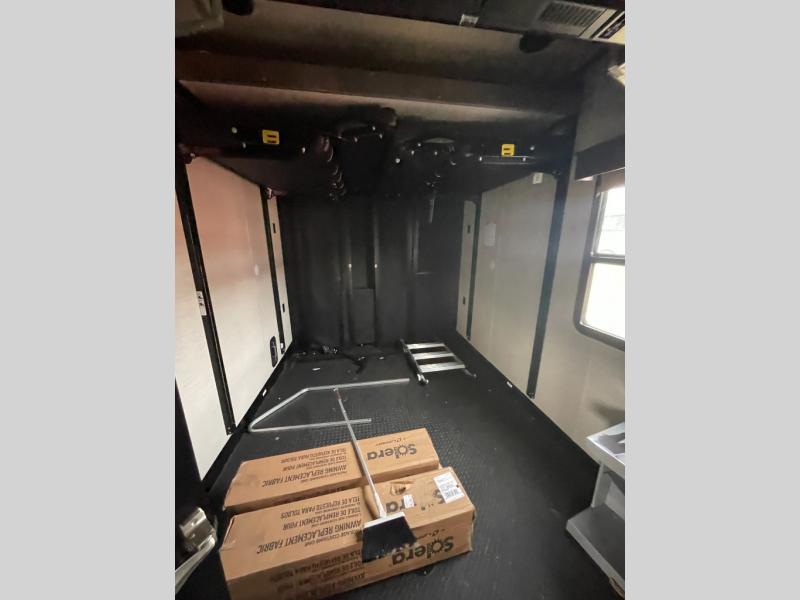 Pack your bags and load up your favorite off-road toys into the 13' garage area of this toy hauler! Once you have arrived, you can set up the folding sofas below the Happi-Jac queen bed lift, the 43" Smart TV, and the loft that is accessible from the living area. Prepare your best meals with the kitchen island and Insignia oven then enjoy them at the 120" super sofa which could be switched out for the optional 60" theater sofa and the optional 60" theater seat dinette table. What better way to wind down your nights than to sit in front of the 40" fireplace while watching a movie with the 50" Smart TV and Rockford Fosgate audio system. Freshen up in the full bathroom with a 48" x 30" shower then relax on the king bed slide in the front private bedroom. The bedroom also has a front closet with a sliding door and an area prepped to add an optional washer and dryer!