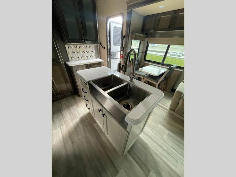 Each one of these VanLeigh RV Ambition fifth wheel toy haulers are designed to give you the best journey possible! Their high gloss fiberglass exterior with full body paint will turn heads down the highway. A fully enclosed and heated underbelly with heat return lets you camp all year round and a Truma on-demand water heater provides hot water right away. The Lippert road armor suspension will protect your unit for years of fun. Stay cool in the summer with dual 15,000 BTU A/C units and warm in the winter with a 42,000 BTU furnace. A three seasons patio door brings the outdoors inside with sunlight and a view of your beautiful surroundings. Your electronics will recharge with dual USB ports on the nightstands as you recharge on the cool gel memory foam king mattress!