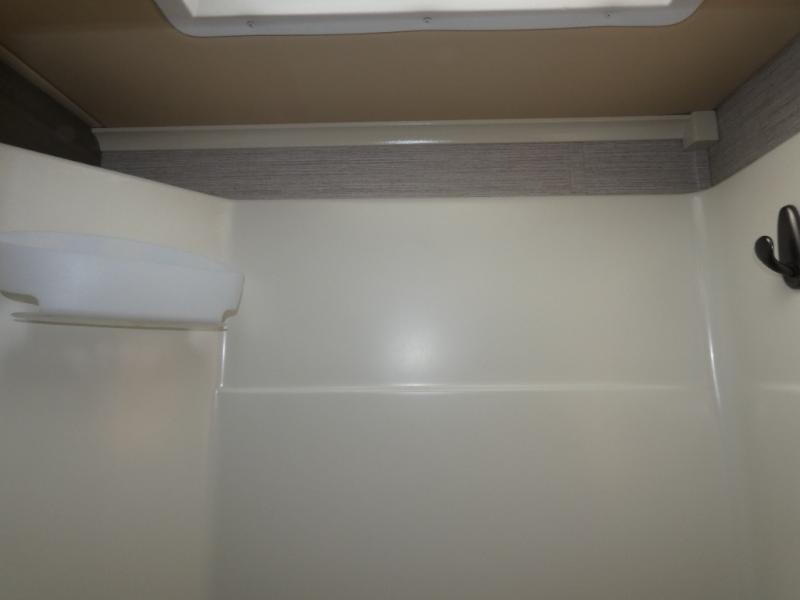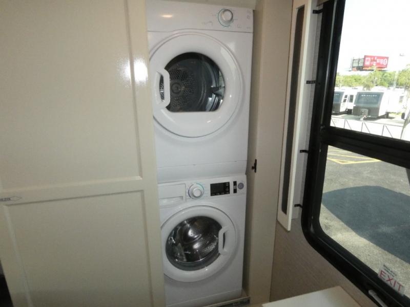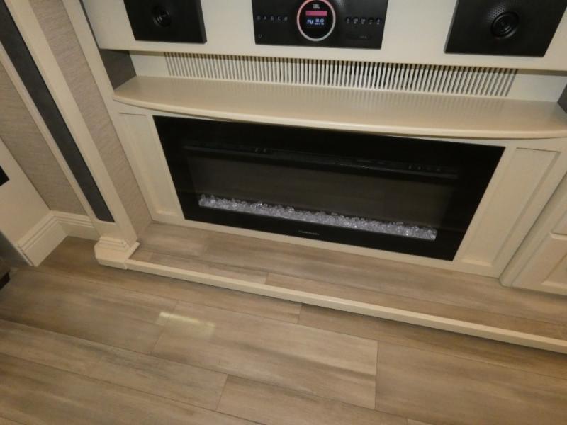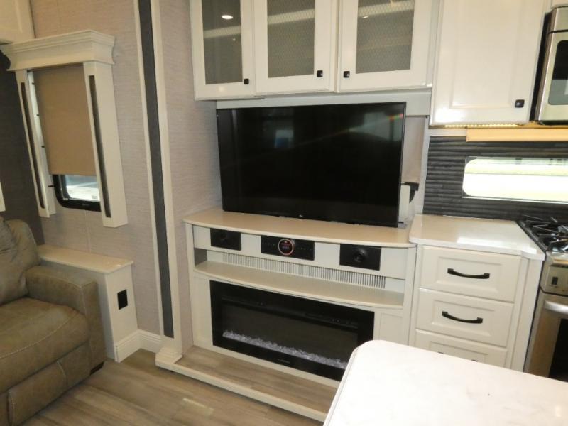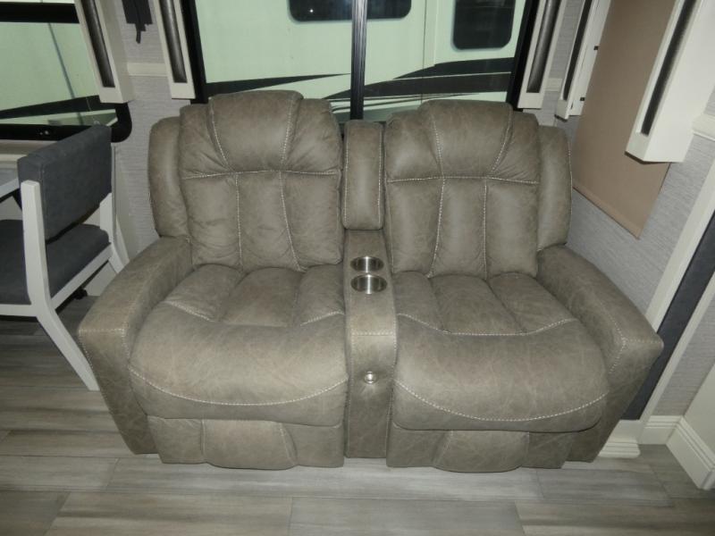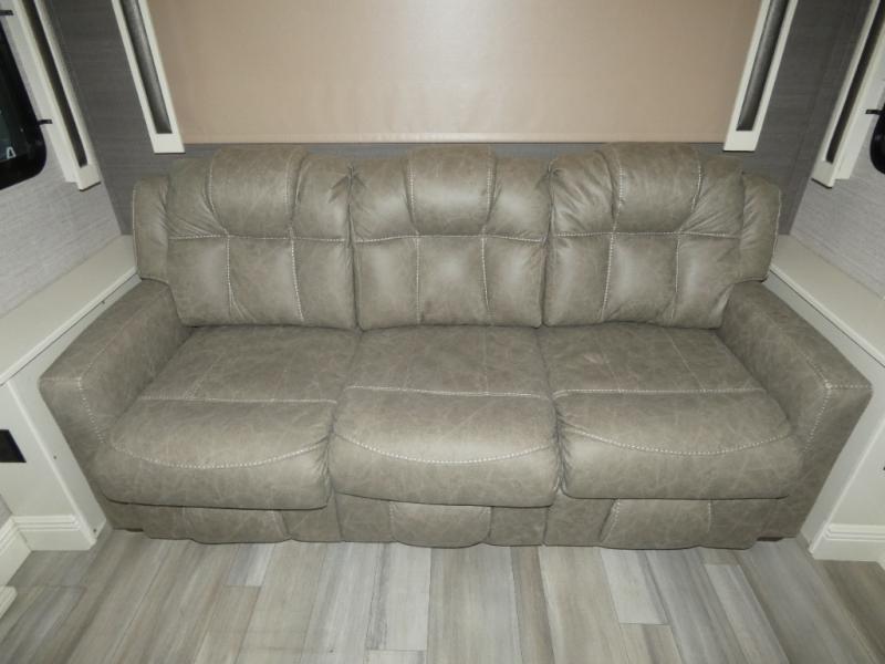 Enjoy time away from the hustle and bustle of the city life in this comfortable fifth wheel. Once you arrive at your destination, set up the two patio awnings, then stretch your legs around the campground. The chef of the family can prepare lunch on the kitchen island, and you can dine at the dinette with chairs. There is also a theater sofa and an 80" sofa bed for additional seating space, and the 40" fireplace with a TV above will feel just like home. If you've spent the day outdoors you can freshen up in the full bath that includes a shower with a seat, plus a medicine cabinet for your necessities. The front private bedroom includes everything you would expect to find at home, including a king bed, a Hi-Boy dresser with a TV, plus a large front closet with a sliding door!