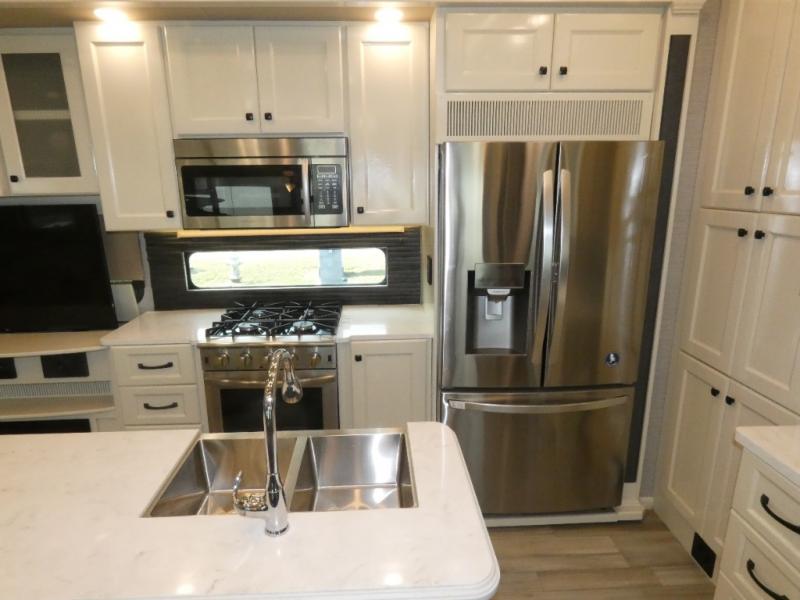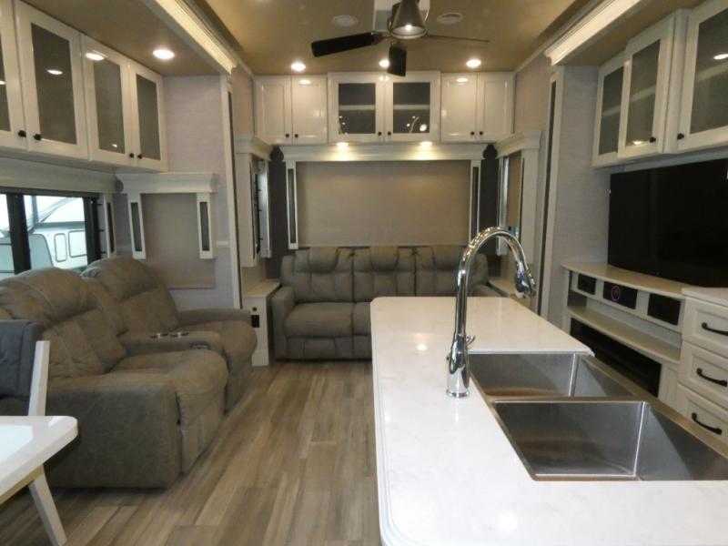Each Beacon fifth wheel by VanLeigh RV is made with your comfort in mind. From the high-quality Franklin furniture, made in the U.S.A, to the Cool Gel Memory Foam mattress, it's easy to find luxury features at every turn. There is a galley window in each model so you will have a view of the great outdoors as you clean up, and each kitchen includes a stainless steel farm sink, a hand-built pantry to store all your items, plus an LG residential refrigerator with ice and water in the door. You will love the sleek look of the full overlay hardwood cabinetry and faceferames, the hand laid vinyl tile flooring throughout, and the hardwood ceiling decor with recessed LED lighting. Plan to travel year around with the Whisper Quiet A/C system, the 42,000 BTU furnace, and the 7,200 BTU electric fireplace, plus each model is constructed with a fully enclosed and heated underbelly with heat return. The outside of the Beacon features two patio awnings on slide boxes, an LED lighting system, plus dual exterior speakers to keep the party going day or night!