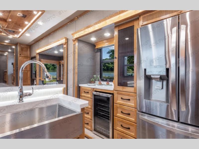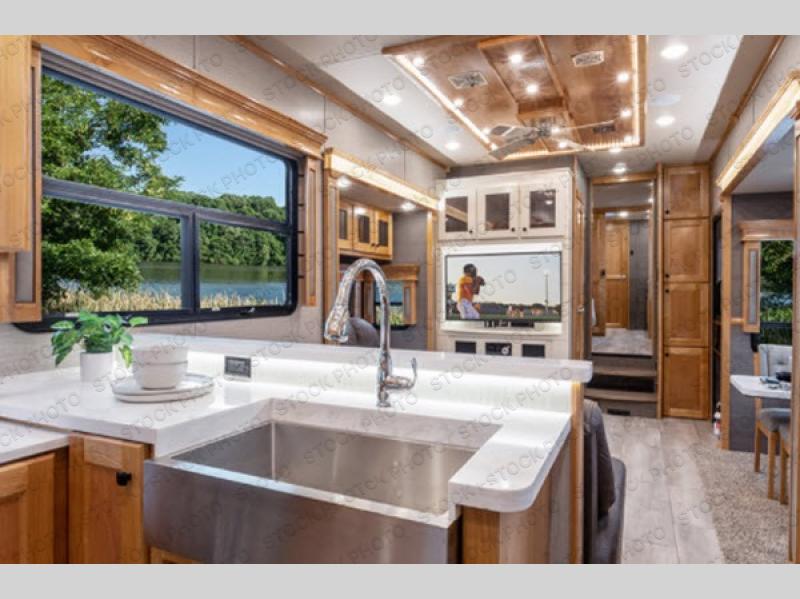 Each Beacon fifth wheel by VanLeigh RV is made with your comfort in mind. From the high-quality Franklin furniture, made in the U.S.A, to the Cool Gel Memory Foam mattress, it's easy to find luxury features at every turn. There is a galley window in each model so you will have a view of the great outdoors as you clean up, and each kitchen includes a stainless steel farm sink, a hand-built pantry to store all your items, plus an LG residential refrigerator with ice and water in the door. You will love the sleek look of the full overlay hardwood cabinetry and faceferames, the hand laid vinyl tile flooring throughout, and the hardwood ceiling decor with recessed LED lighting. Plan to travel year around with the Whisper Quiet A/C system, the 42,000 BTU furnace, and the 7,200 BTU electric fireplace, plus each model is constructed with a fully enclosed and heated underbelly with heat return. The outside of the Beacon features two patio awnings on slide boxes, an LED lighting system, plus dual exterior speakers to keep the party going day or night!