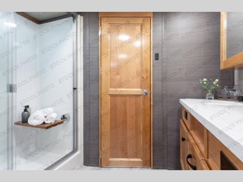 Your family vacations just got a whole lot sweeter in this fifth wheel that can sleep four people each night. Once you arrive at the campground, put out the four slides, then enjoy lunch on the dinette with chairs. The dual opposing slides here will let the kids play a board game on the floor if they want, and you and your spouse can relax on the theater sofa. Prep and cook all your meals in the rear kitchen that includes ample counter space, an Insignia oven and cooktop, plus an optional dishwasher to make cleaning up easier than ever. The master bedroom includes sliding doors to save on space, a king bed, plus a bedroom fireplace for a cozy evening indoors. You will love the front bath with its dual bath sinks, spacious shower with a Teak Wood seat, plus a large front closet with tons of storage space. This model also includes a convenient half bath for your guests, now that's what I call luxury!