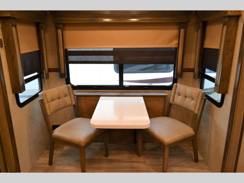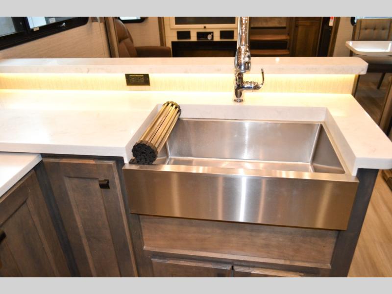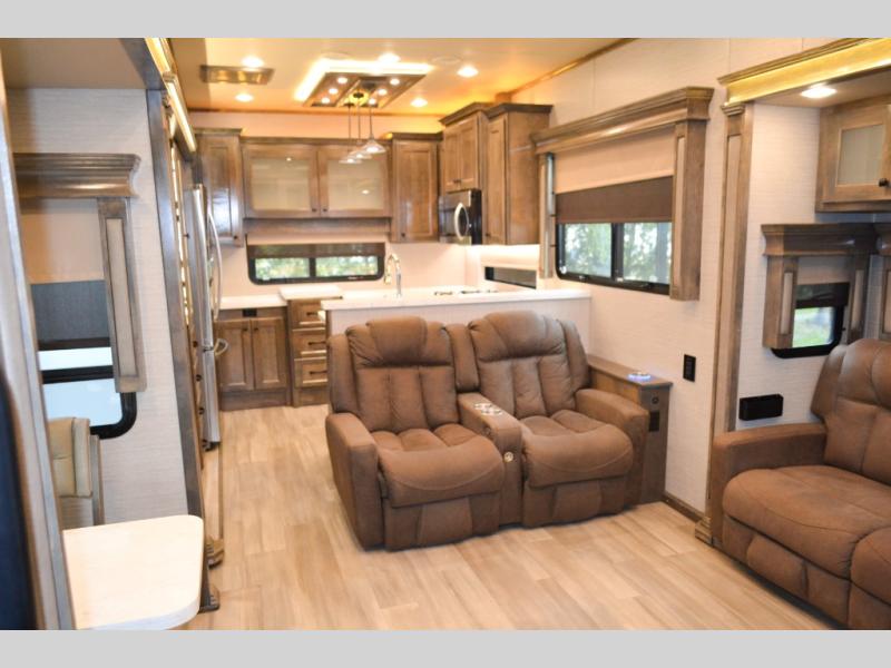 Your family vacations just got a whole lot sweeter in this fifth wheel that can sleep four people each night. Once you arrive at the campground, put out the four slides, then enjoy lunch on the dinette with chairs. The dual opposing slides here will let the kids play a board game on the floor if they want, and you and your spouse can relax on the theater sofa. Prep and cook all your meals in the rear kitchen that includes ample counter space, an Insignia oven and cooktop, plus an optional dishwasher to make cleaning up easier than ever. The master bedroom includes sliding doors to save on space, a king bed, plus a bedroom fireplace for a cozy evening indoors. You will love the front bath with its dual bath sinks, spacious shower with a Teak Wood seat, plus a large front closet with tons of storage space. This model also includes a convenient half bath for your guests, now that's what I call luxury!
