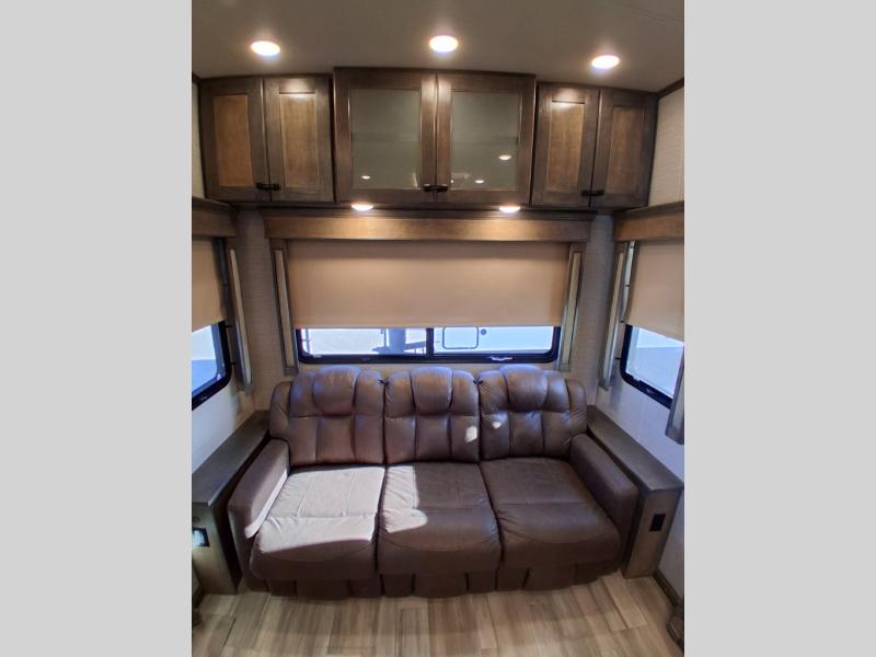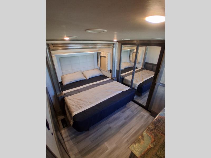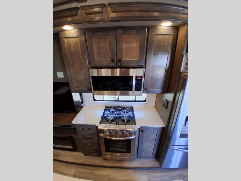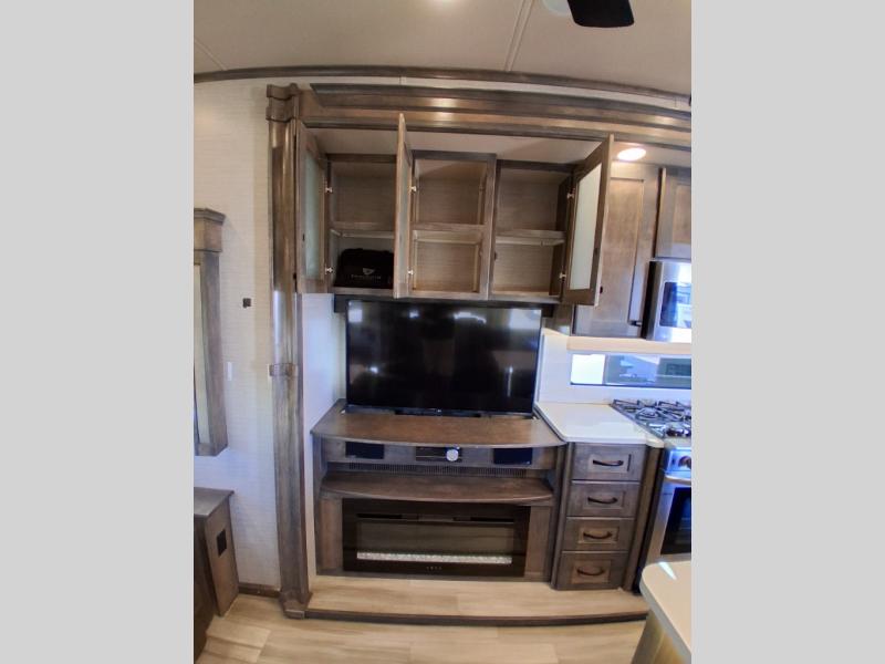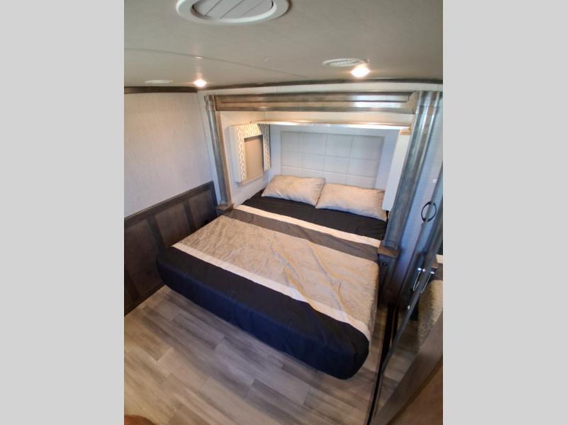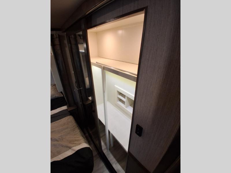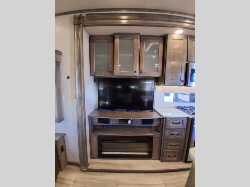 Enjoy luxury at every turn in this Vilano model. The dual opposing slides in the main living area provide space to relax comfortably on the sofa bed or theater sofa seats, and there is a 40" fireplace with a 50" Smart TV for a warm, cozy feel. The chef will love cooking in the kitchen with its stainless steel convection microwave and a stainless steel Insignia oven, plus there is a large pantry and a residential refrigerator to store food for weeks. The front private bedroom will feel just like home with its slide out king bed and residential hardwood headboard, hardwood dresser, and a full-sized wardrobe with motion sensing lighting!