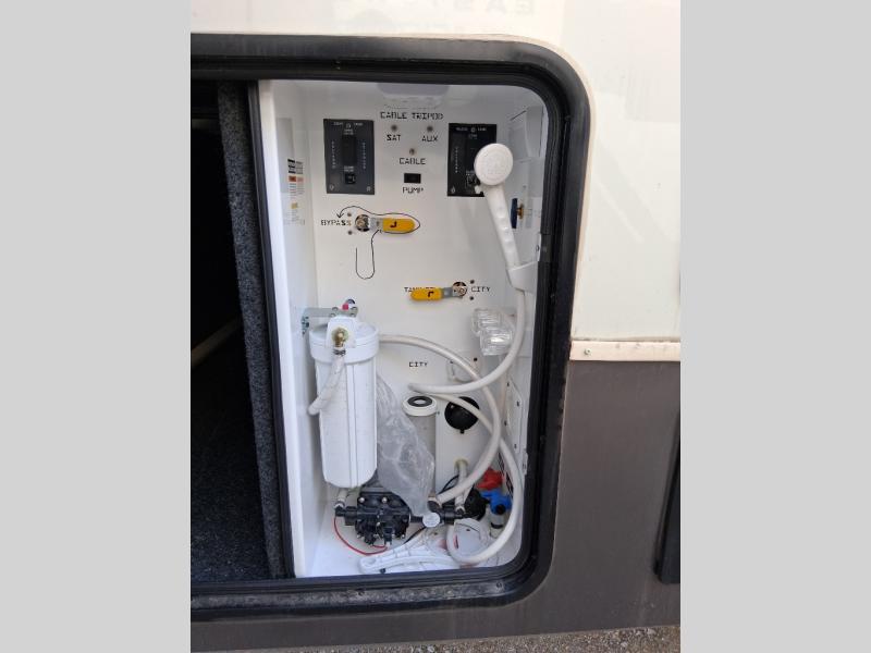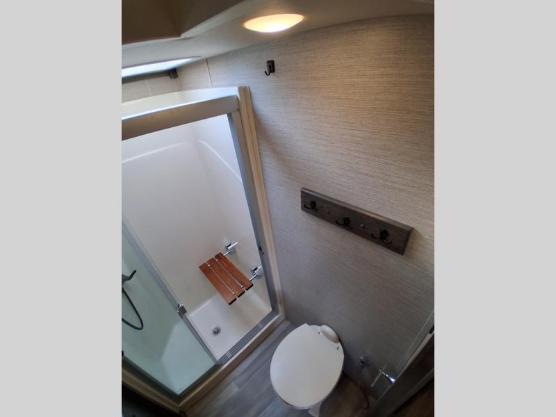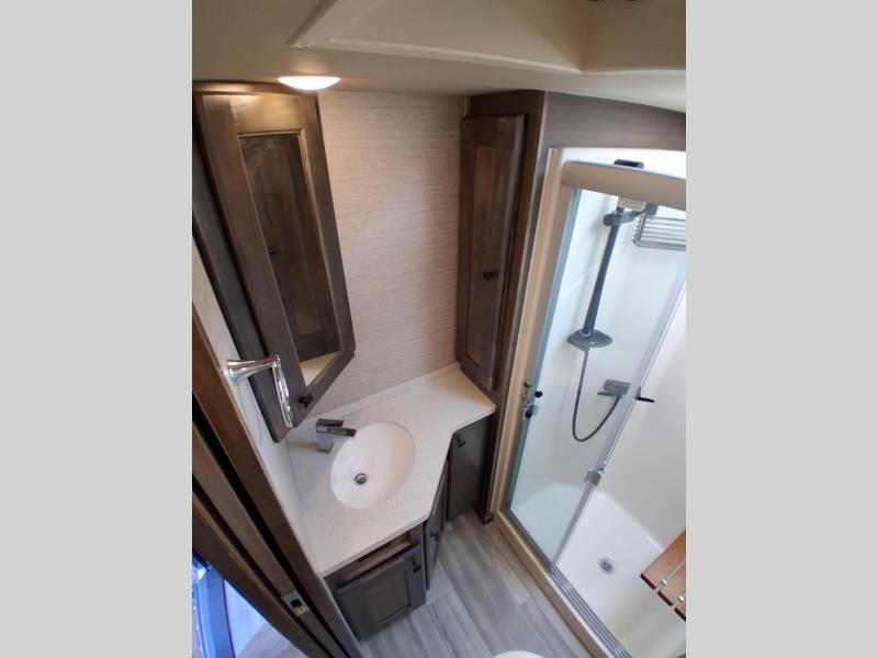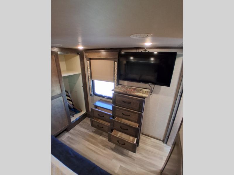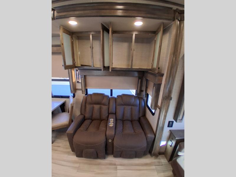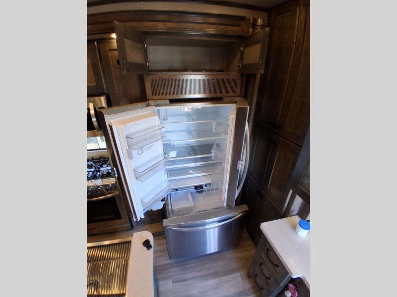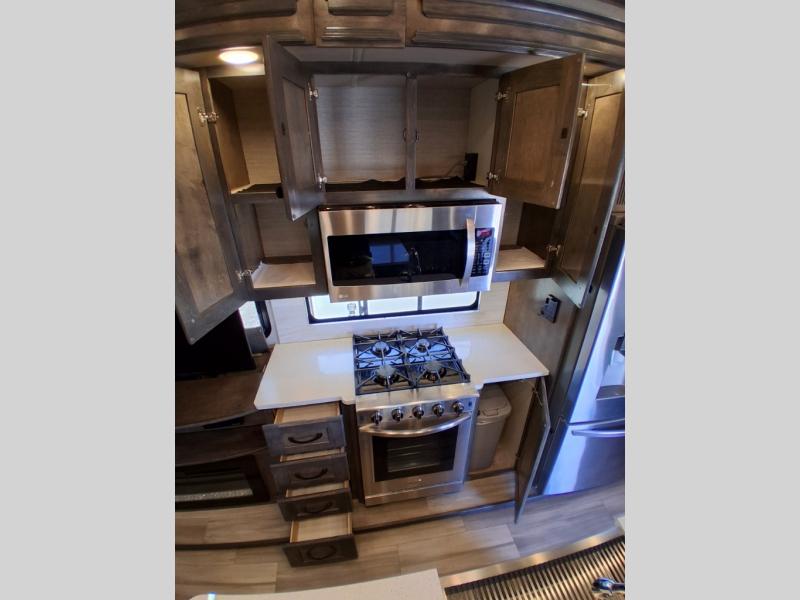 Enjoy luxury at every turn in this Vilano model. The dual opposing slides in the main living area provide space to relax comfortably on the sofa bed or theater sofa seats, and there is a 40" fireplace with a 50" Smart TV for a warm, cozy feel. The chef will love cooking in the kitchen with its stainless steel convection microwave and a stainless steel Insignia oven, plus there is a large pantry and a residential refrigerator to store food for weeks. The front private bedroom will feel just like home with its slide out king bed and residential hardwood headboard, hardwood dresser, and a full-sized wardrobe with motion sensing lighting!