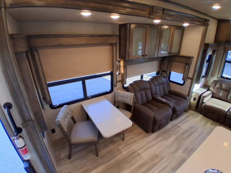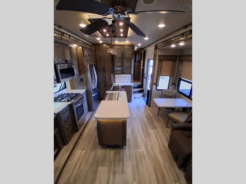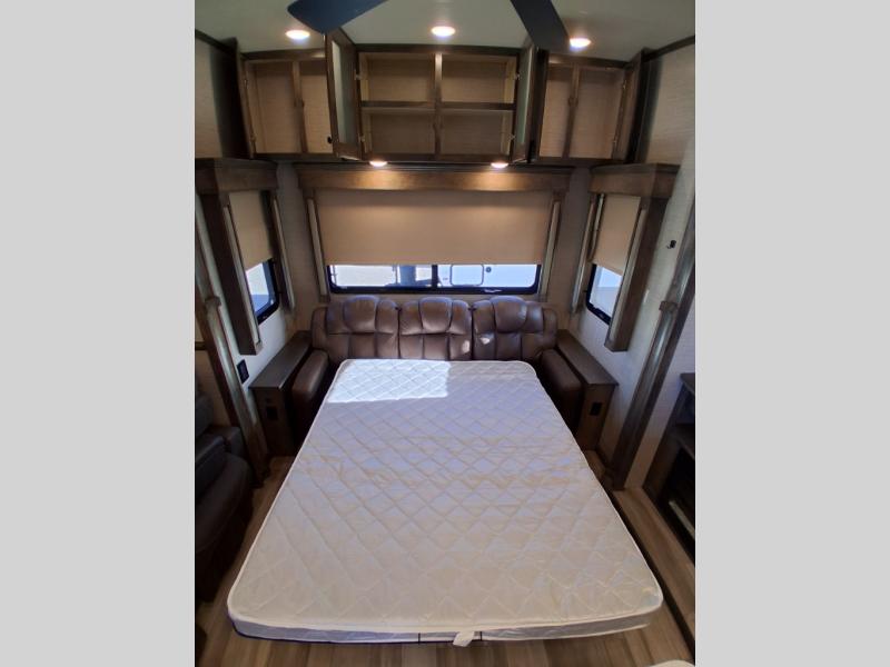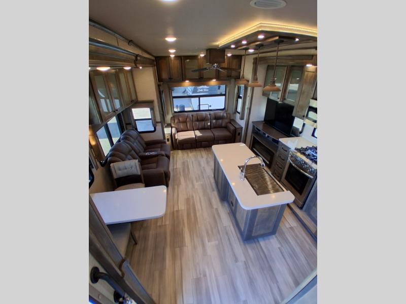 With any Vilano fifth wheel by VanLeigh will you enjoy all the comforts from home with you wherever you go. You can rely on the quality construction materials, such as one-piece sidewalls, laminated slide box end walls, and tubular aluminum upper support walls. Some of the convenient features you are sure to love are the Spyder multiplex wiring system with a digital homescreen, the Whisper Quiet A/C system, and the heated wet bay to manage all things "water" in your fifth wheel. These models include recessed LED ceiling lighting throughout, stainless steel appliances, and solid hardwood cabinetry that will make it feel more like a custom-built home. The central vacuum system is sure to come in handy when it's time to clean up, and each model is prewired for solar panels and back-up camera to make parking easier than ever.