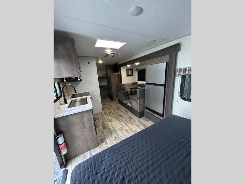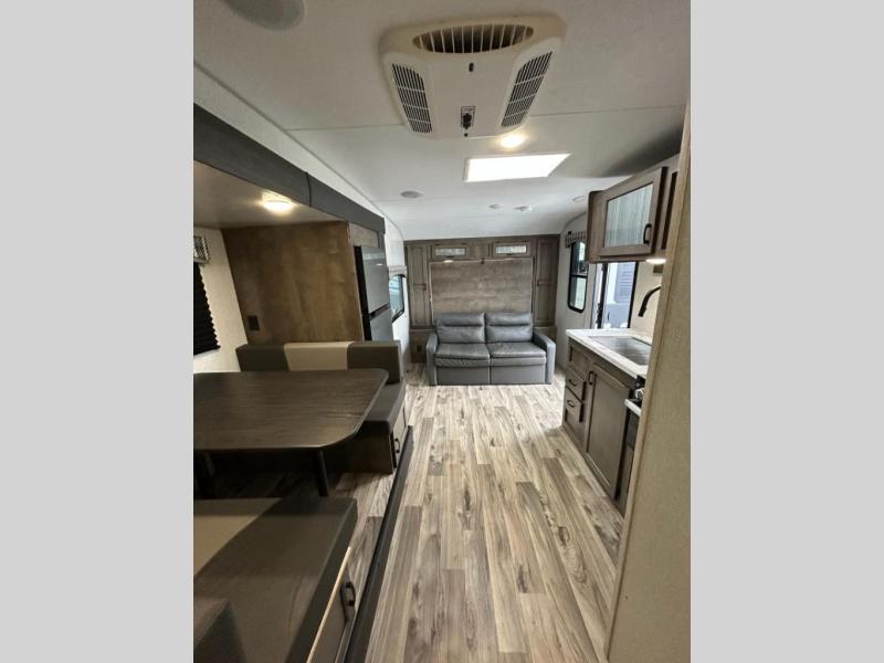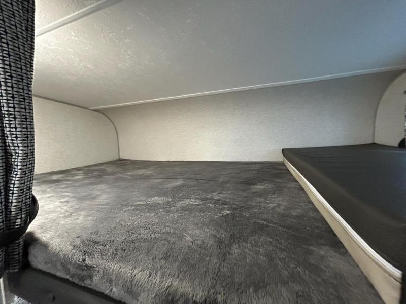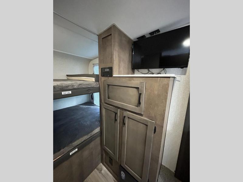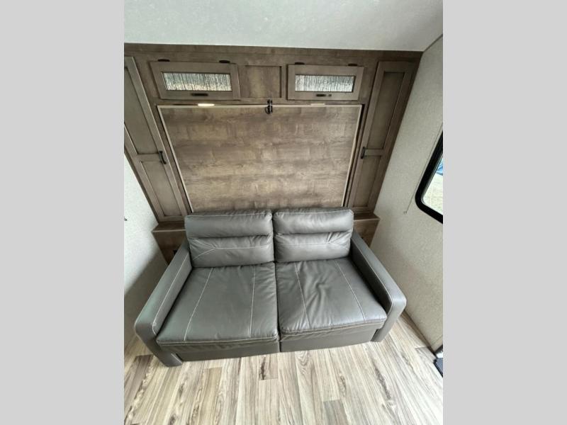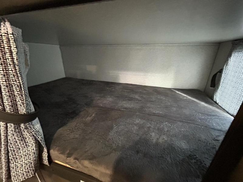 You and your larger group of eight can sleep comfortably in this travel trailer thanks to the Murphy bed up front, the double-size bunks in the rear and the 65" x 48" booth dinette! As the owner you will have the Murphy bed with StorMore bedside nightstands with a 110V outlet and USB charging to keep your phone ready for whatever is next, and the sofa provides a living area up front once the bed is put up into the wall. Your kids or guests will have 48" x 88" bunks and a wardrobe to place their things on the opposite side of the trailer. The cook can make warm meals in the kitchen or outside on the campfire café, and then choose to dine inside at the booth dinette or outside under the 14' power awning after grabbing your camping chairs from the exterior pass-through storage with motion-activated light.