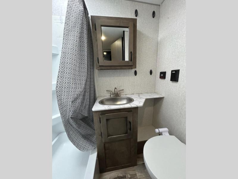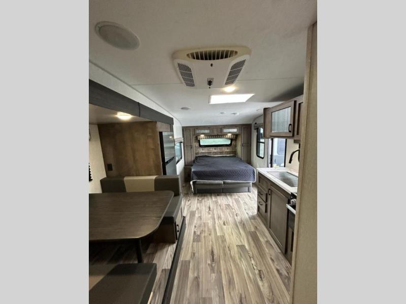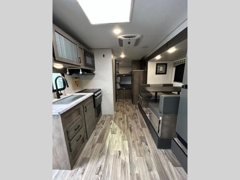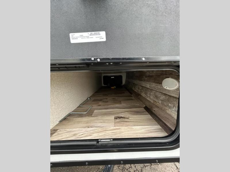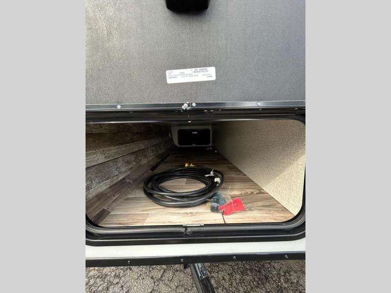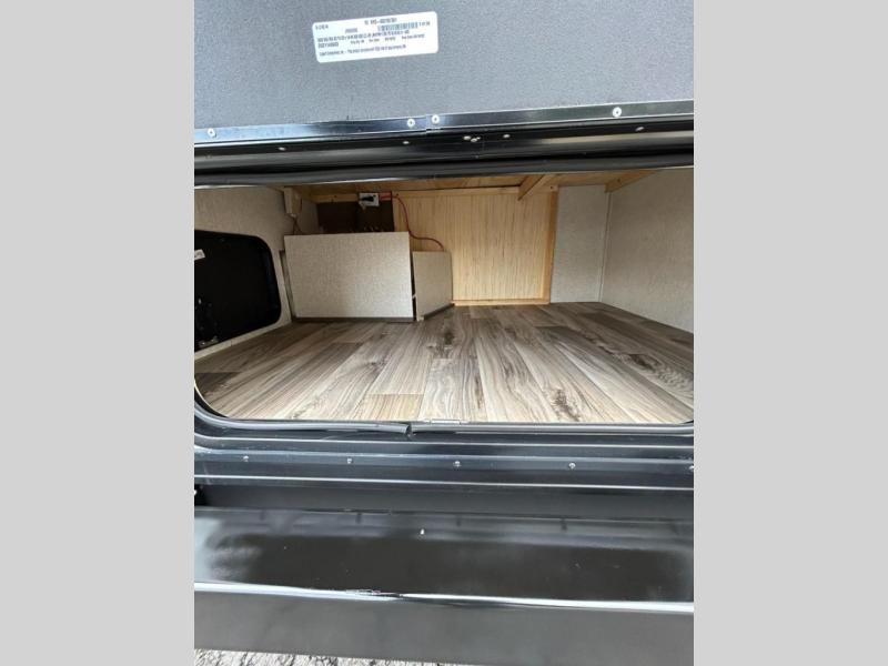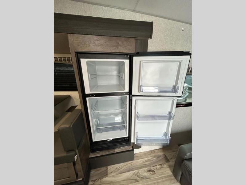 You and your larger group of eight can sleep comfortably in this travel trailer thanks to the Murphy bed up front, the double-size bunks in the rear and the 65" x 48" booth dinette! As the owner you will have the Murphy bed with StorMore bedside nightstands with a 110V outlet and USB charging to keep your phone ready for whatever is next, and the sofa provides a living area up front once the bed is put up into the wall. Your kids or guests will have 48" x 88" bunks and a wardrobe to place their things on the opposite side of the trailer. The cook can make warm meals in the kitchen or outside on the campfire café, and then choose to dine inside at the booth dinette or outside under the 14' power awning after grabbing your camping chairs from the exterior pass-through storage with motion-activated light.