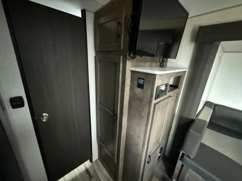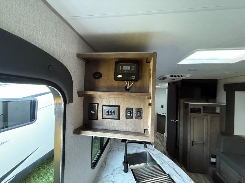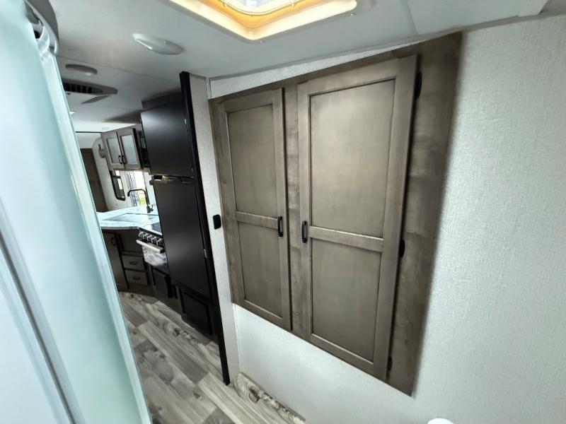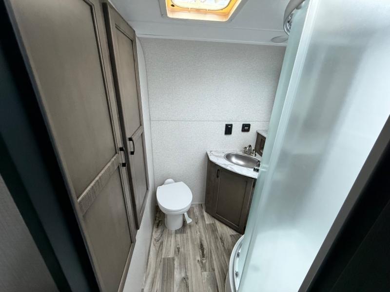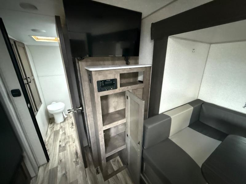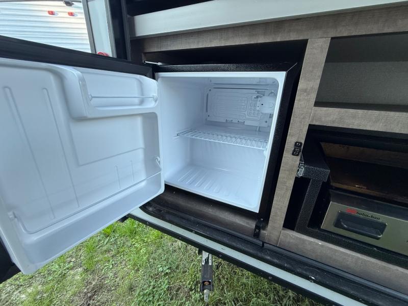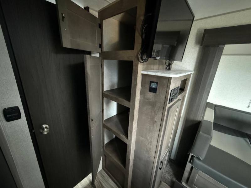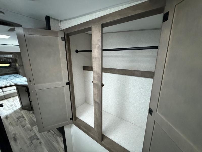 A cook will love this trailer with the choice to make meals inside with full amenities including an 8 cu. ft. refrigerator and a pantry, or outside while using the campfire cafe which offers a griddle and refrigerator, plus counter space to prepare and serve meals. There is sleeping space for four when you utilize the U-shaped dinette slide out that also provides more interior floor space along with the versatile Murphy bed and sofa up front. You will also find a privacy curtain that will section off this area that also features StorMore bedside nightstands with a 110V outlet and USB charging, and two wardrobes.