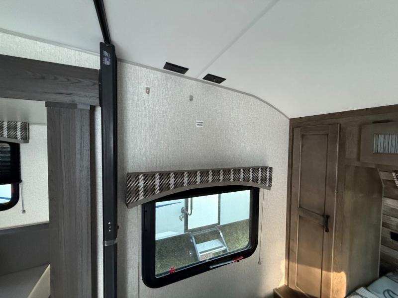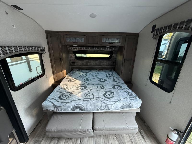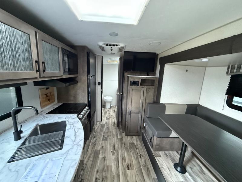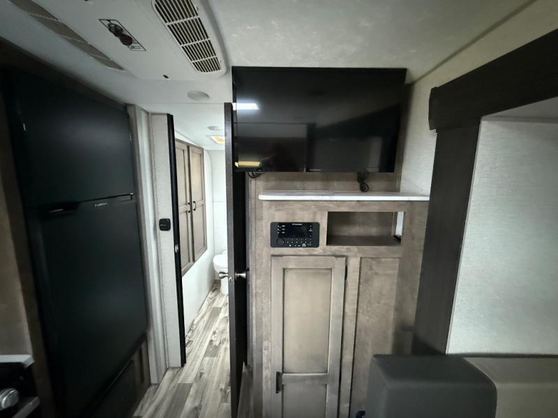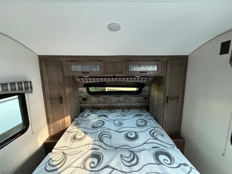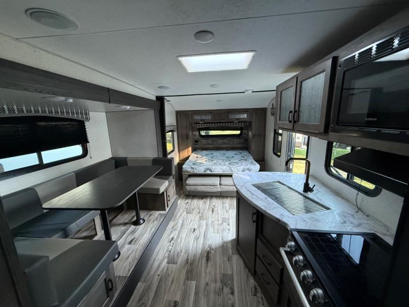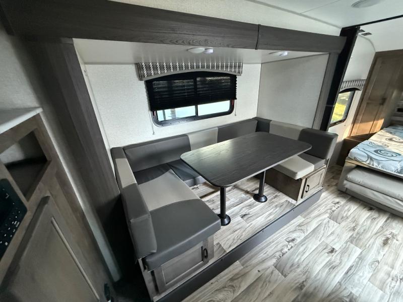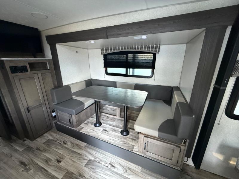 A cook will love this trailer with the choice to make meals inside with full amenities including an 8 cu. ft. refrigerator and a pantry, or outside while using the campfire cafe which offers a griddle and refrigerator, plus counter space to prepare and serve meals. There is sleeping space for four when you utilize the U-shaped dinette slide out that also provides more interior floor space along with the versatile Murphy bed and sofa up front. You will also find a privacy curtain that will section off this area that also features StorMore bedside nightstands with a 110V outlet and USB charging, and two wardrobes.