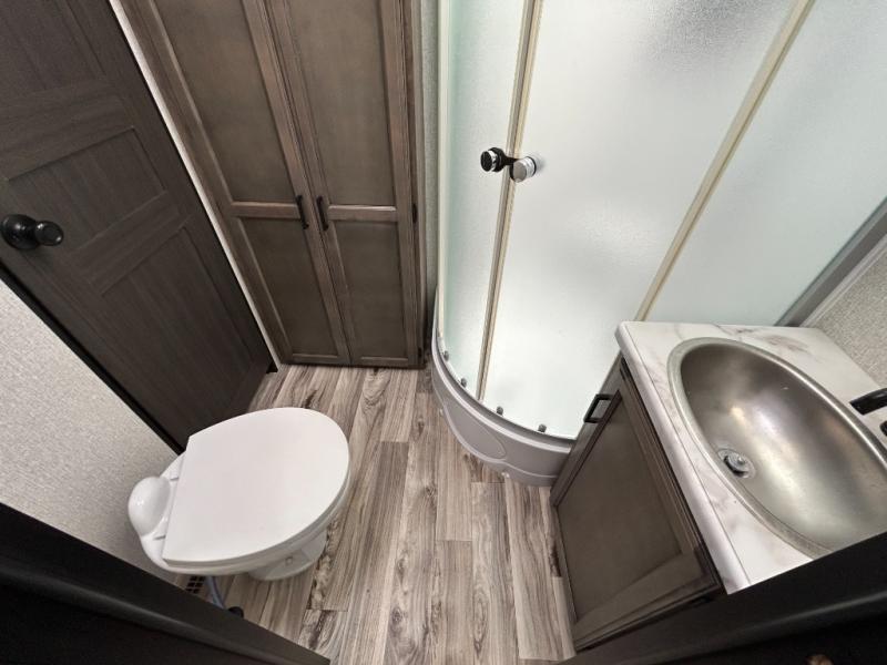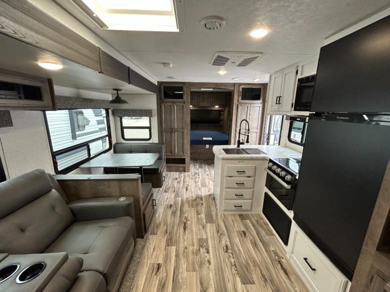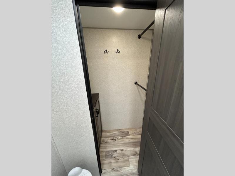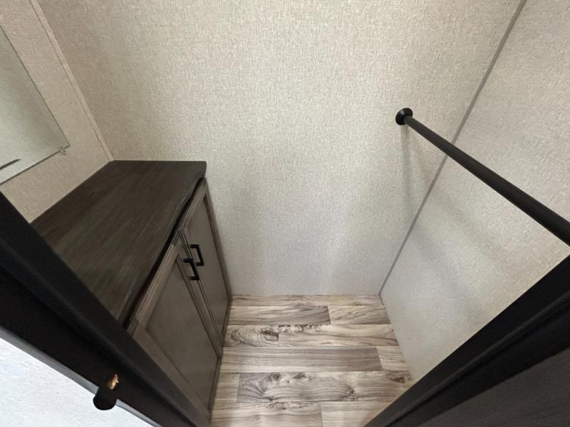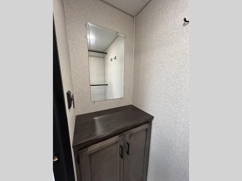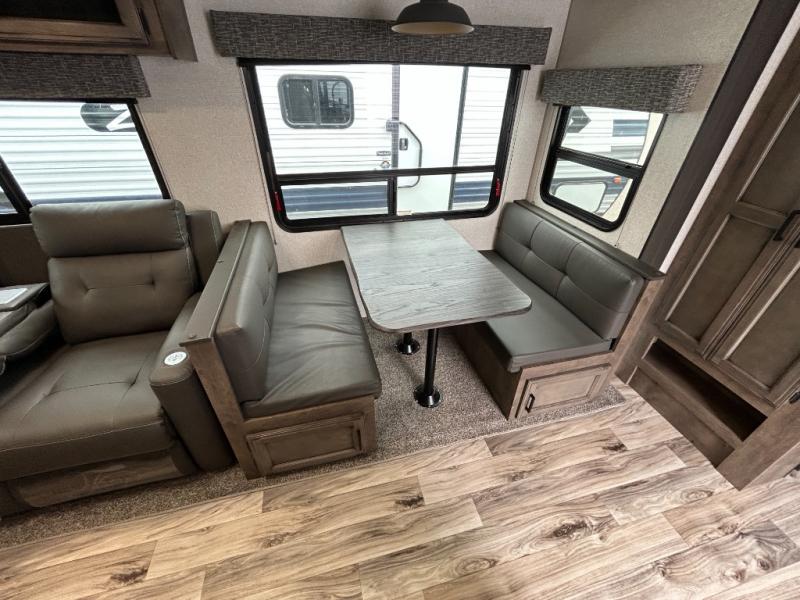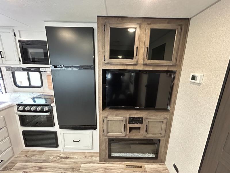 You will find plenty of conveniences both inside and out with this travel trailer! Starting with the outside campfire café which has a refrigerator, a sink, and a griddle, and a pass-through storage area with slam latch baggage doors to keep your gear in place. The entertainment center not only has a 5,000 BTU frameless fireplace and a 40" TV on a swing arm, but also a hidden storage area for games and movies. After a fun day outdoors, you can clean up in the full rear bathroom with 34" radius shower, and if you choose to add the optional washer and dryer to the prepped area, you can easily have clean clothes throughout your entire trip. There is also a dresser with a mirror to help you look your best, a 70" sofa for an afternoon nap, and a 42" booth dinette for meals, games, and even sleeping!