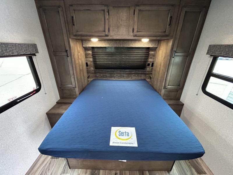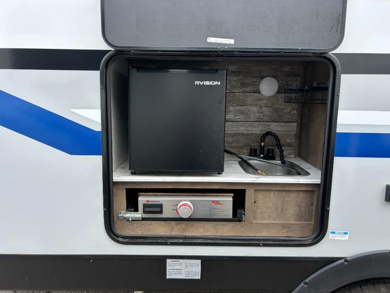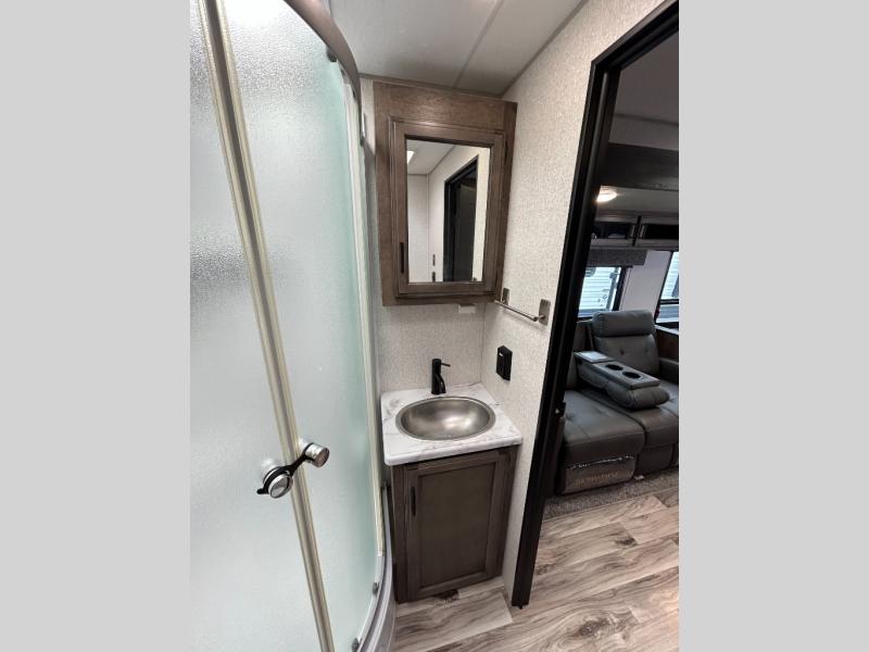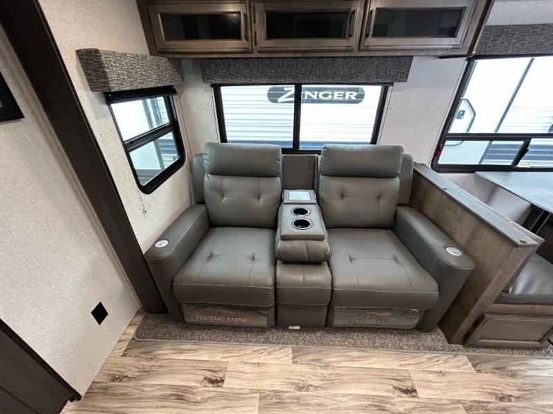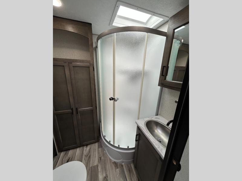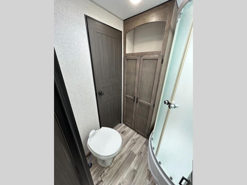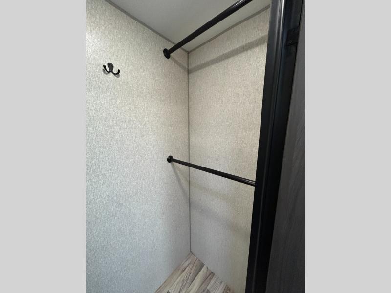 You will find plenty of conveniences both inside and out with this travel trailer! Starting with the outside campfire café which has a refrigerator, a sink, and a griddle, and a pass-through storage area with slam latch baggage doors to keep your gear in place. The entertainment center not only has a 5,000 BTU frameless fireplace and a 40" TV on a swing arm, but also a hidden storage area for games and movies. After a fun day outdoors, you can clean up in the full rear bathroom with 34" radius shower, and if you choose to add the optional washer and dryer to the prepped area, you can easily have clean clothes throughout your entire trip. There is also a dresser with a mirror to help you look your best, a 70" sofa for an afternoon nap, and a 42" booth dinette for meals, games, and even sleeping!