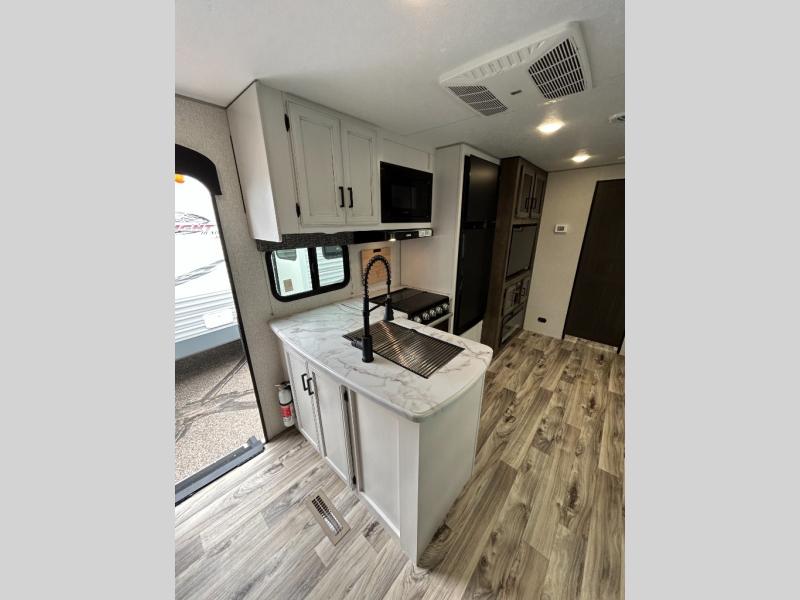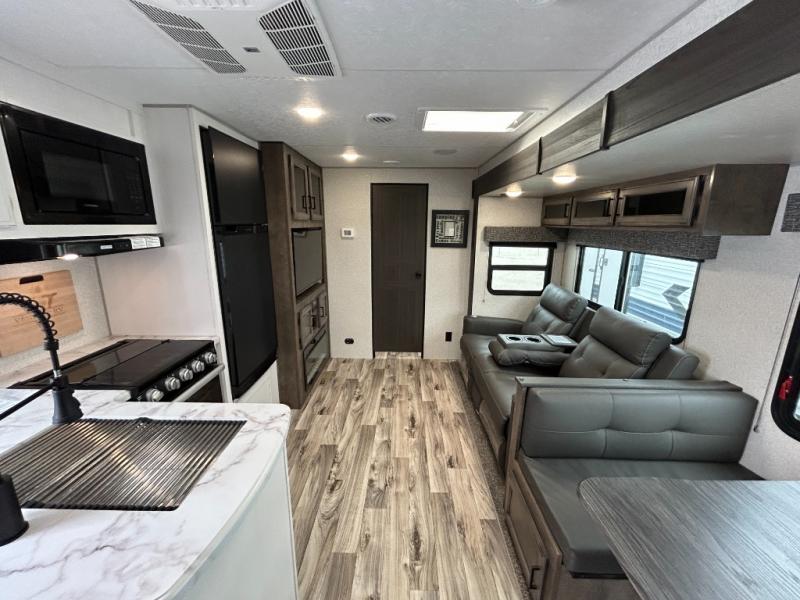 Every Venture RV SportTrek lightweight travel trailer is constructed to offer peace of mind and the comforts home! Their purposeful residential kitchens are packed with handy features like a recessed gas cooktop with glass cover for more countertop space, a sink cover to drain food and dishes which can be rolled out of the way for sink use, and continuous countertops. You will find plenty of storage throughout with unique areas like the under-seat removable storage tubs below the dinette cushions, the oversize, deep heavy-duty pot and pan drawer, and the StorMore nightstands on either side of the bed behind the full-length closets. The magnetic slam-latch baggage doors to the spacious pass-through storage area will hold your outdoor gear in place. They even come with a hot and cold exterior shower and SporTrek's Weather Shield which includes a radiant foil barrier, forced heat, enclosed underbelly, enclosed gate valves, and a reflective PVC roof membrane. What more could you want, come find your favorite model today!