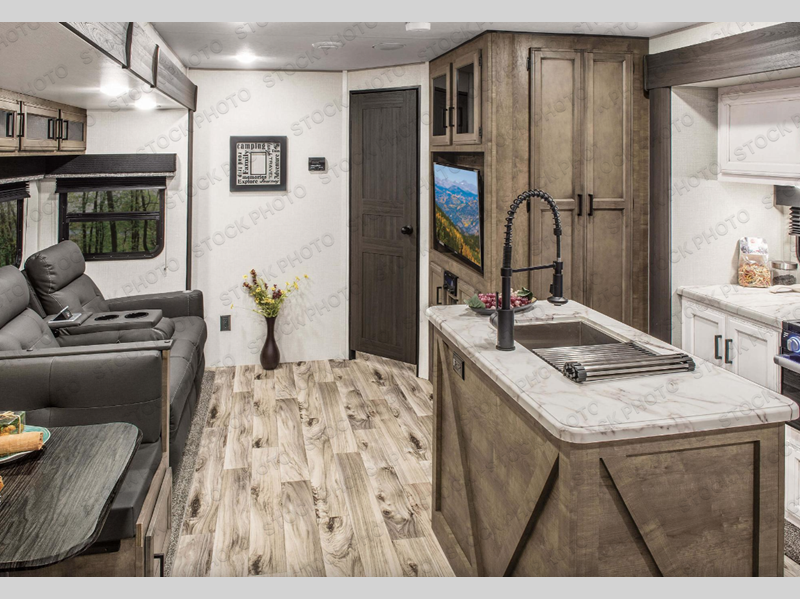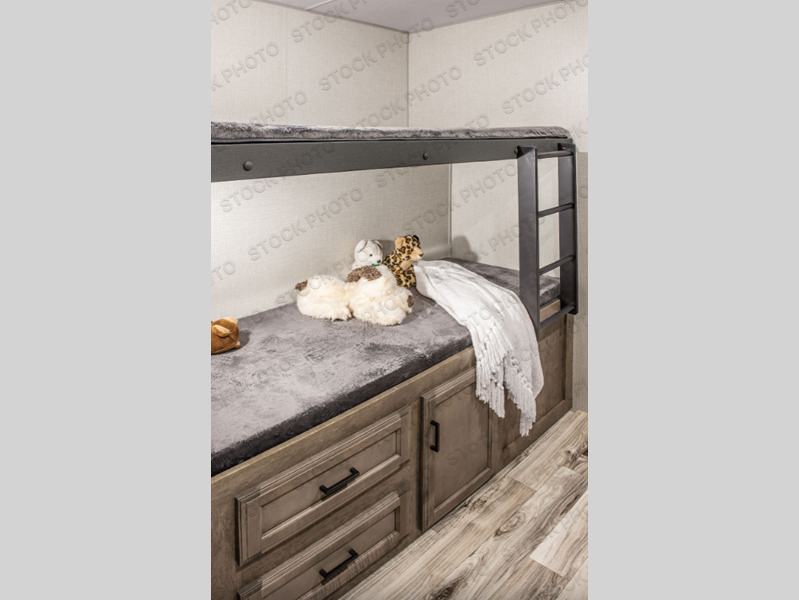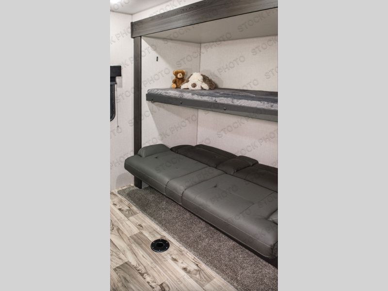 Stay protected rain or shine with the two 10' legless awnings with wind sensor on this travel trailer! Some other exterior features you will enjoy include a campfire café with a 38" TV to watch the big game while you grill steaks on the griddle, and the pass-through storage area with slam latch baggage doors will keep your gear in place. Inside there is a rear private bunkhouse with a closet, a 32" x 70" flip-up bunk above a 70" sofa with a table, and a 28" x 70" bunk above a 40" x 70" bottom bunk. The living area has a sofa across from an entertainment center with a 5,000 BTU frameless fireplace and a 40" TV with a swing arm so others can watch it from the 42" booth dinette. The dual entry bathroom has a 34" radius shower to freshen up in, and is easy to access, especially those staying in the front private bedroom!