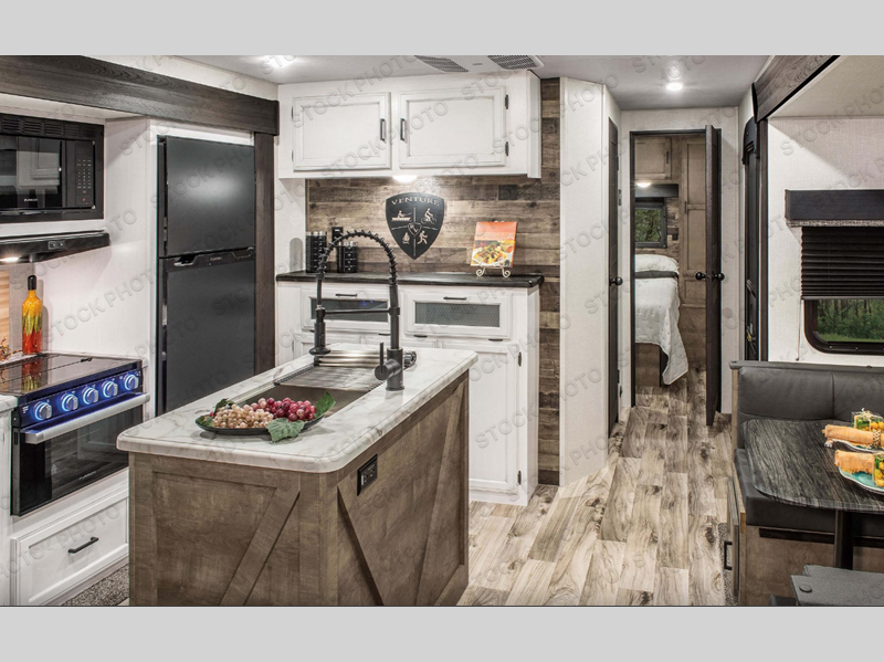 Every Venture RV SportTrek lightweight travel trailer is constructed to offer peace of mind and the comforts home! Their purposeful residential kitchens are packed with handy features like a recessed gas cooktop with glass cover for more countertop space, a sink cover to drain food and dishes which can be rolled out of the way for sink use, and continuous countertops. You will find plenty of storage throughout with unique areas like the under-seat removable storage tubs below the dinette cushions, the oversize, deep heavy-duty pot and pan drawer, and the StorMore nightstands on either side of the bed behind the full-length closets. The magnetic slam-latch baggage doors to the spacious pass-through storage area will hold your outdoor gear in place. They even come with a hot and cold exterior shower and SporTrek's Weather Shield which includes a radiant foil barrier, forced heat, enclosed underbelly, enclosed gate valves, and a reflective PVC roof membrane. What more could you want, come find your favorite model today!