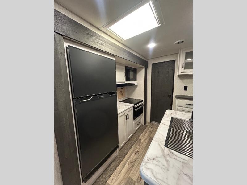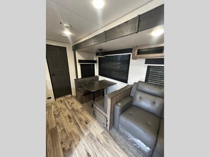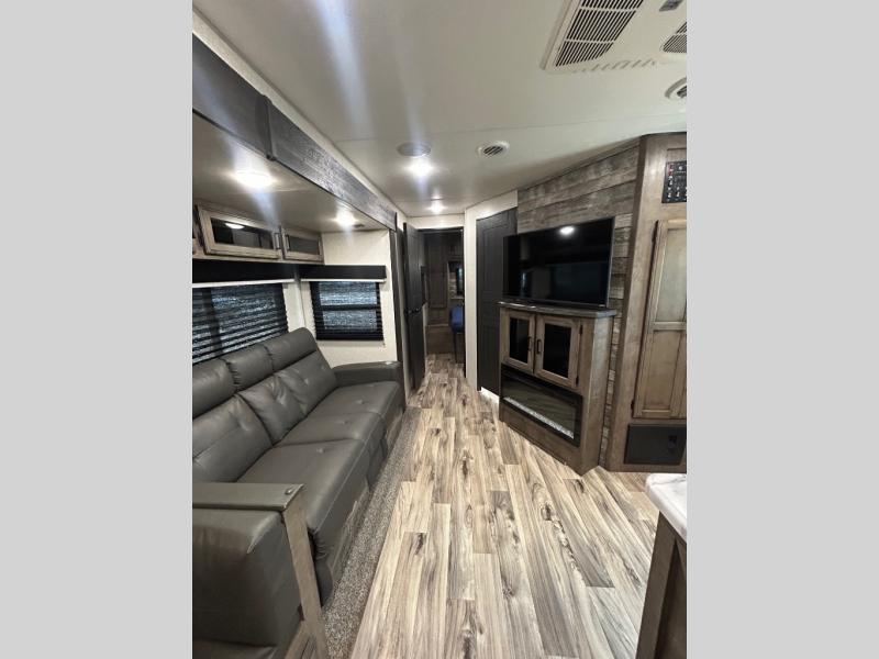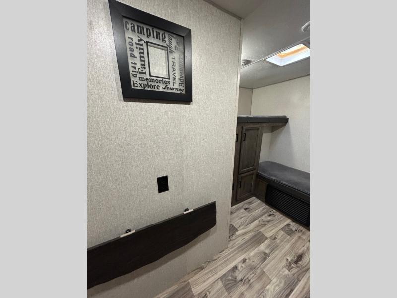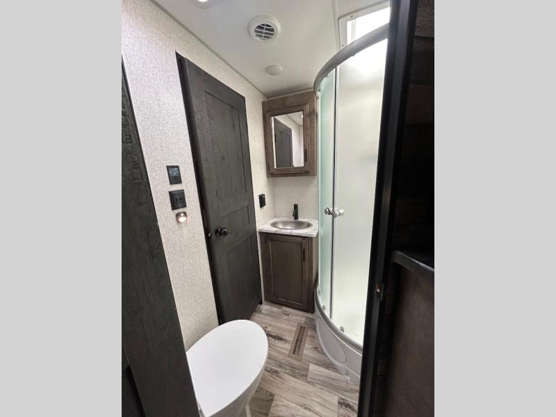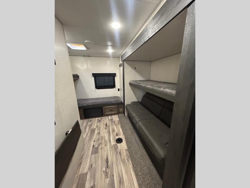 It's a clean decision with a bath and a half to take this travel trailer on your next camping trip! The rear private bunkhouse is decked out with a 28" x 70" bunk bed, a 32" x 70" top bunk, a 28" x 73" flip-up bunk above a 72" sofa with table, and a flip desk to do some school work. The half bathroom has an entrance/exit door so you can get back to cooking at the outdoor campfire café which has two 3 cu. ft. refrigerators, a sink, a griddle, and storage. Your clean up will be a breeze thanks to the kitchen island with a large sink and dish drying sink cover. If you need extra sleeping space then simply convert the 42" grand dinette and 70" sofa into sleeping spaces. Those staying in the front private bedroom will enjoy a good night's rest on the sleep tight queen bed and have the convenience of accessing the dual entry bathroom!