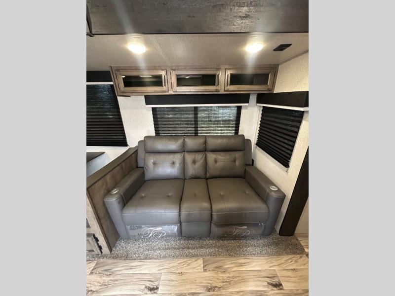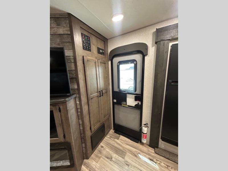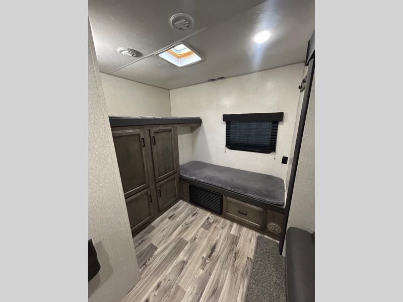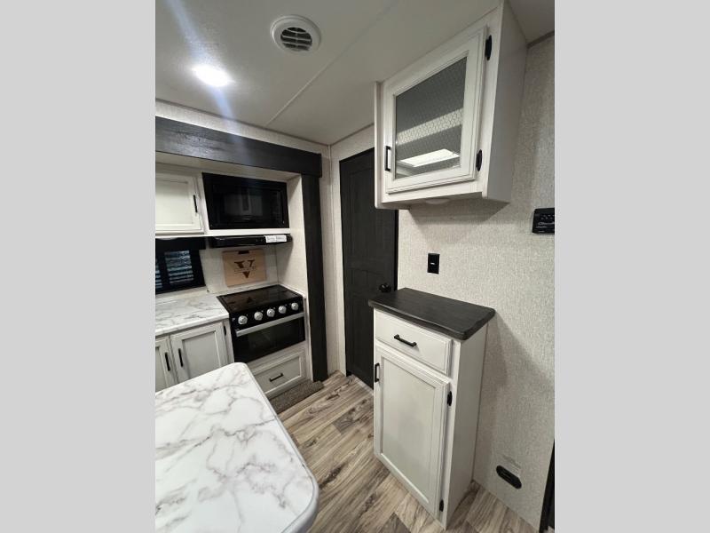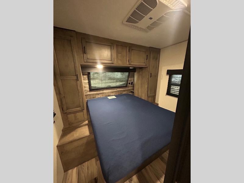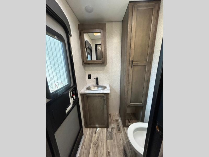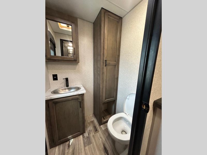 It's a clean decision with a bath and a half to take this travel trailer on your next camping trip! The rear private bunkhouse is decked out with a 28" x 70" bunk bed, a 32" x 70" top bunk, a 28" x 73" flip-up bunk above a 72" sofa with table, and a flip desk to do some school work. The half bathroom has an entrance/exit door so you can get back to cooking at the outdoor campfire café which has two 3 cu. ft. refrigerators, a sink, a griddle, and storage. Your clean up will be a breeze thanks to the kitchen island with a large sink and dish drying sink cover. If you need extra sleeping space then simply convert the 42" grand dinette and 70" sofa into sleeping spaces. Those staying in the front private bedroom will enjoy a good night's rest on the sleep tight queen bed and have the convenience of accessing the dual entry bathroom!