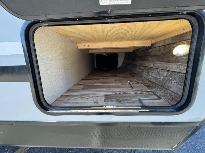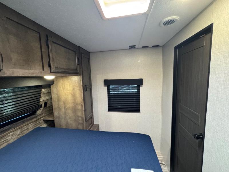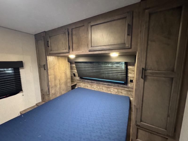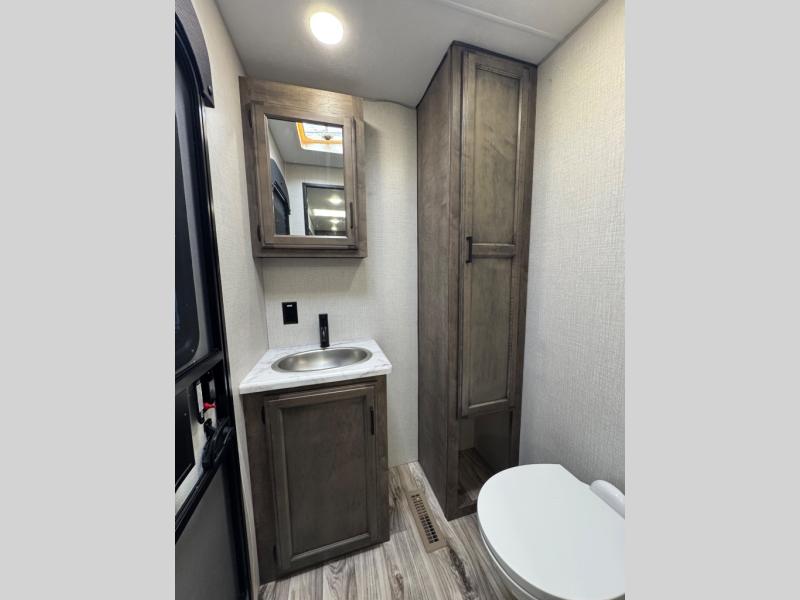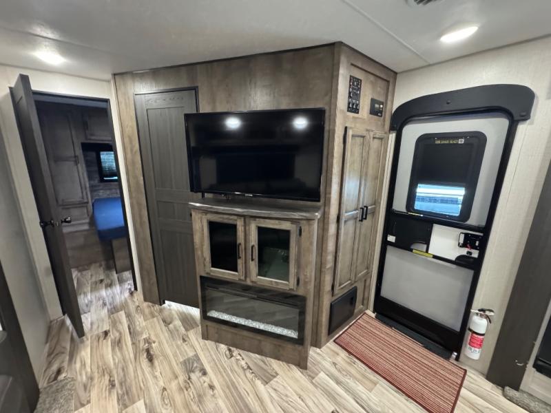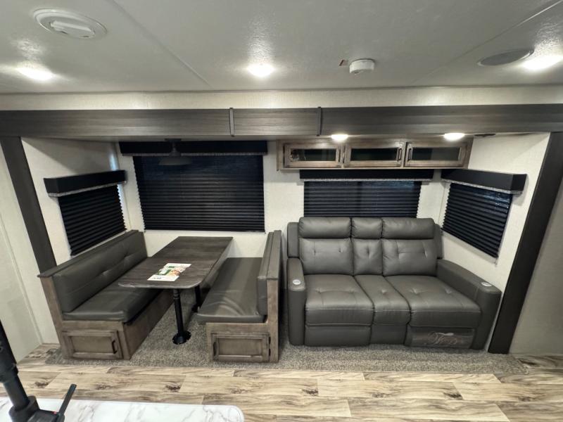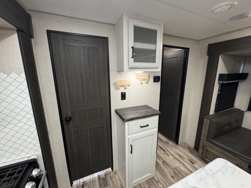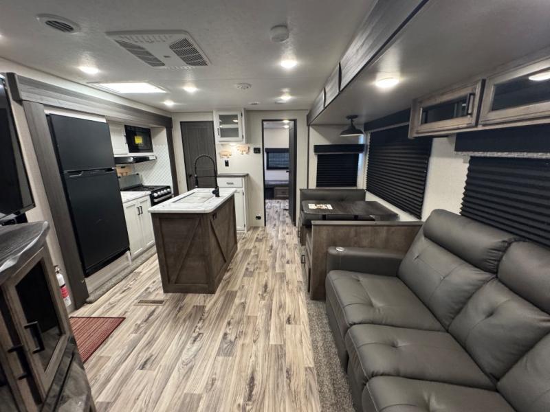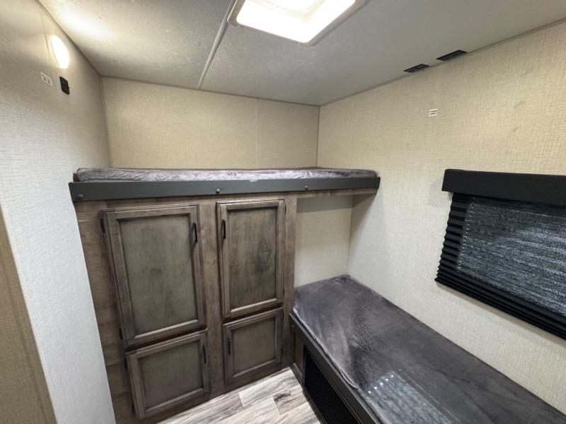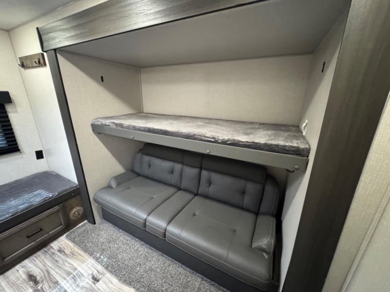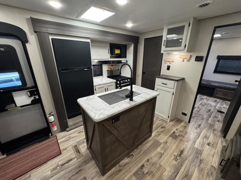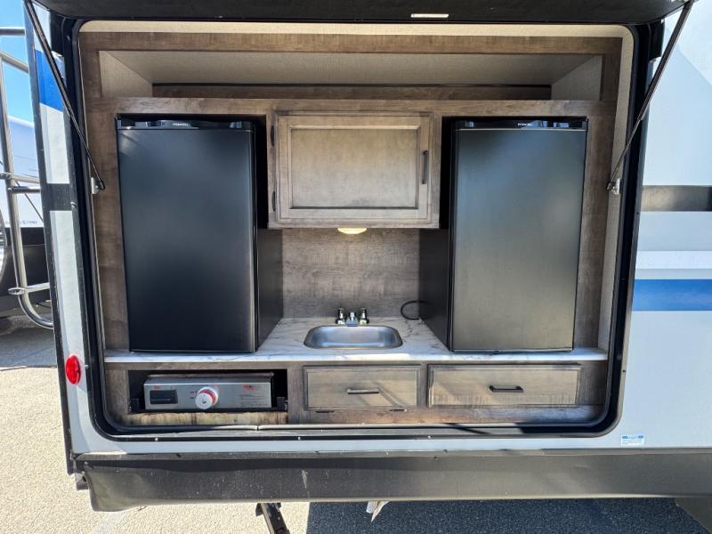 It's a clean decision with a bath and a half to take this travel trailer on your next camping trip! The rear private bunkhouse is decked out with a 28" x 70" bunk bed, a 32" x 70" top bunk, a 28" x 73" flip-up bunk above a 72" sofa with table, and a flip desk to do some school work. The half bathroom has an entrance/exit door so you can get back to cooking at the outdoor campfire café which has two 3 cu. ft. refrigerators, a sink, a griddle, and storage. Your clean up will be a breeze thanks to the kitchen island with a large sink and dish drying sink cover. If you need extra sleeping space then simply convert the 42" grand dinette and 70" sofa into sleeping spaces. Those staying in the front private bedroom will enjoy a good night's rest on the sleep tight queen bed and have the convenience of accessing the dual entry bathroom!