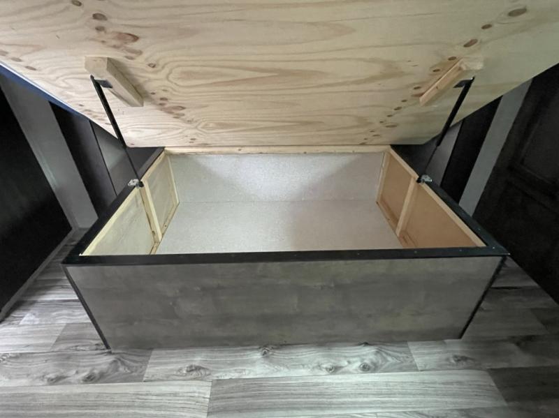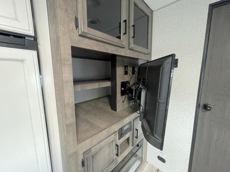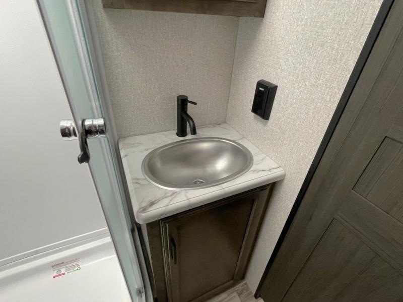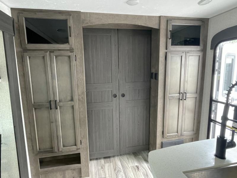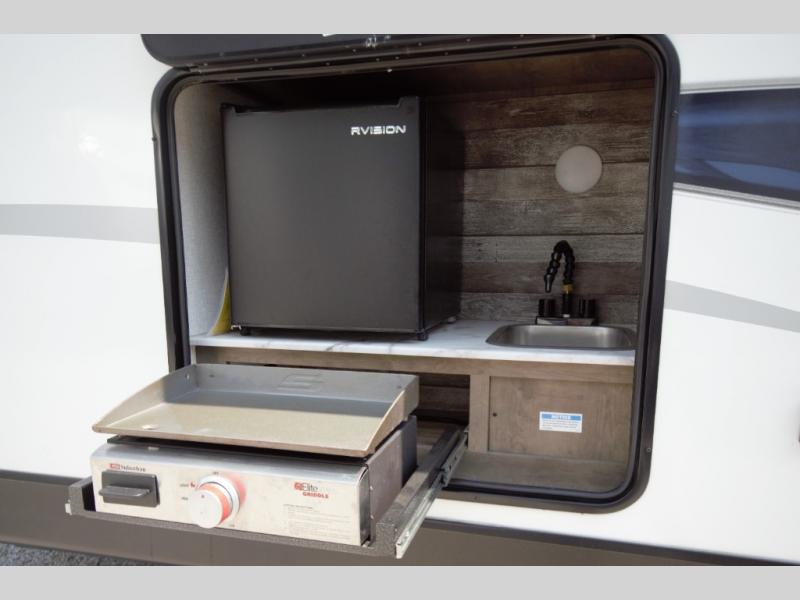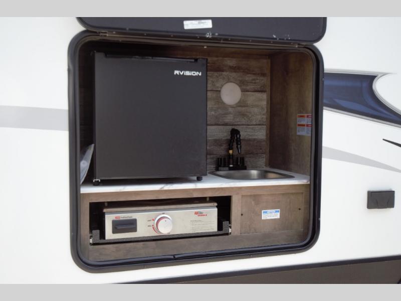 Outside, you will find the Campfire Cafe, an exterior kitchen that lets you cook under the shade of the 20 foot power awning. Enjoy extra convenience with a sink, fridge, and griddle—perfect for morning coffee or evening burgers. The slam latch baggage doors and motion lights in the pass-through storage make packing and unpacking simple and stress free.