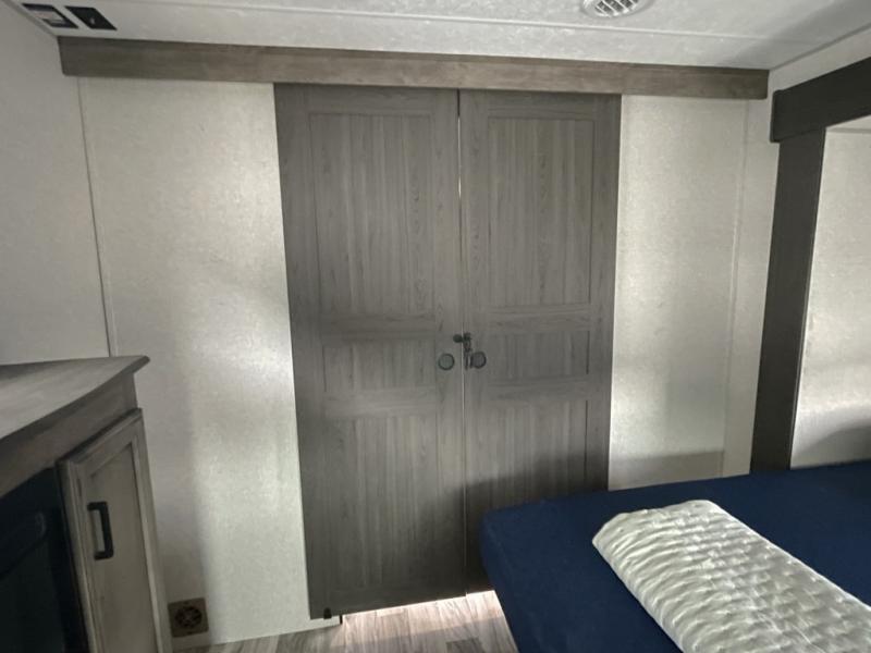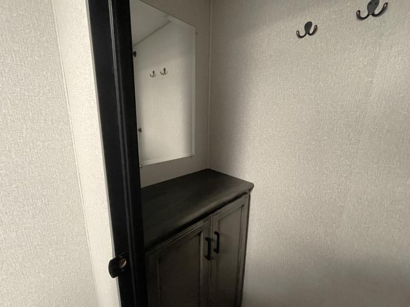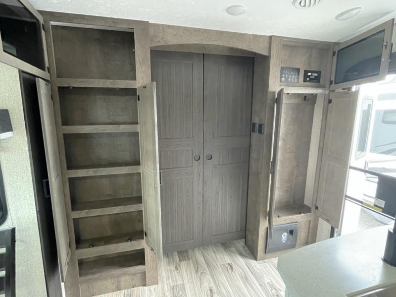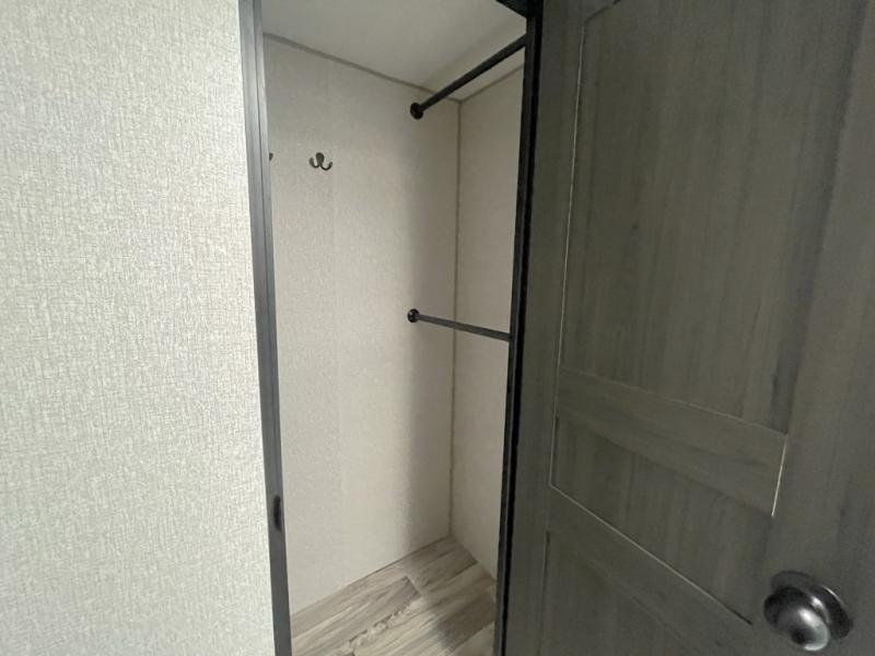 When it is time to unwind, retreat to the front bedroom complete with a king bed, window seat, and a second fireplace with a built-in TV above the dresser. There is even a full-size closet prepped for a washer and dryer, making this the perfect RV for extended trips or full-time living.