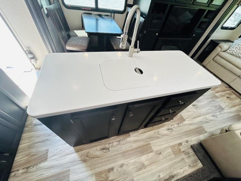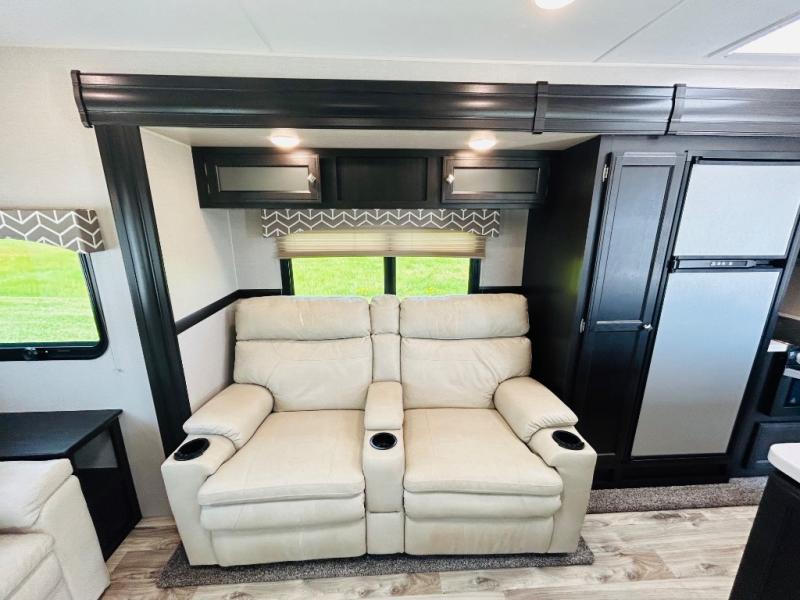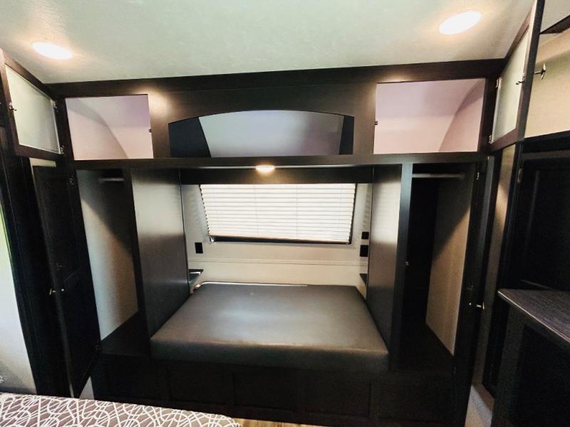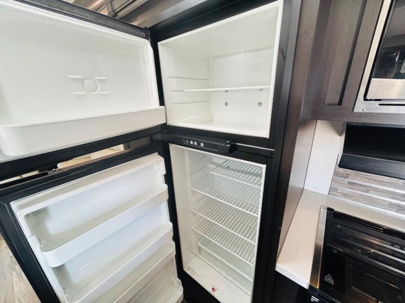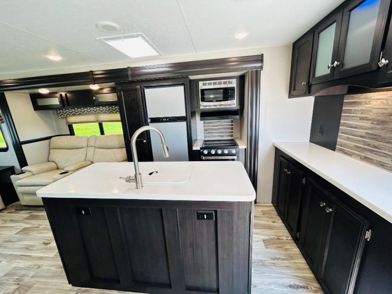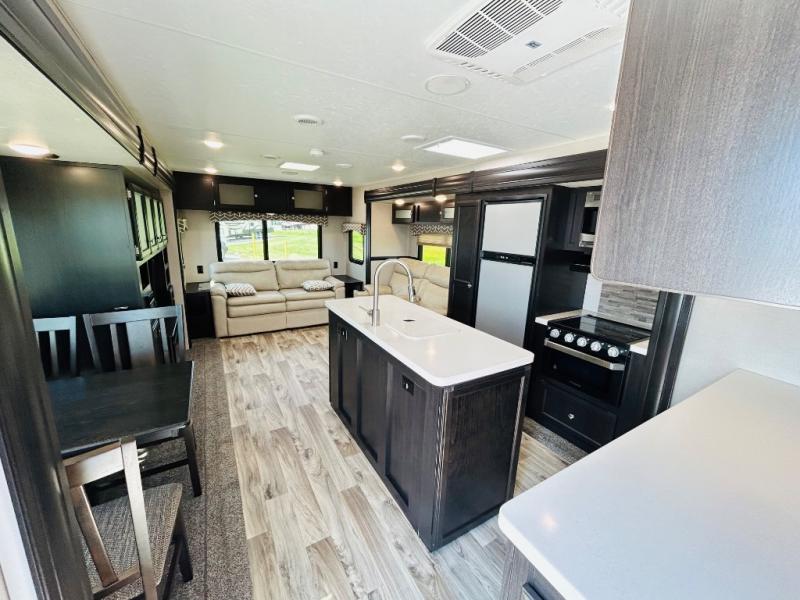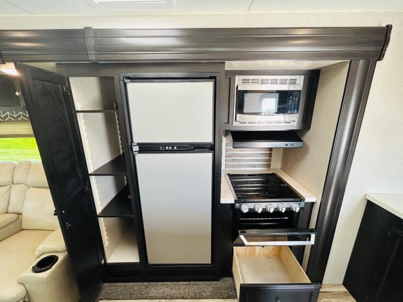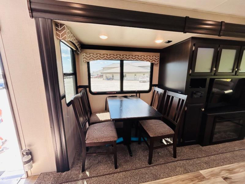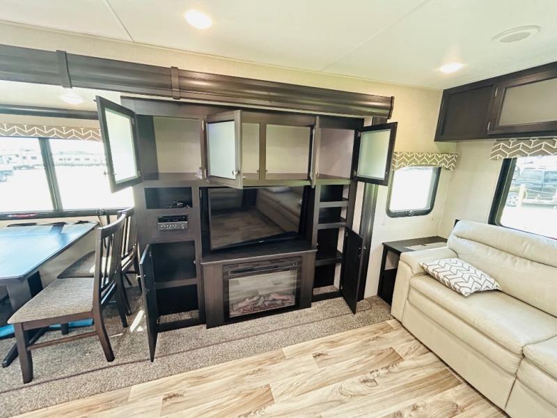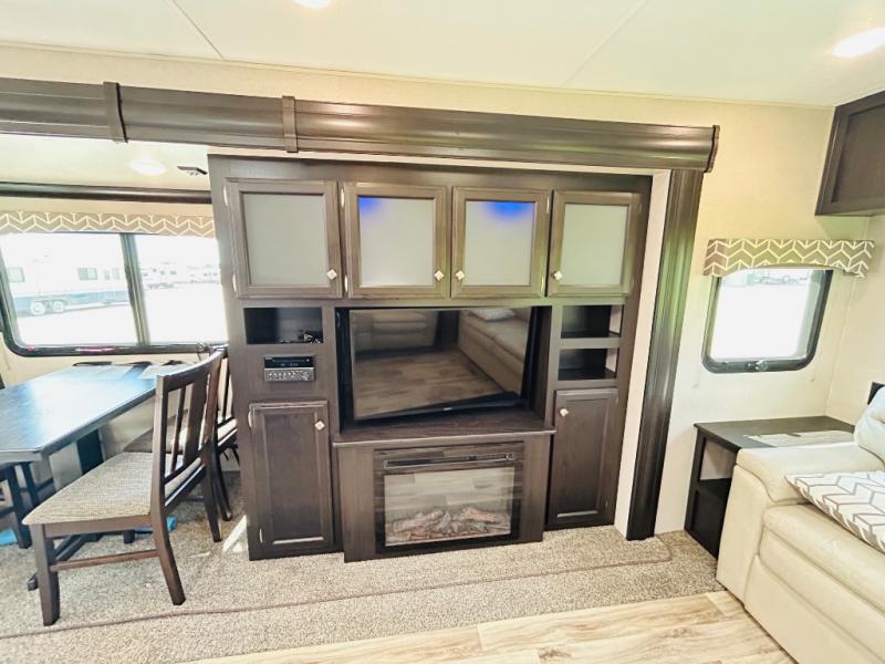 Pack your bags and hitch up this travel trailer for a great weekend camping trip! The front private bedroom has a 70" x 80" sleep tight king bed slide to lay your head at night, a dresser with a 30" frameless fireplace, a window seat with shelves on either side for your books, and a wardrobe that is prepped to add an optional washer and dryer for an extended trip. Freshen up each morning in the full bathroom with the 30" x 36" shower then head to the kitchen to fry up some eggs on the three burner cooktop and pour a cold glass of orange juice stored in the 10 cu. ft. refrigerator. The kitchen island will make your meal prepping easier and the table and chairs offer a comfortable place to enjoy your meals or play card games. You could even cook your meals at the exterior campfire café and set up a table underneath one of the two power awnings!