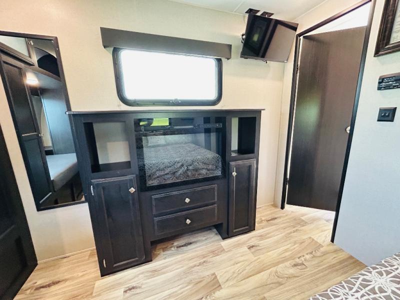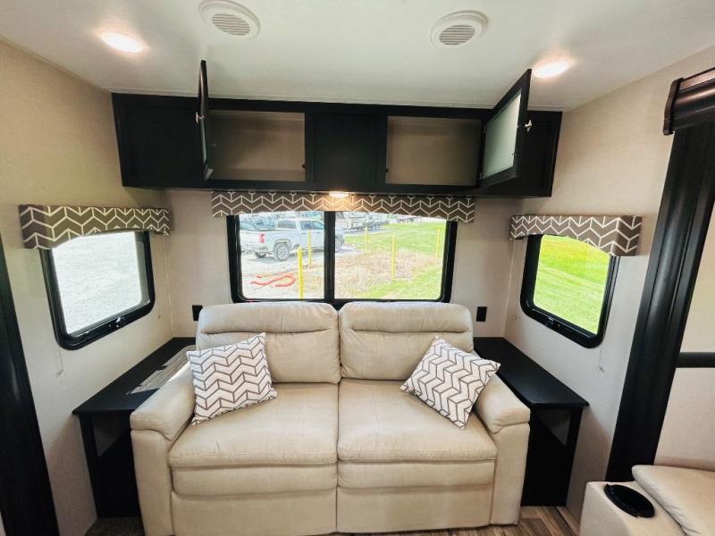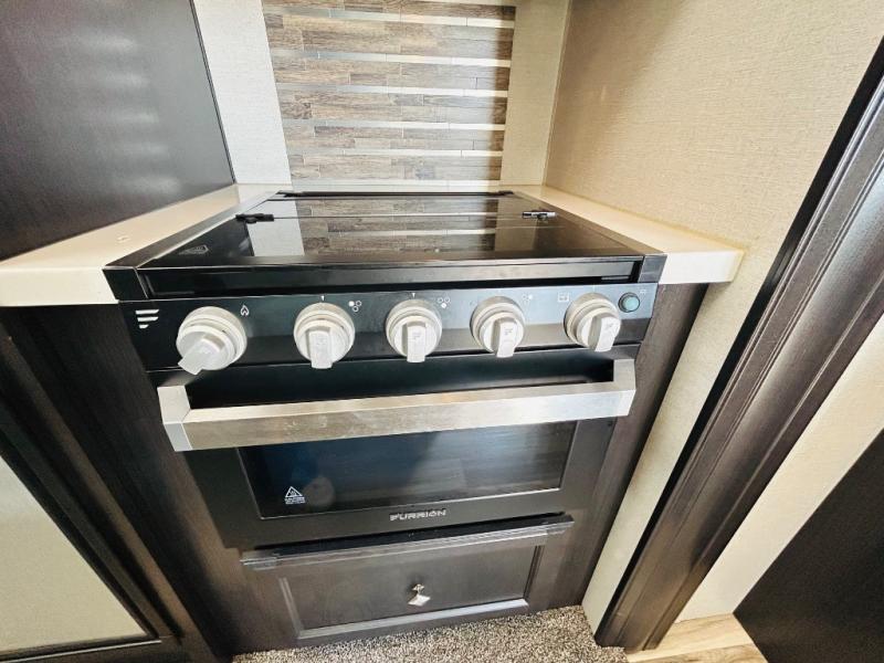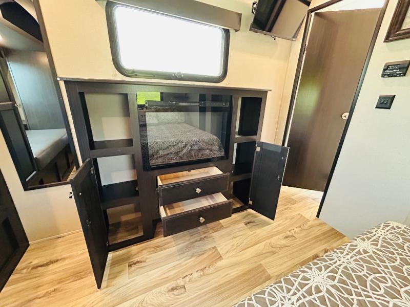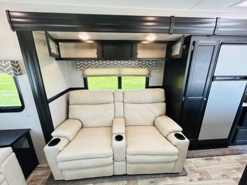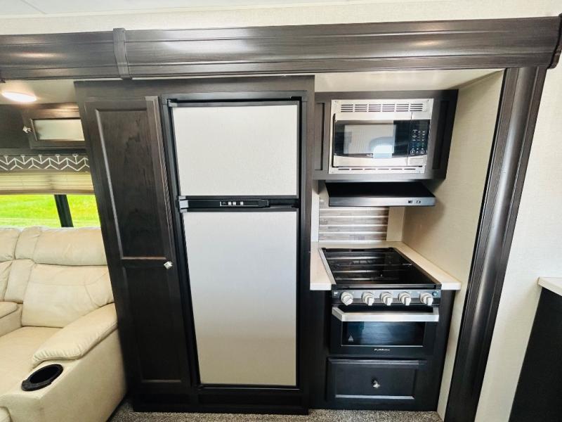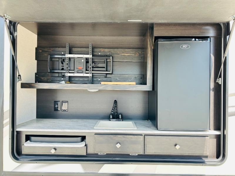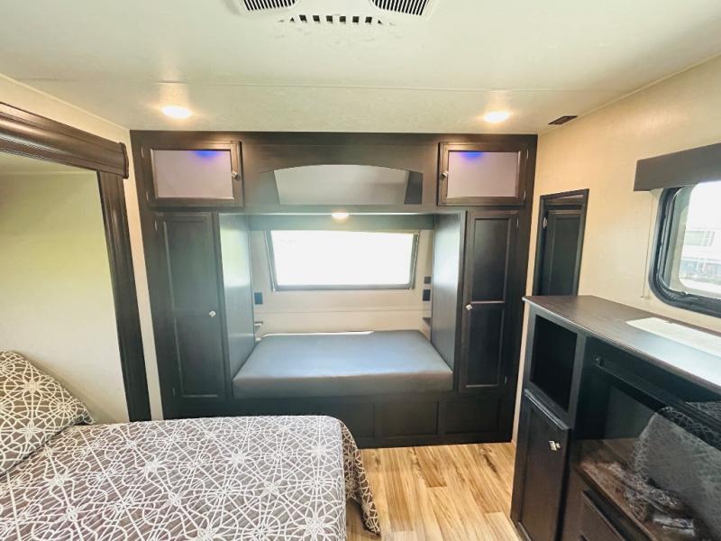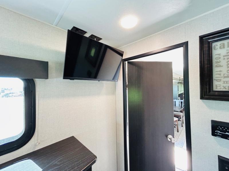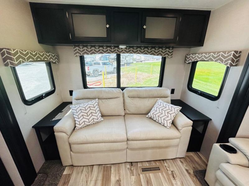 Pack your bags and hitch up this travel trailer for a great weekend camping trip! The front private bedroom has a 70" x 80" sleep tight king bed slide to lay your head at night, a dresser with a 30" frameless fireplace, a window seat with shelves on either side for your books, and a wardrobe that is prepped to add an optional washer and dryer for an extended trip. Freshen up each morning in the full bathroom with the 30" x 36" shower then head to the kitchen to fry up some eggs on the three burner cooktop and pour a cold glass of orange juice stored in the 10 cu. ft. refrigerator. The kitchen island will make your meal prepping easier and the table and chairs offer a comfortable place to enjoy your meals or play card games. You could even cook your meals at the exterior campfire café and set up a table underneath one of the two power awnings!